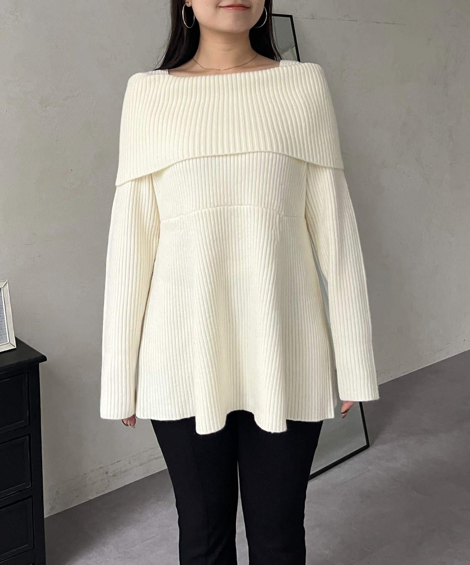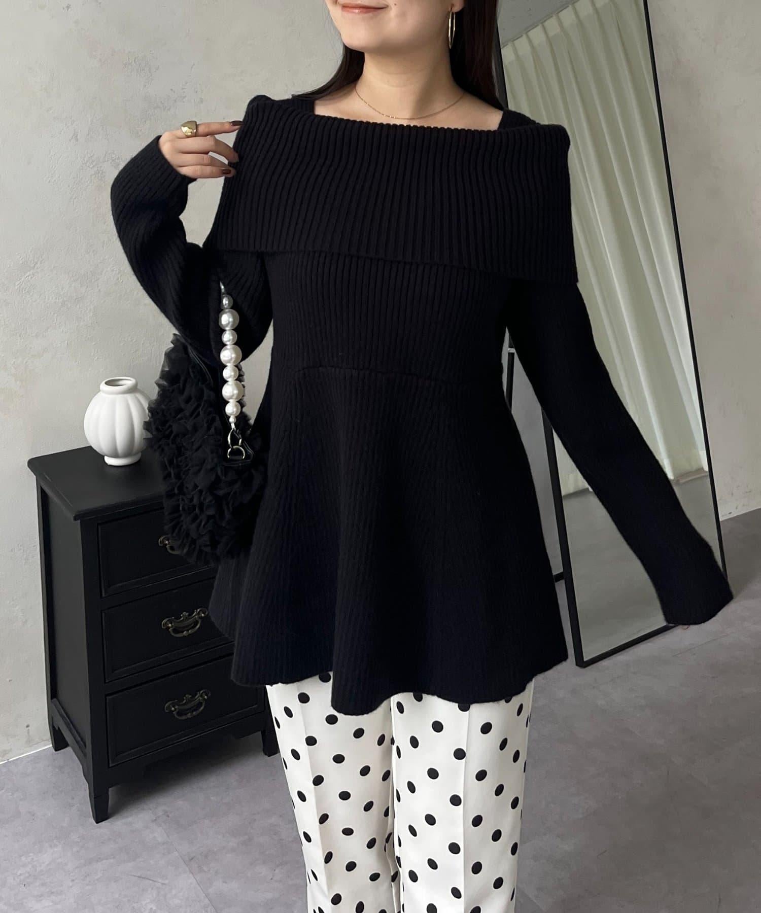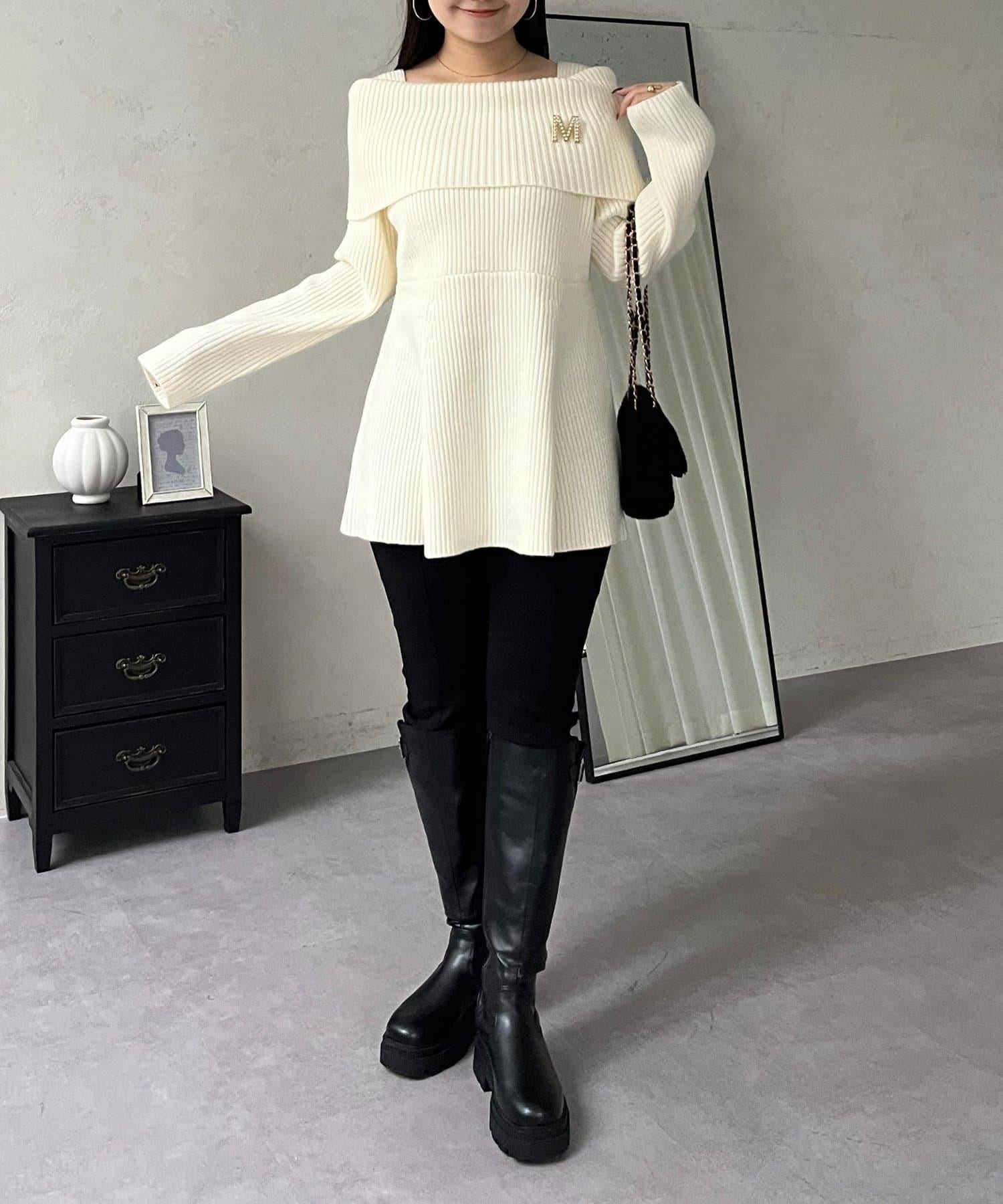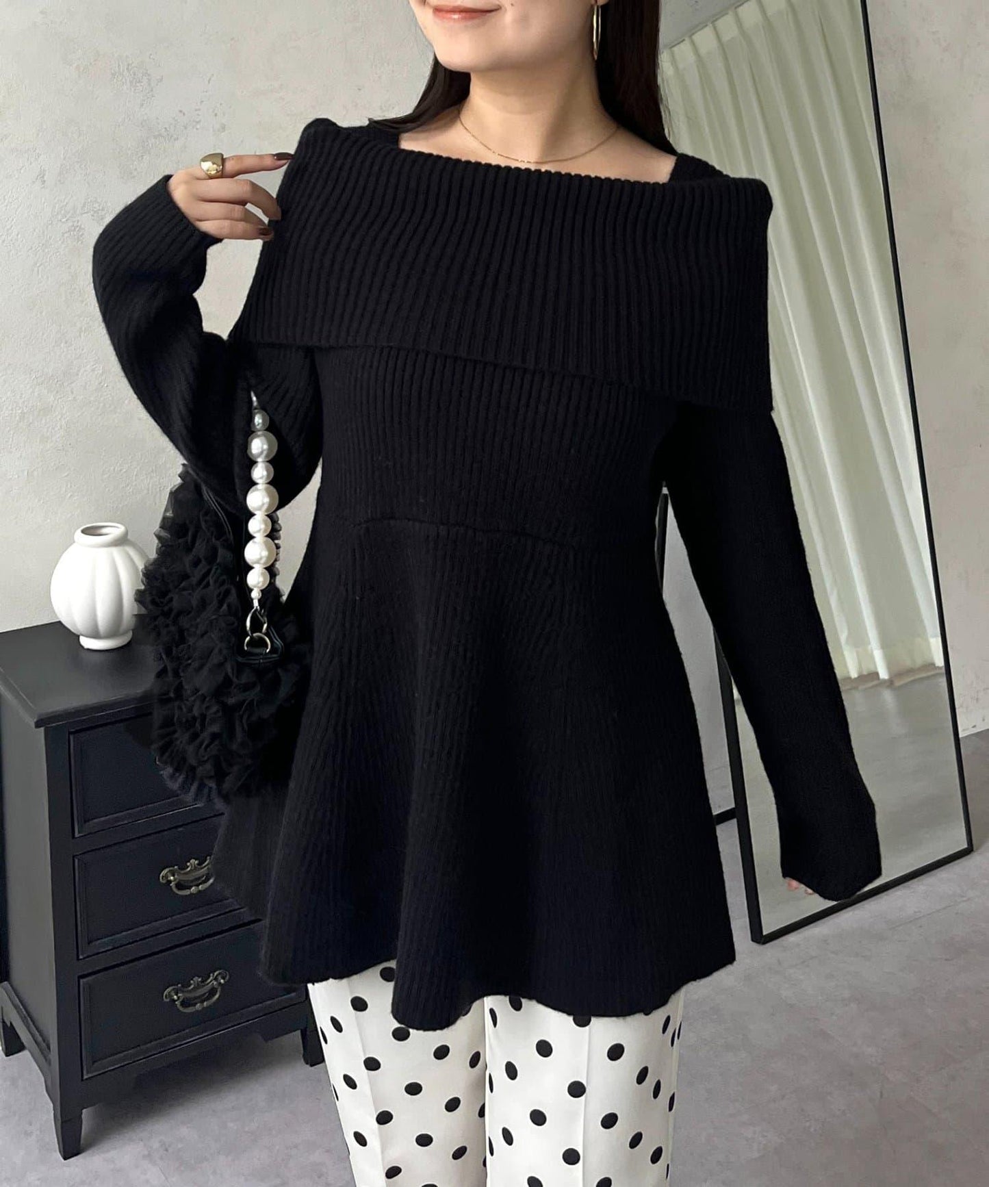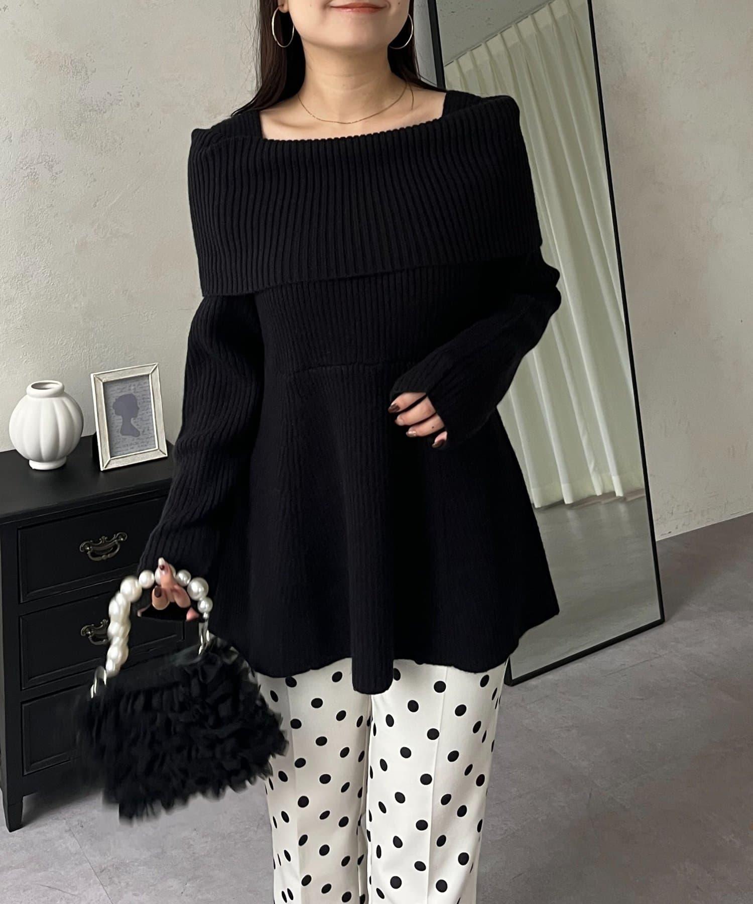 預約商品【防靜電】一字肩荷葉邊針織衫