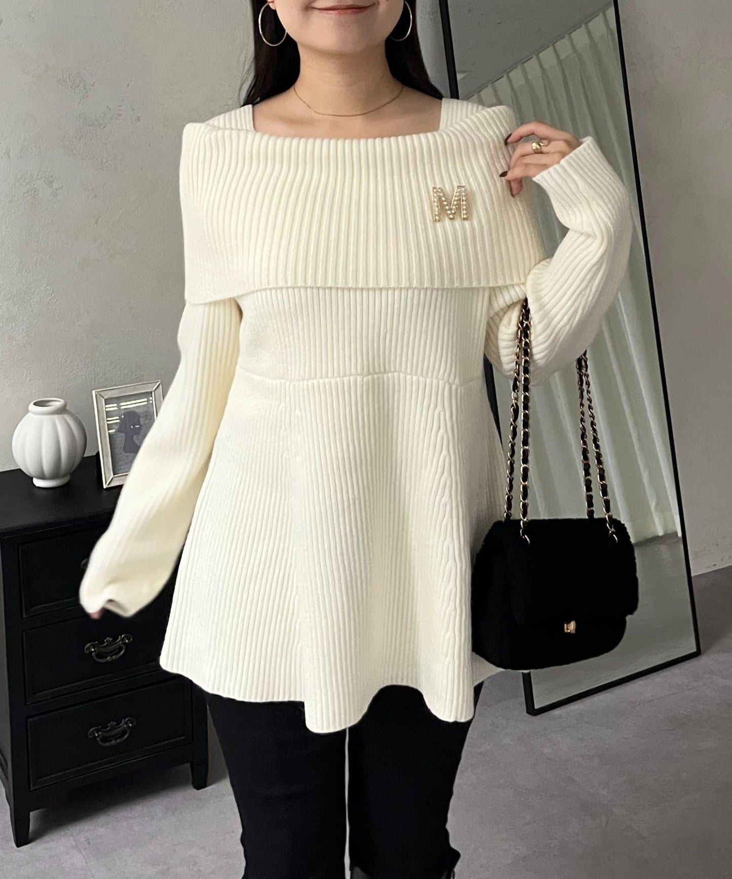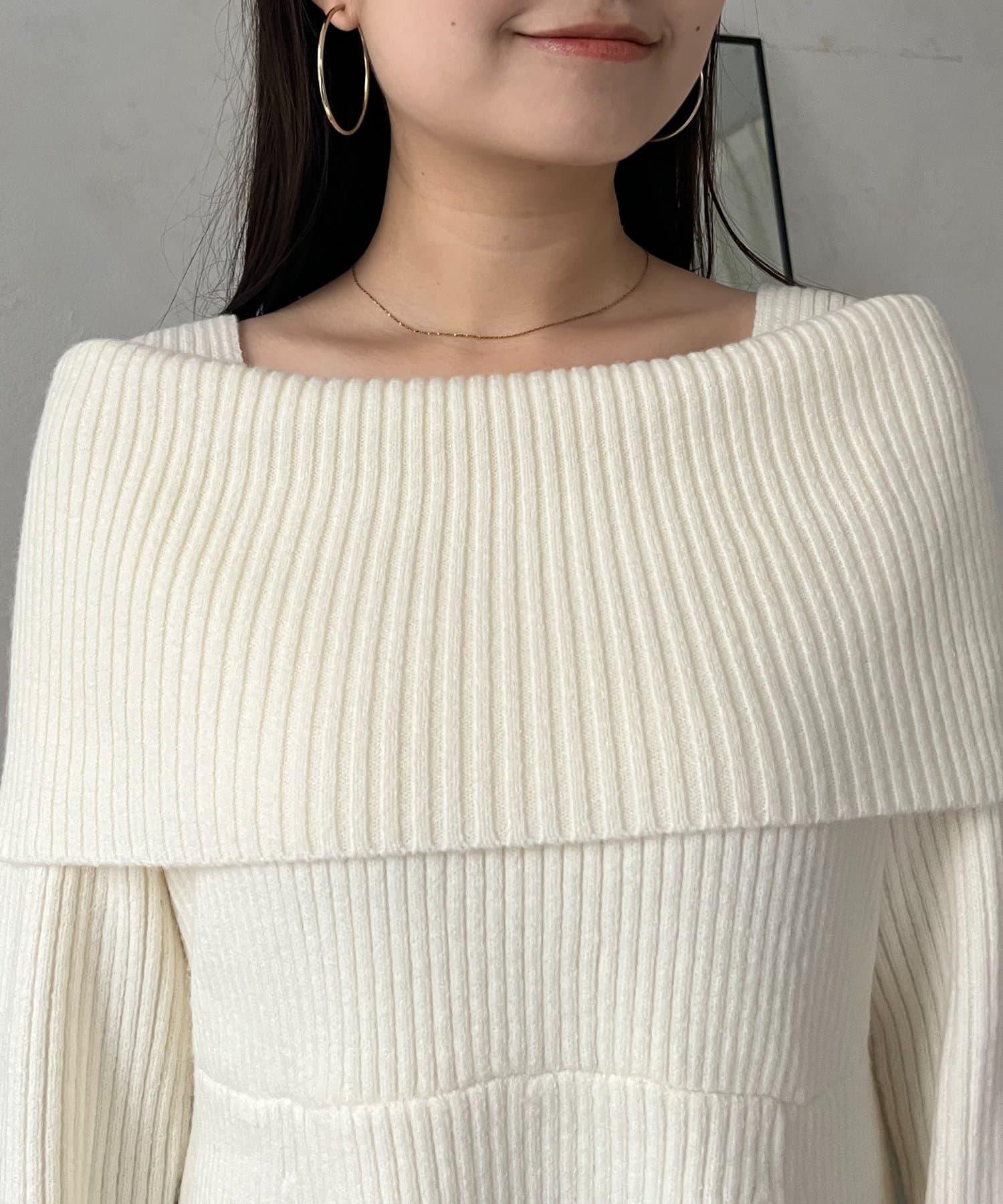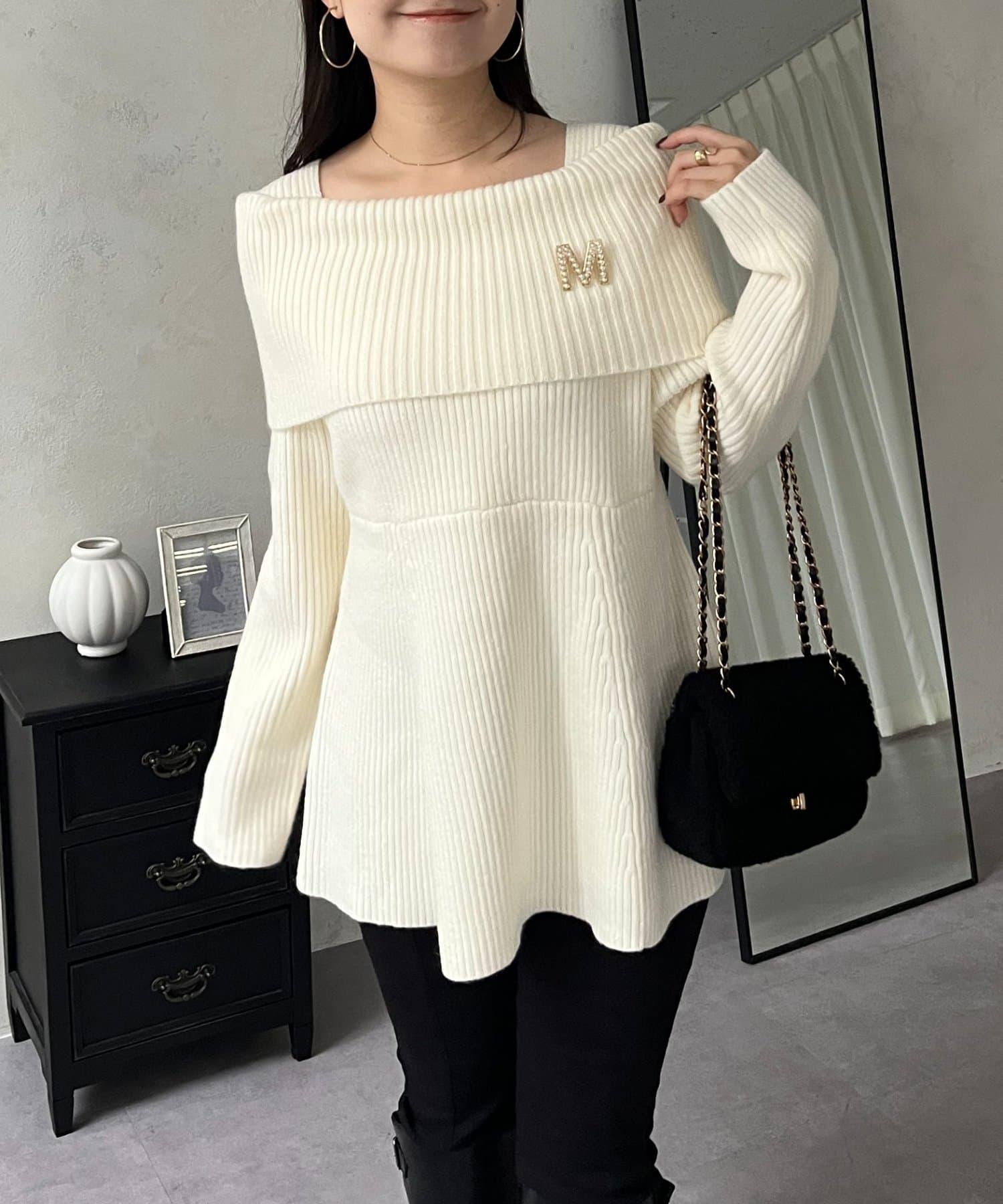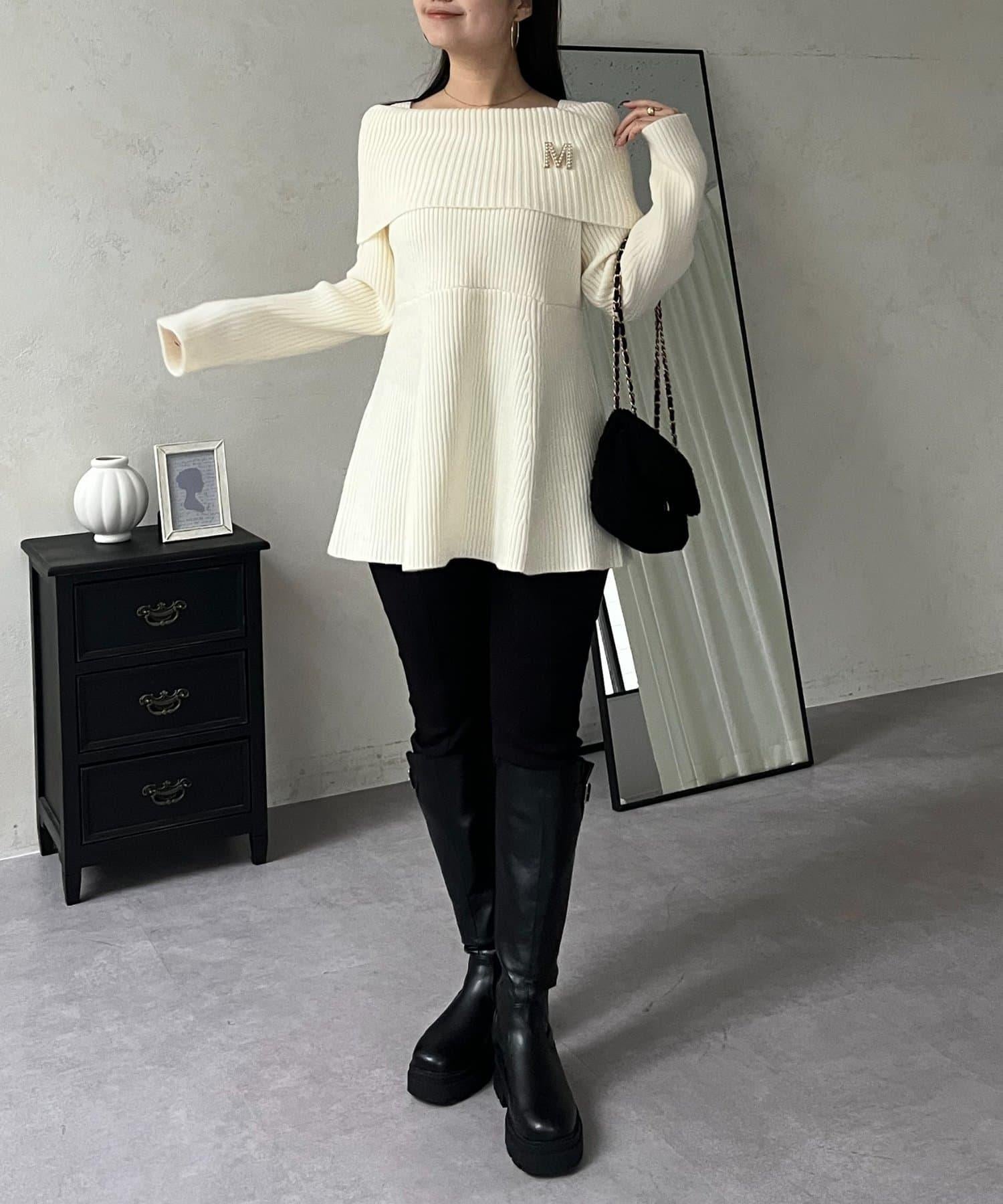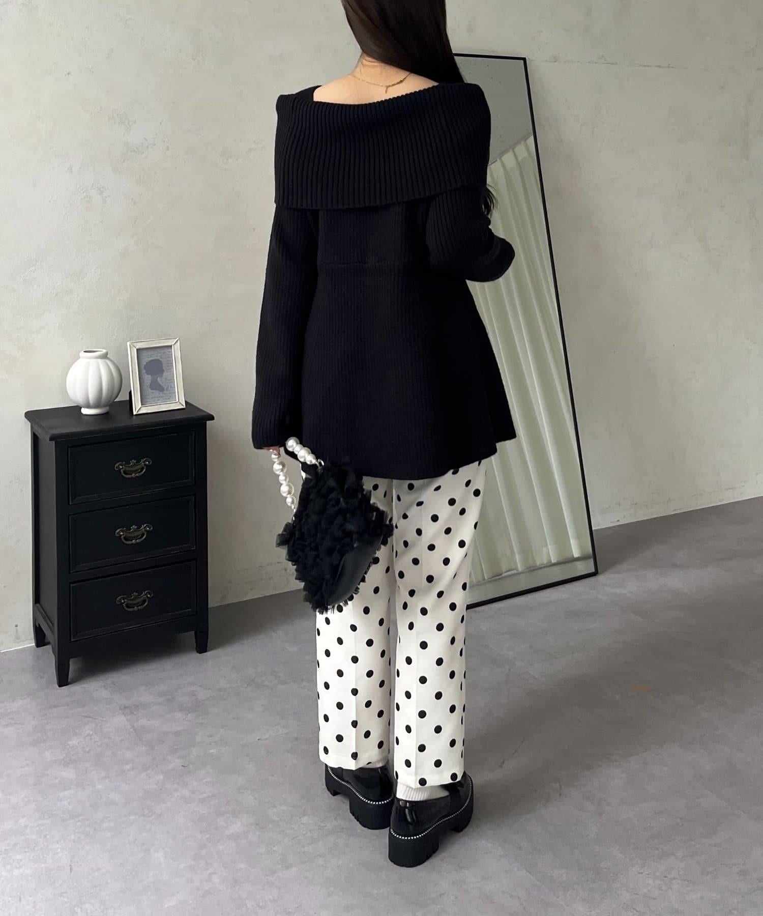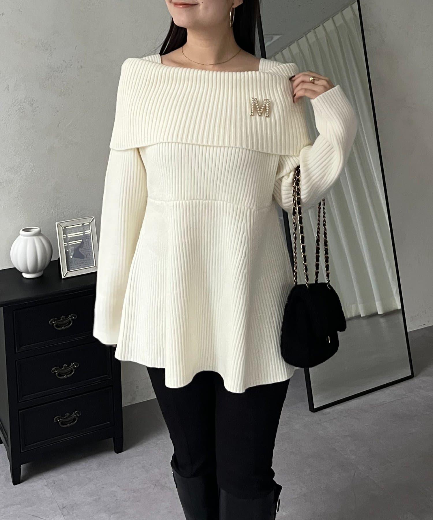 預約商品【防靜電】一字肩荷葉邊針織衫