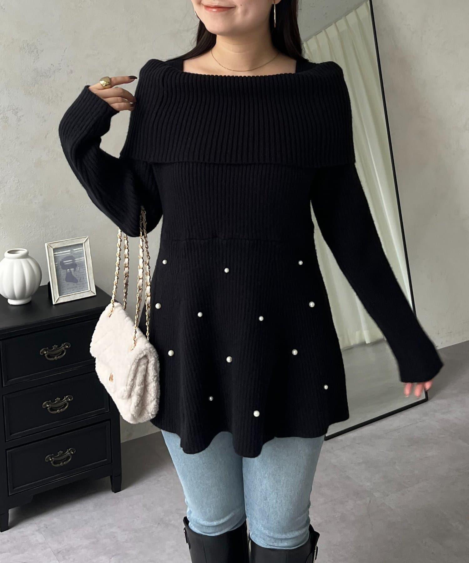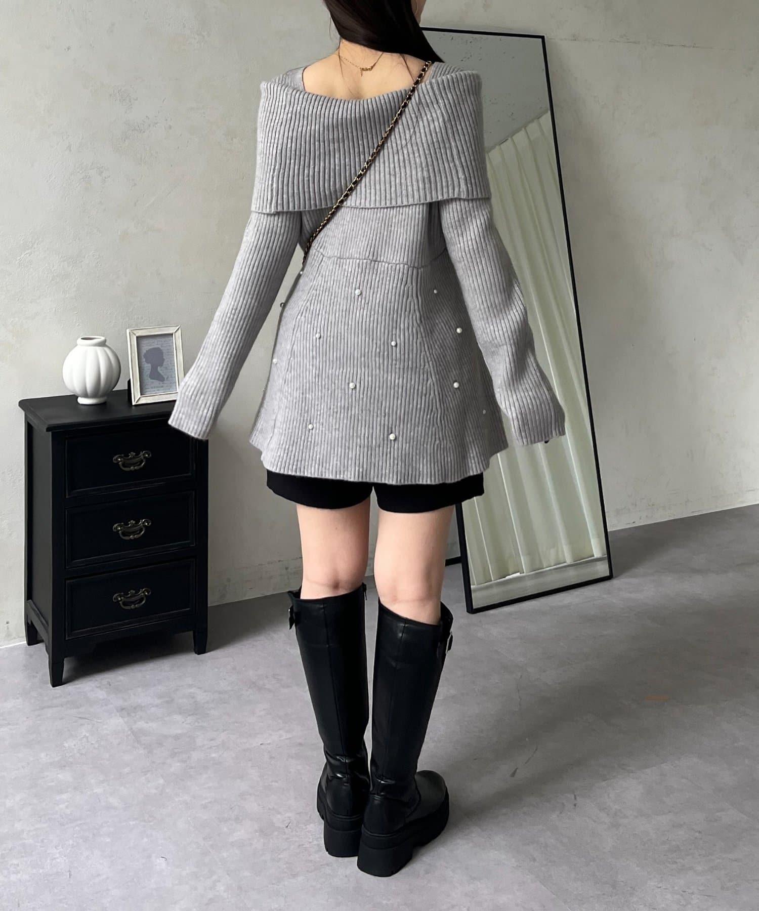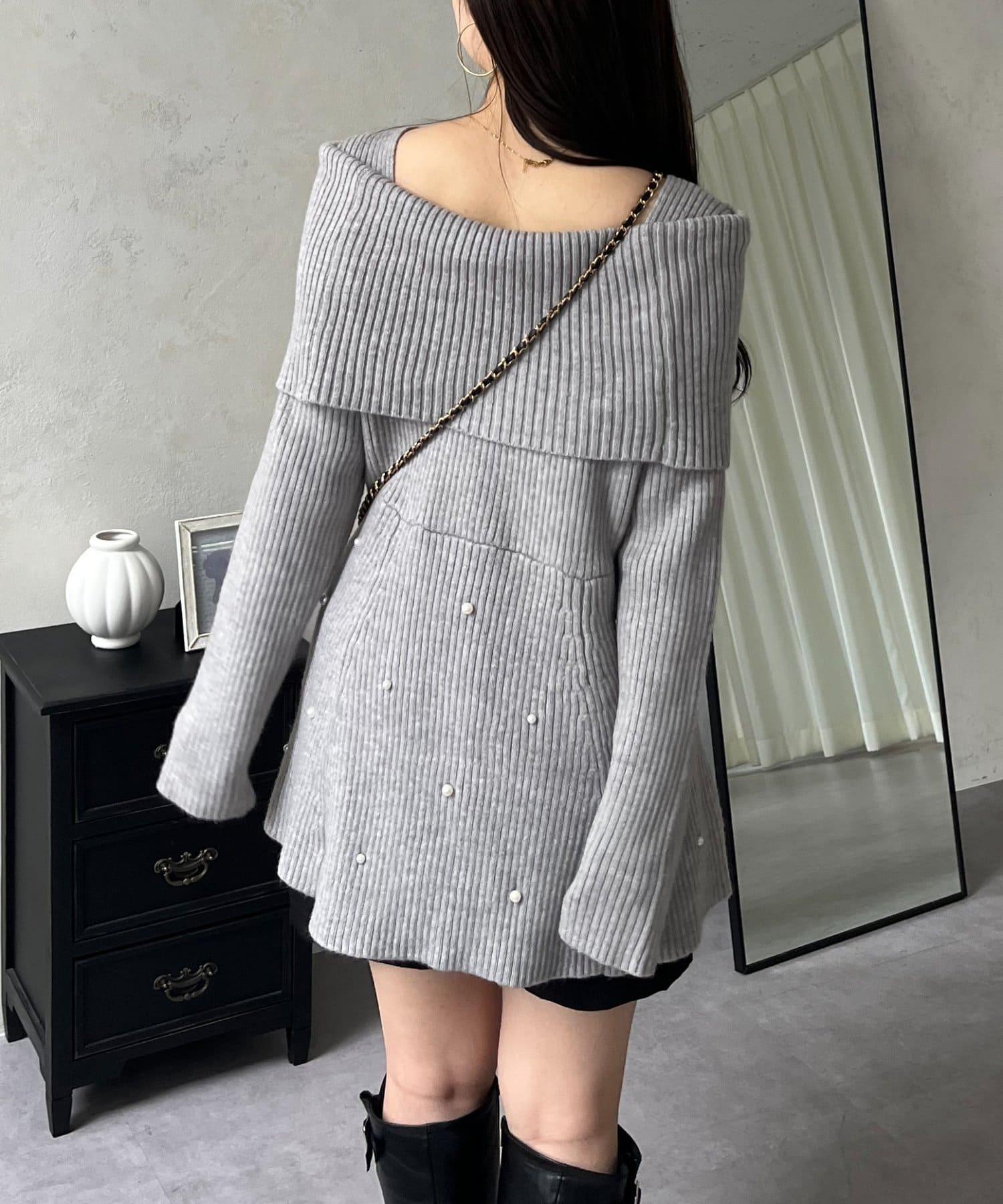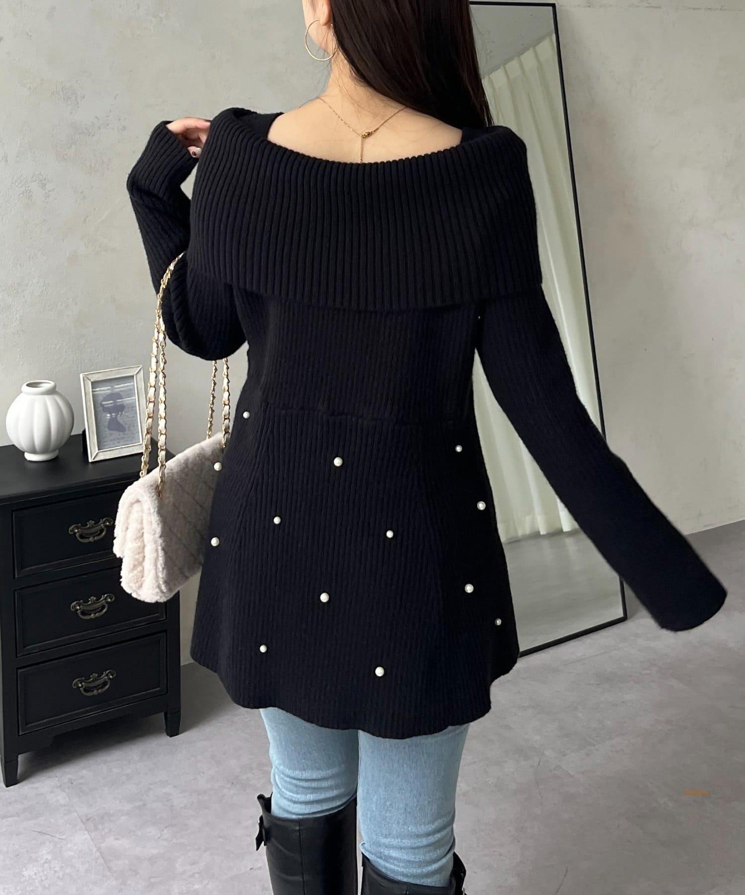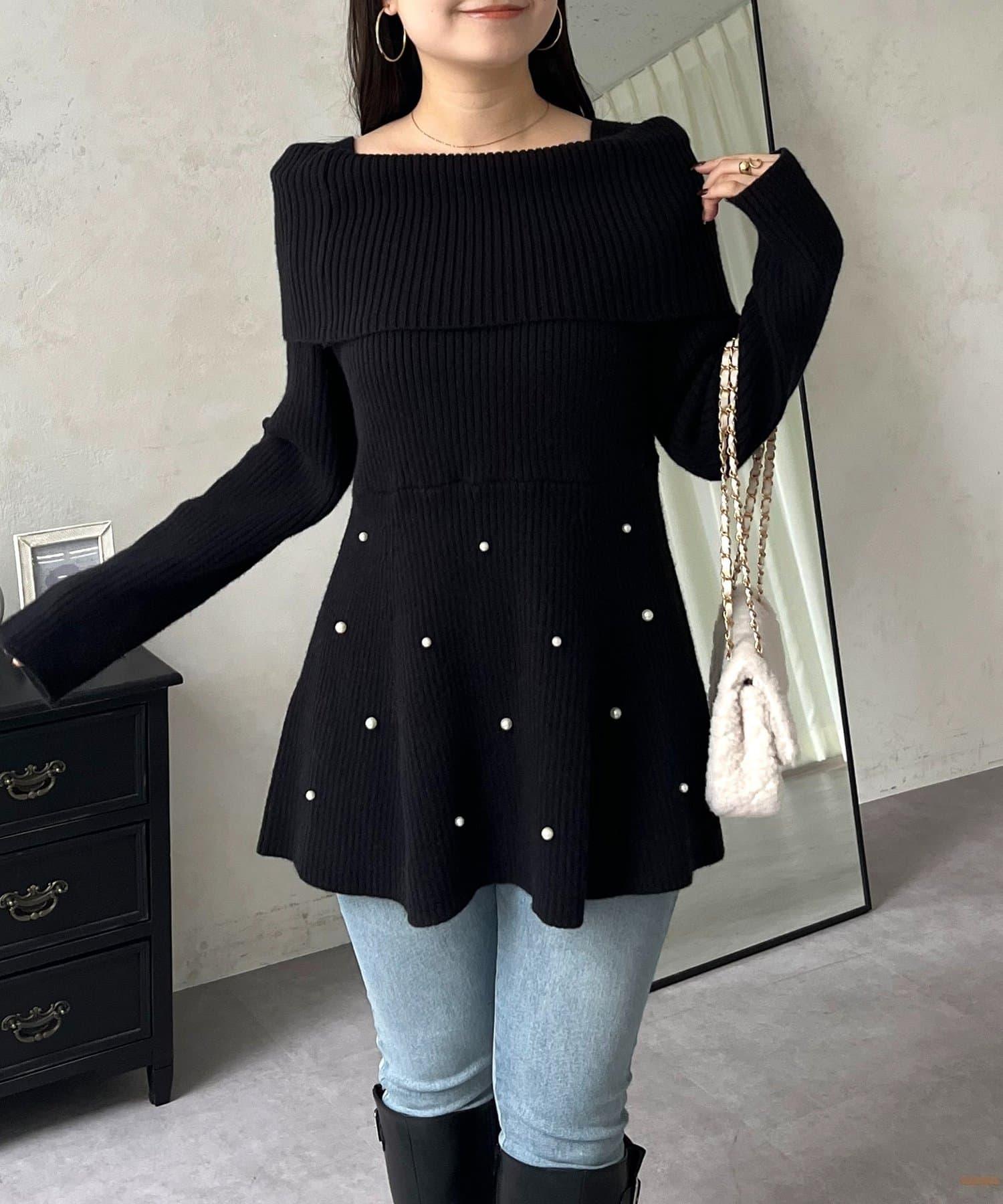 預約商品【防靜電】下襬珍珠一字肩荷葉邊針織衫