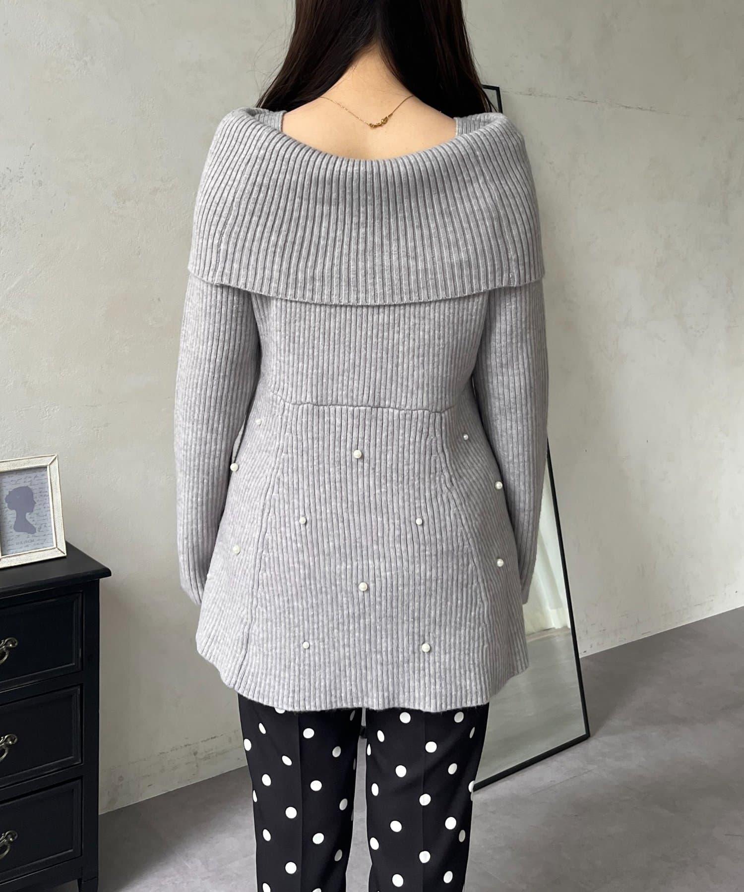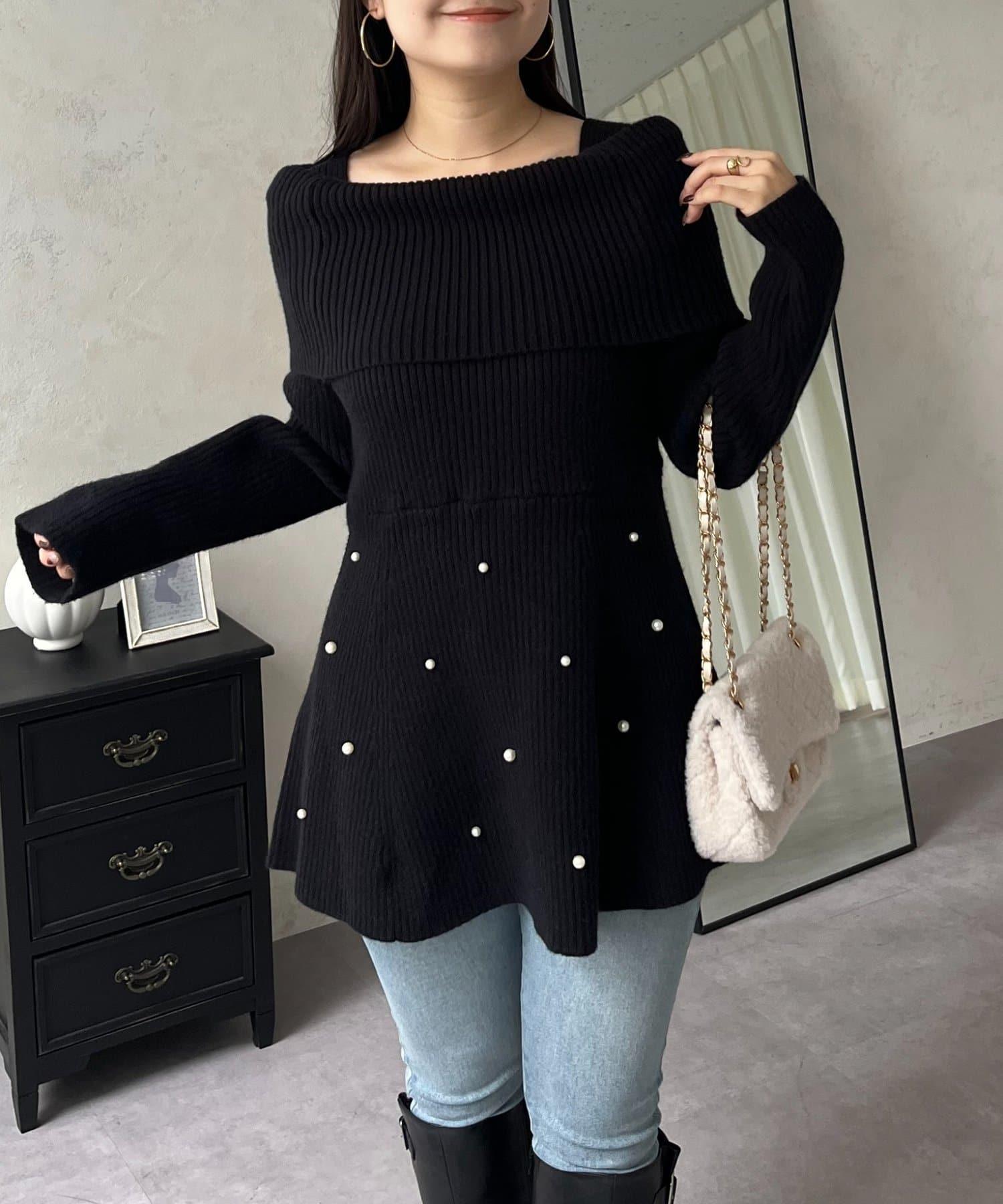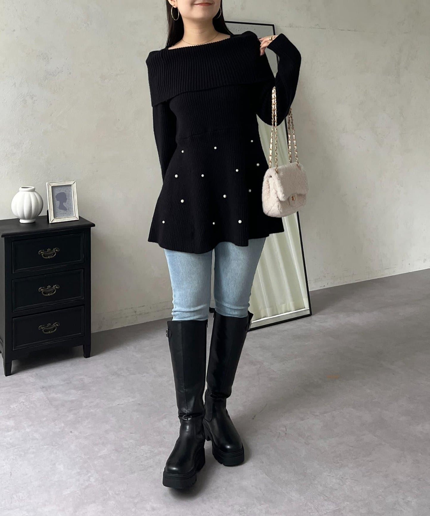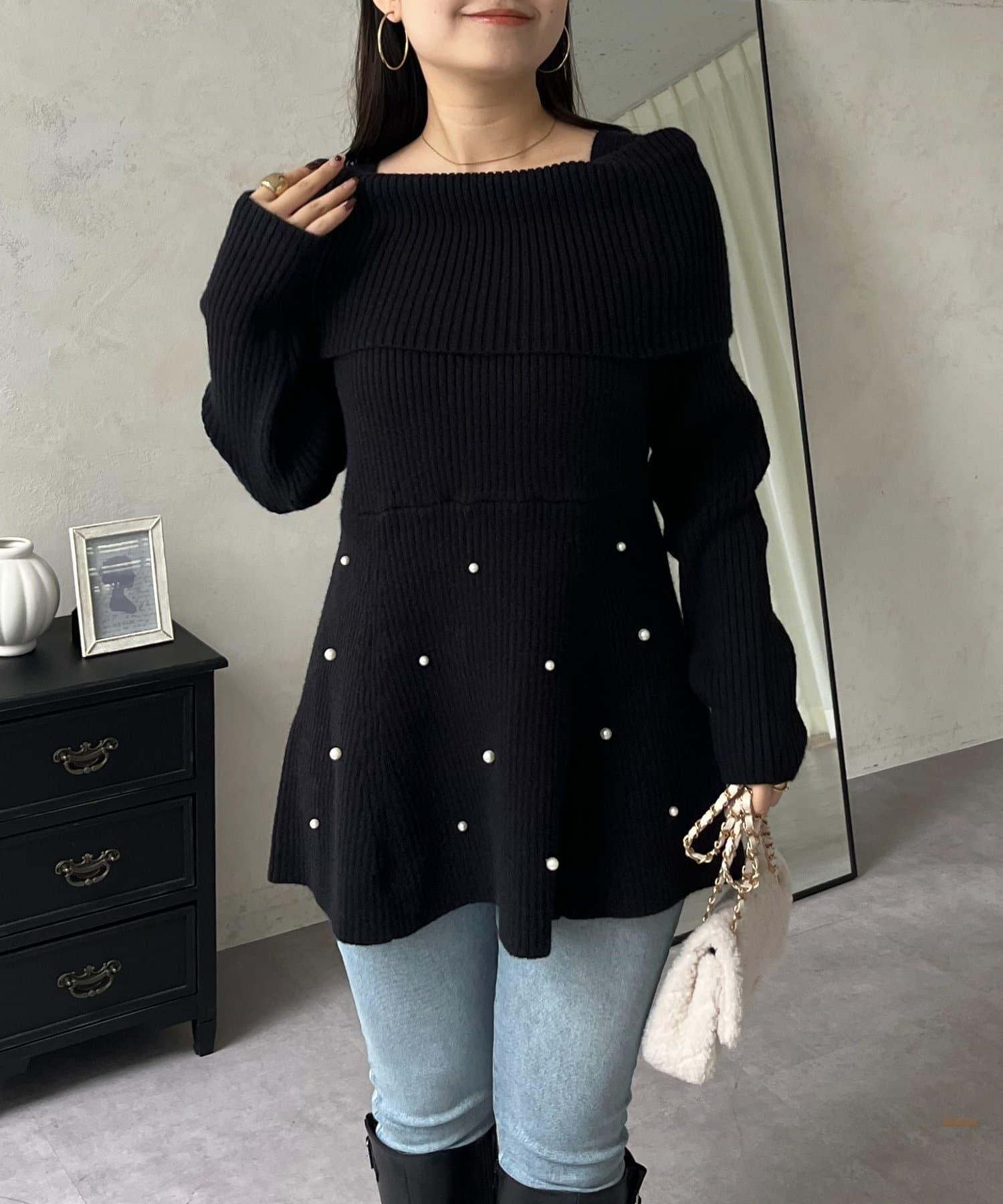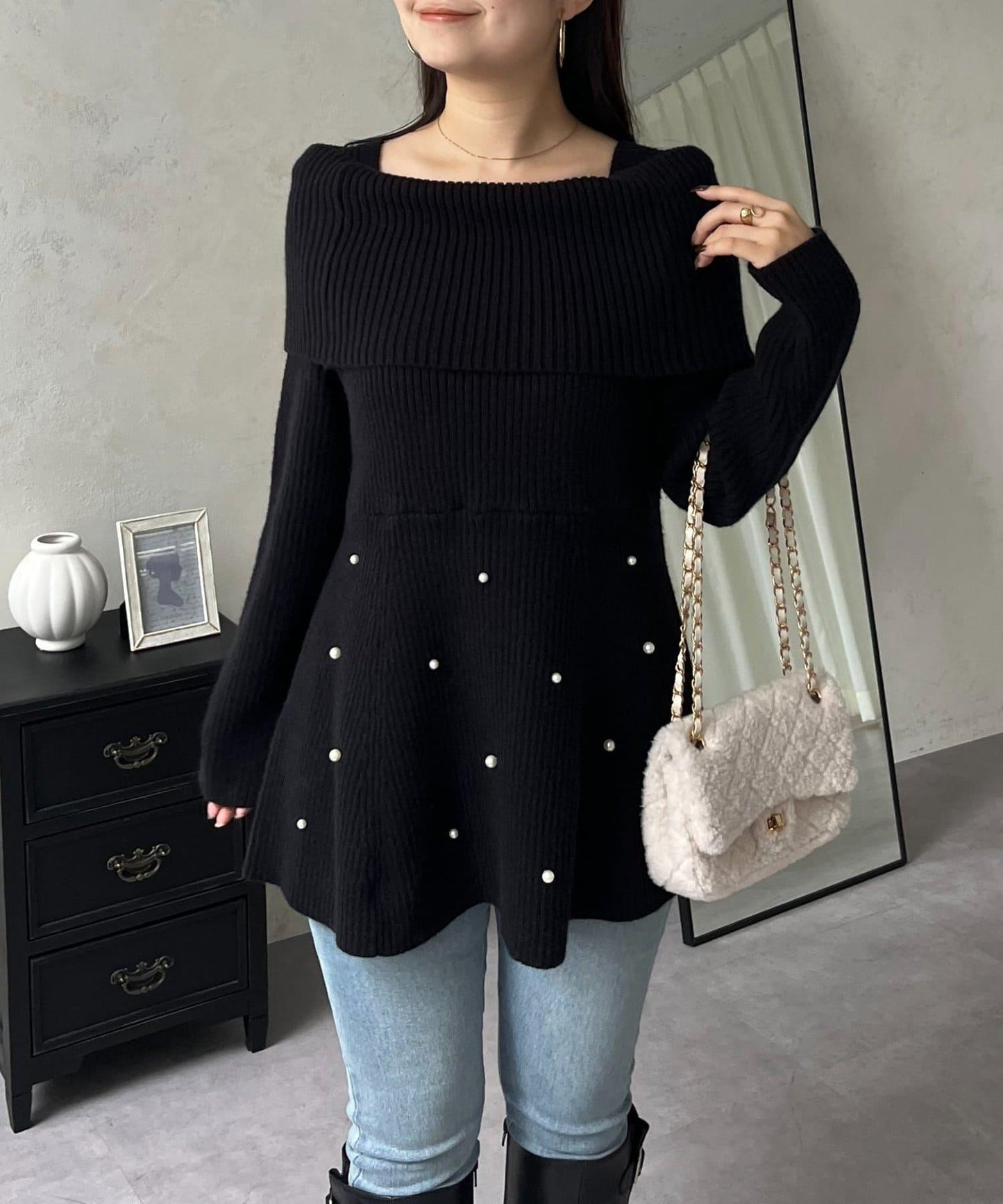預約商品【防靜電】下襬珍珠一字肩荷葉邊針織衫