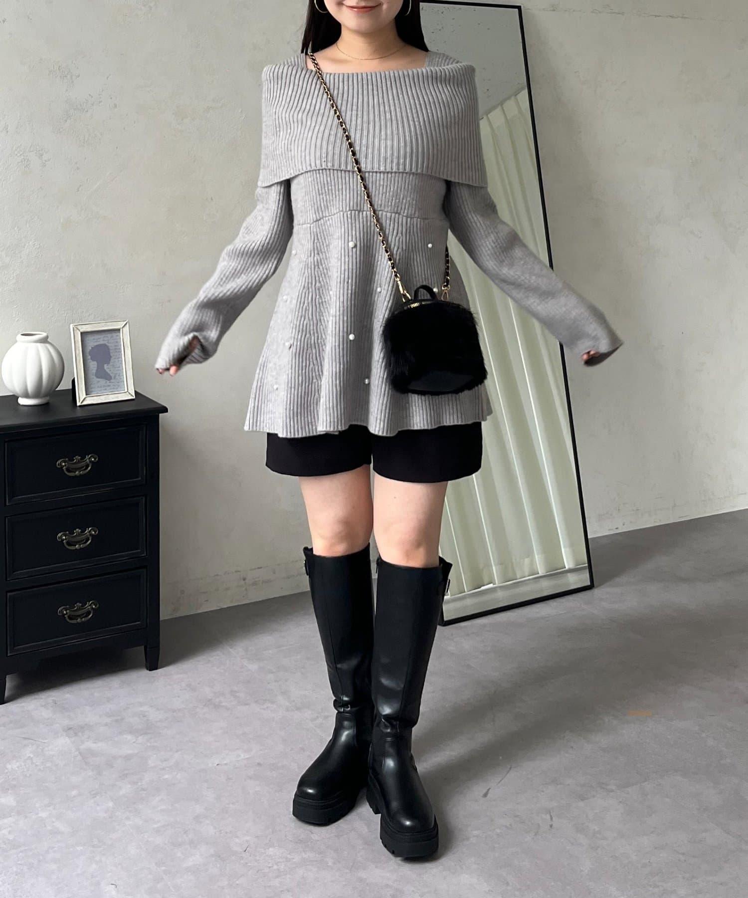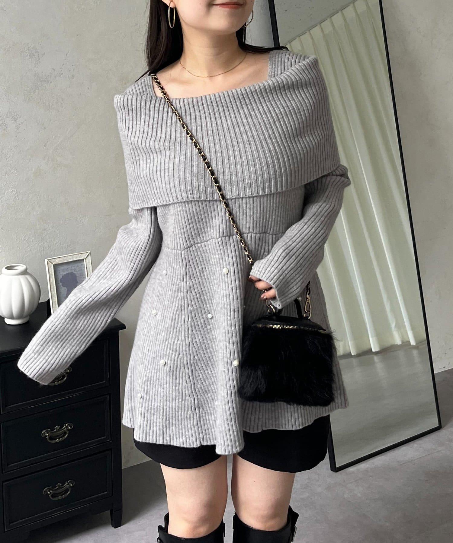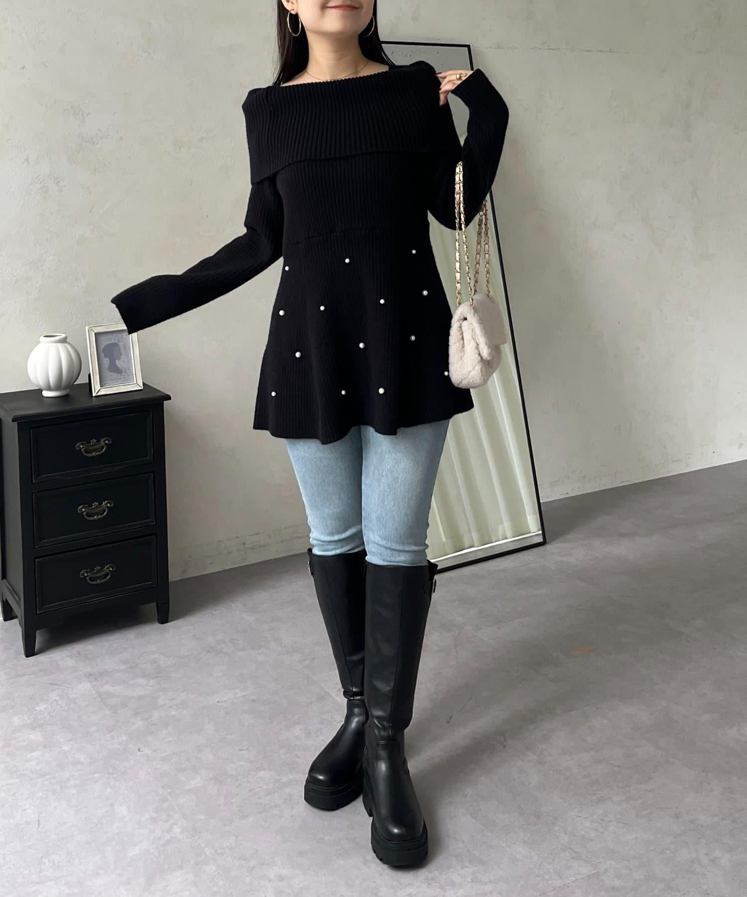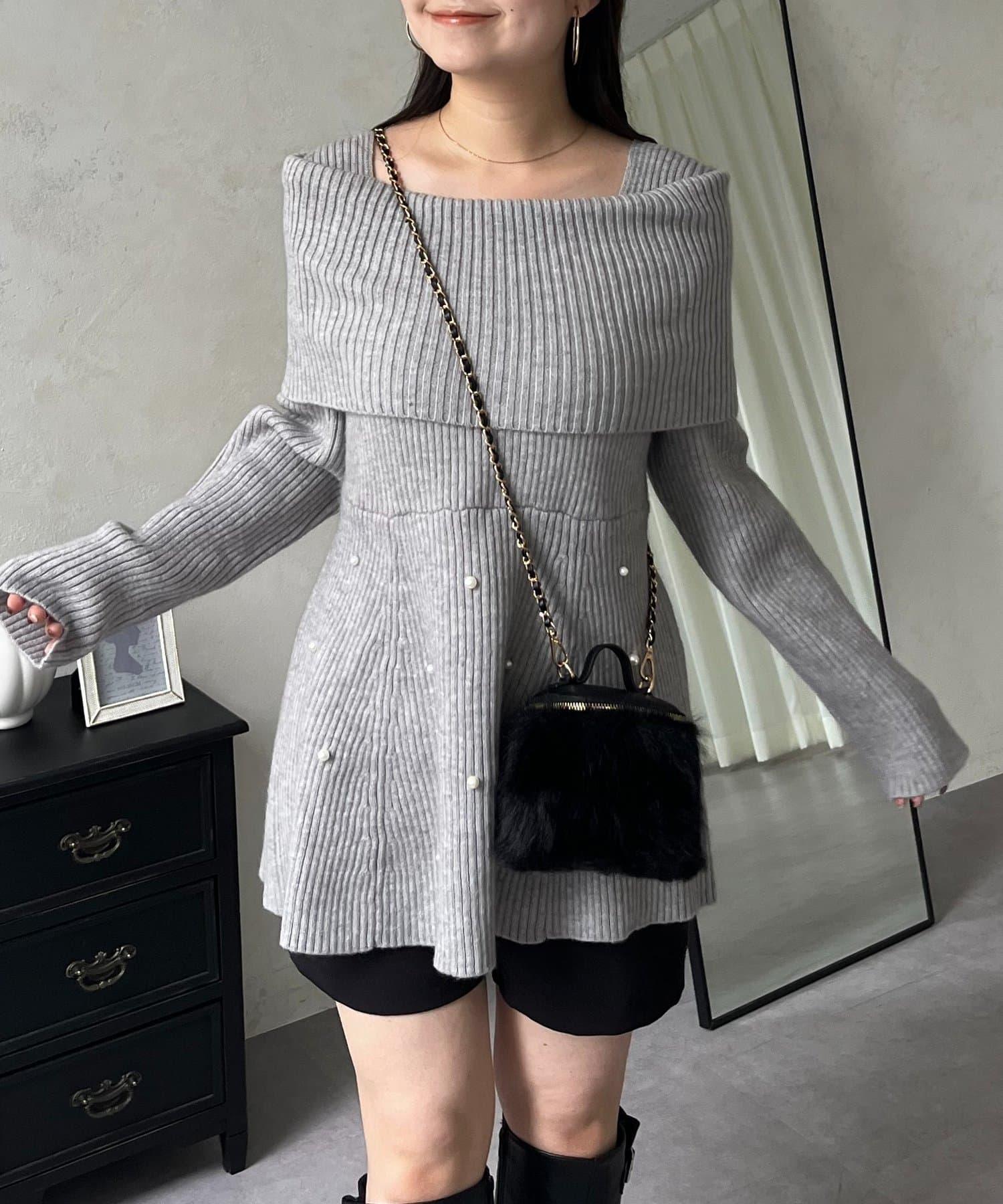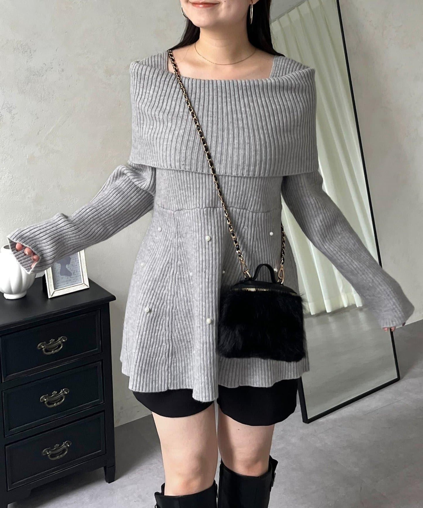 預約商品【防靜電】下襬珍珠一字肩荷葉邊針織衫