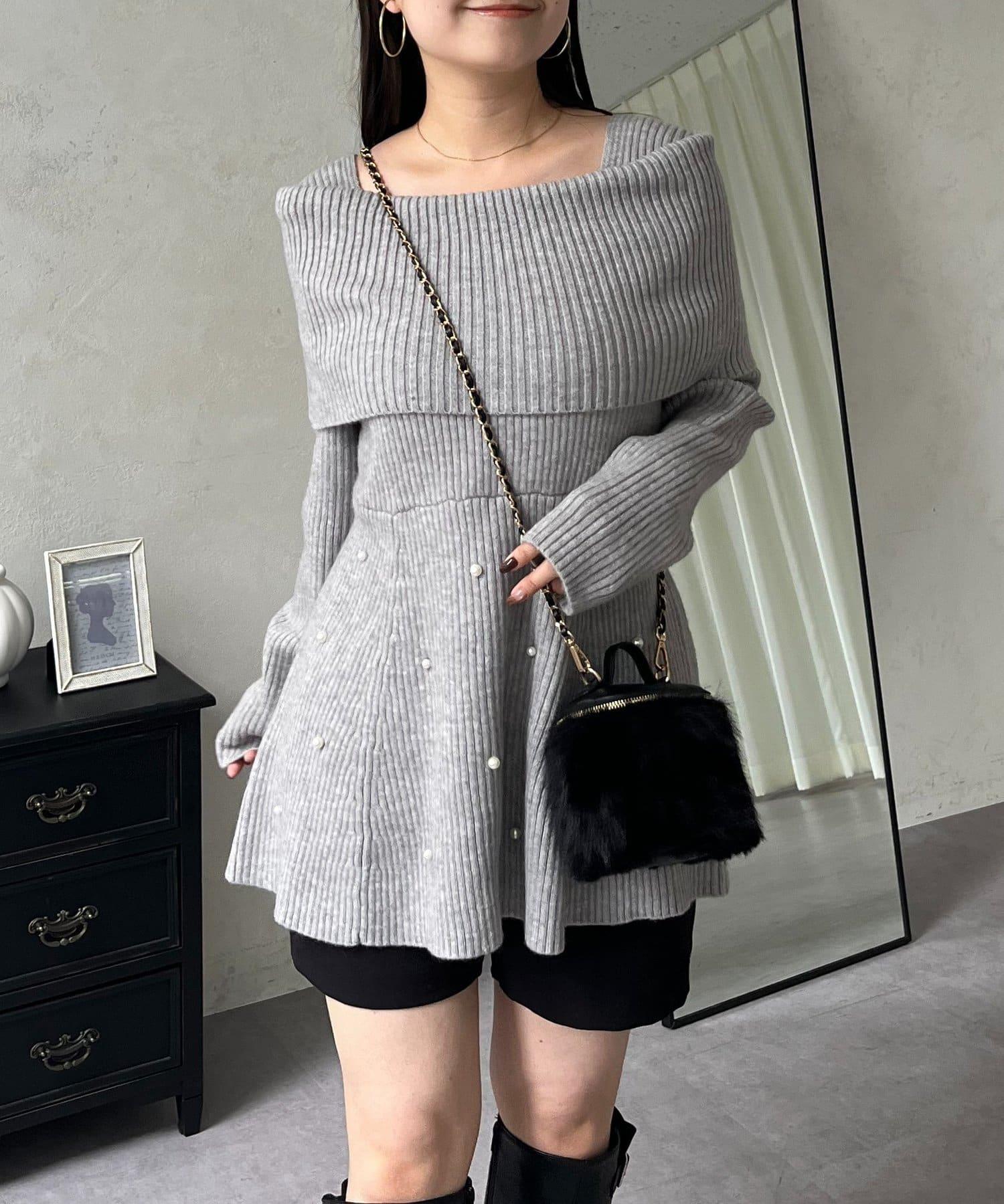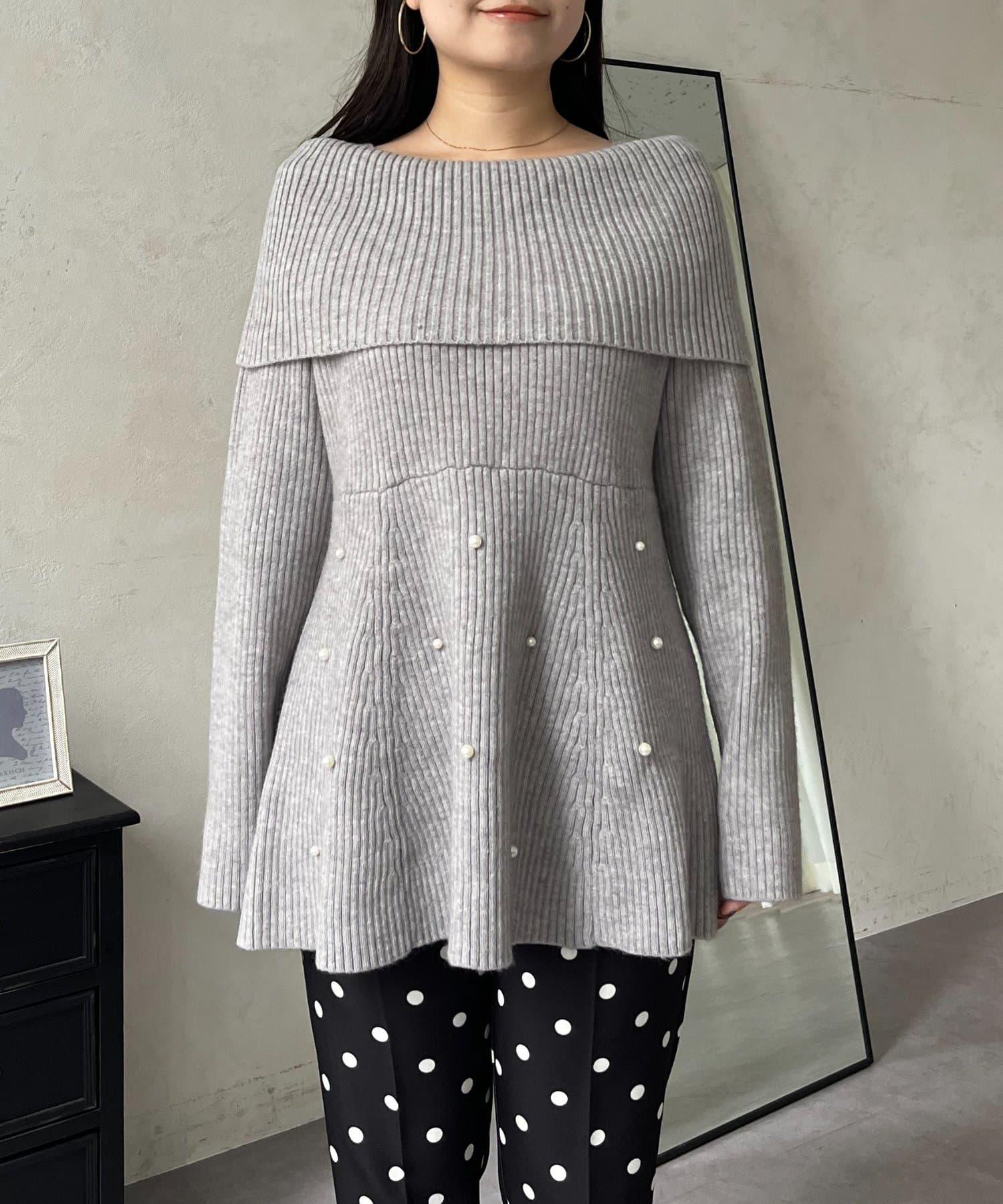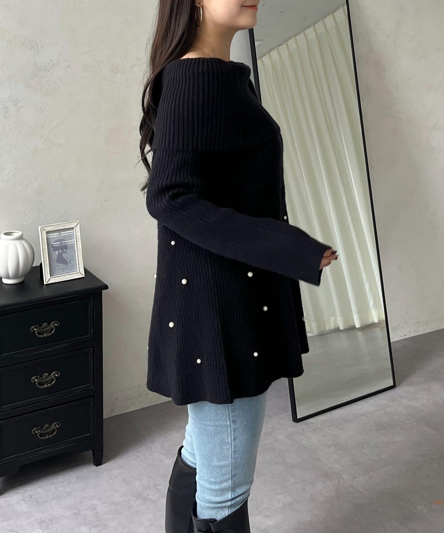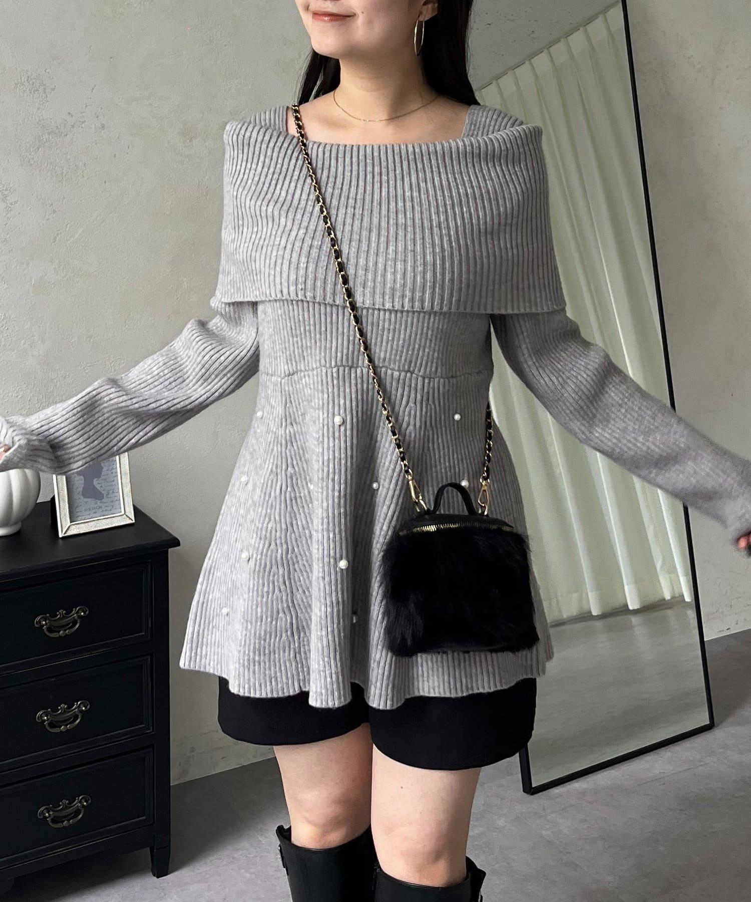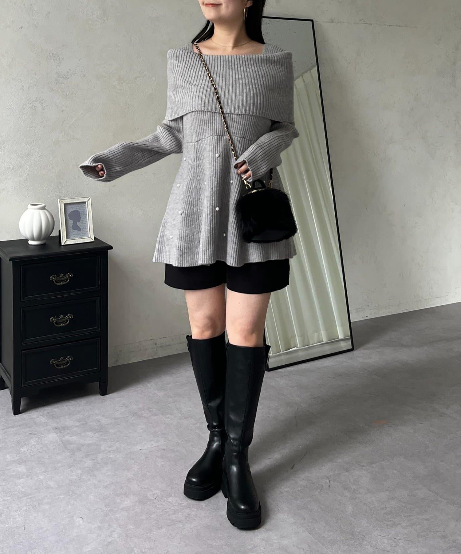 預約商品【防靜電】下襬珍珠一字肩荷葉邊針織衫