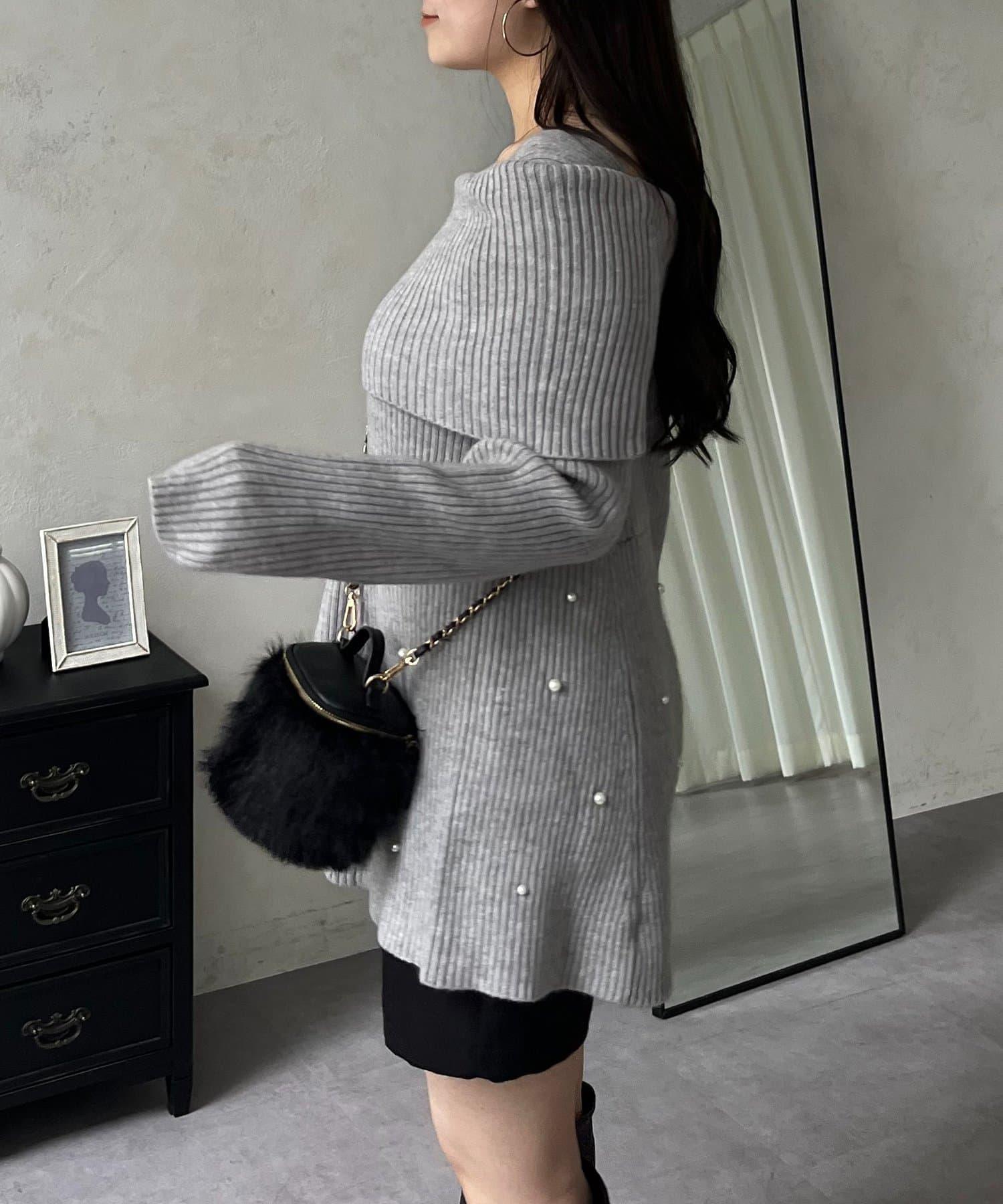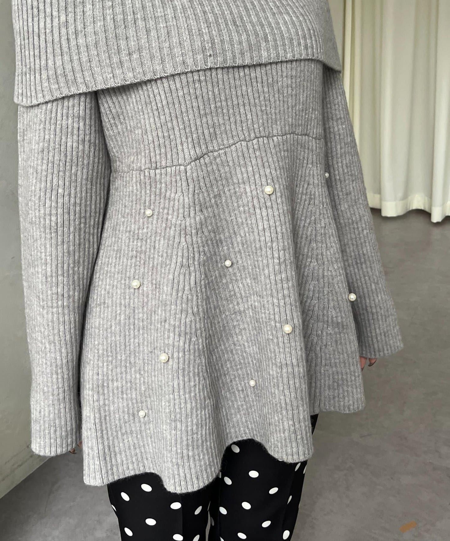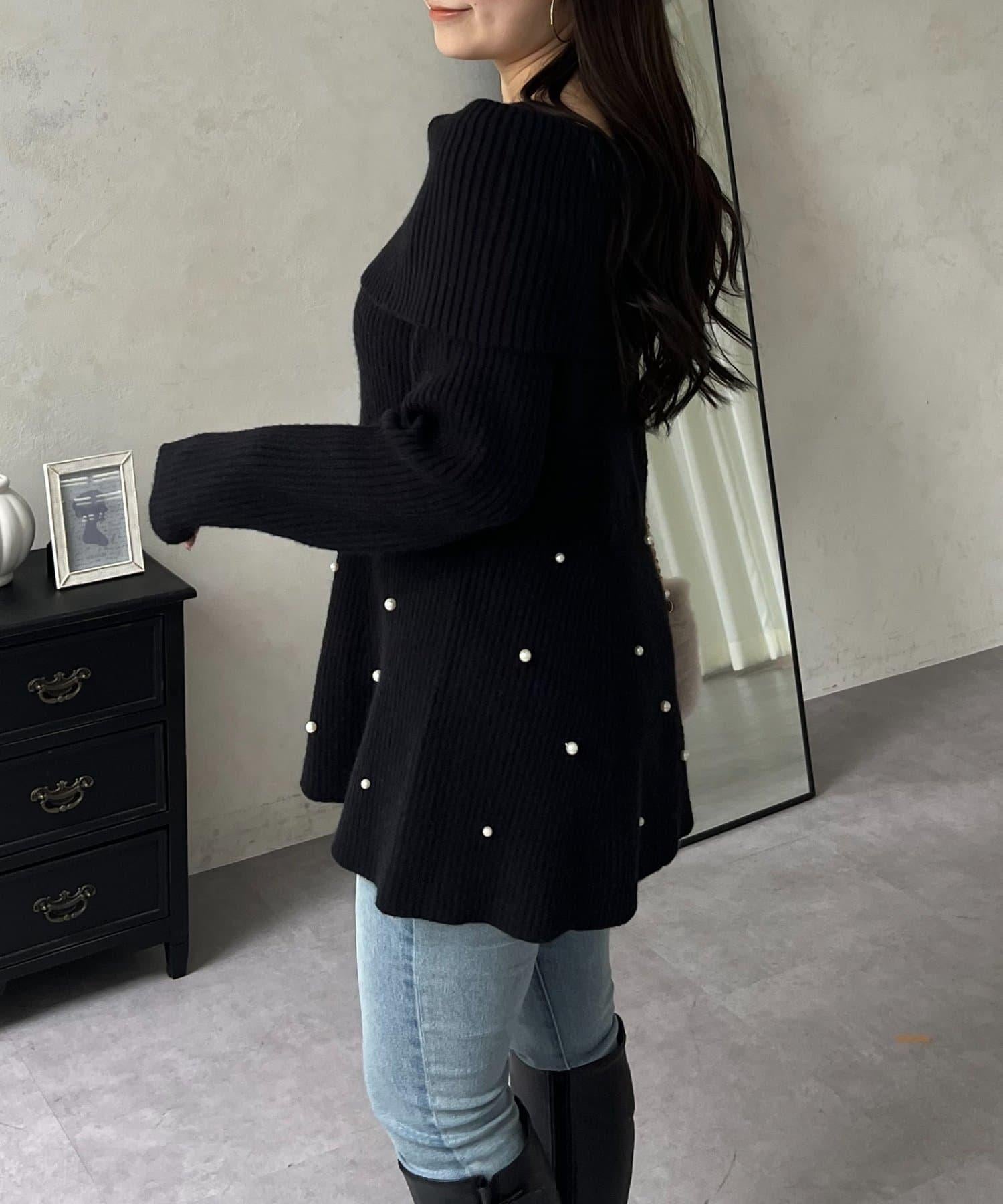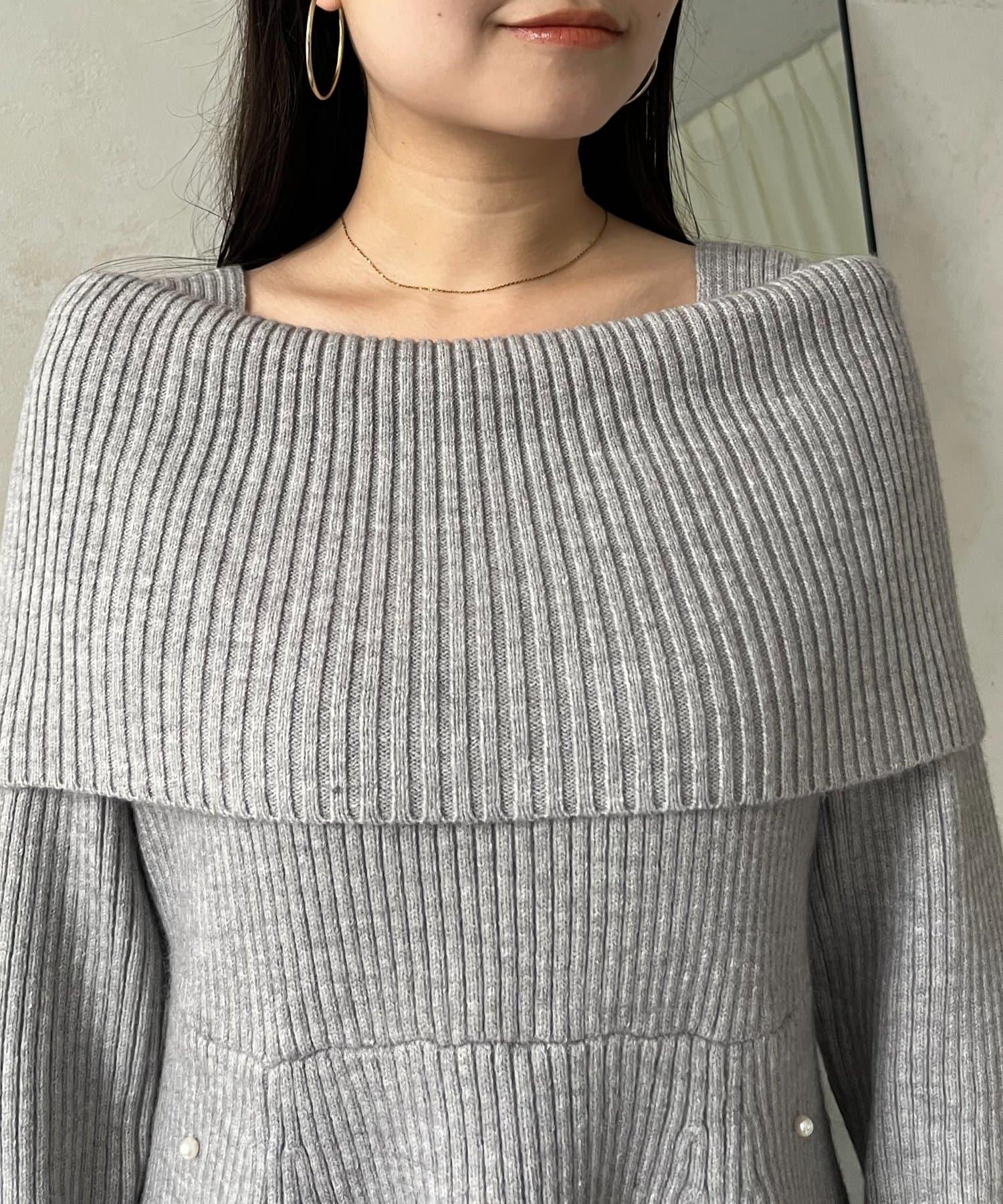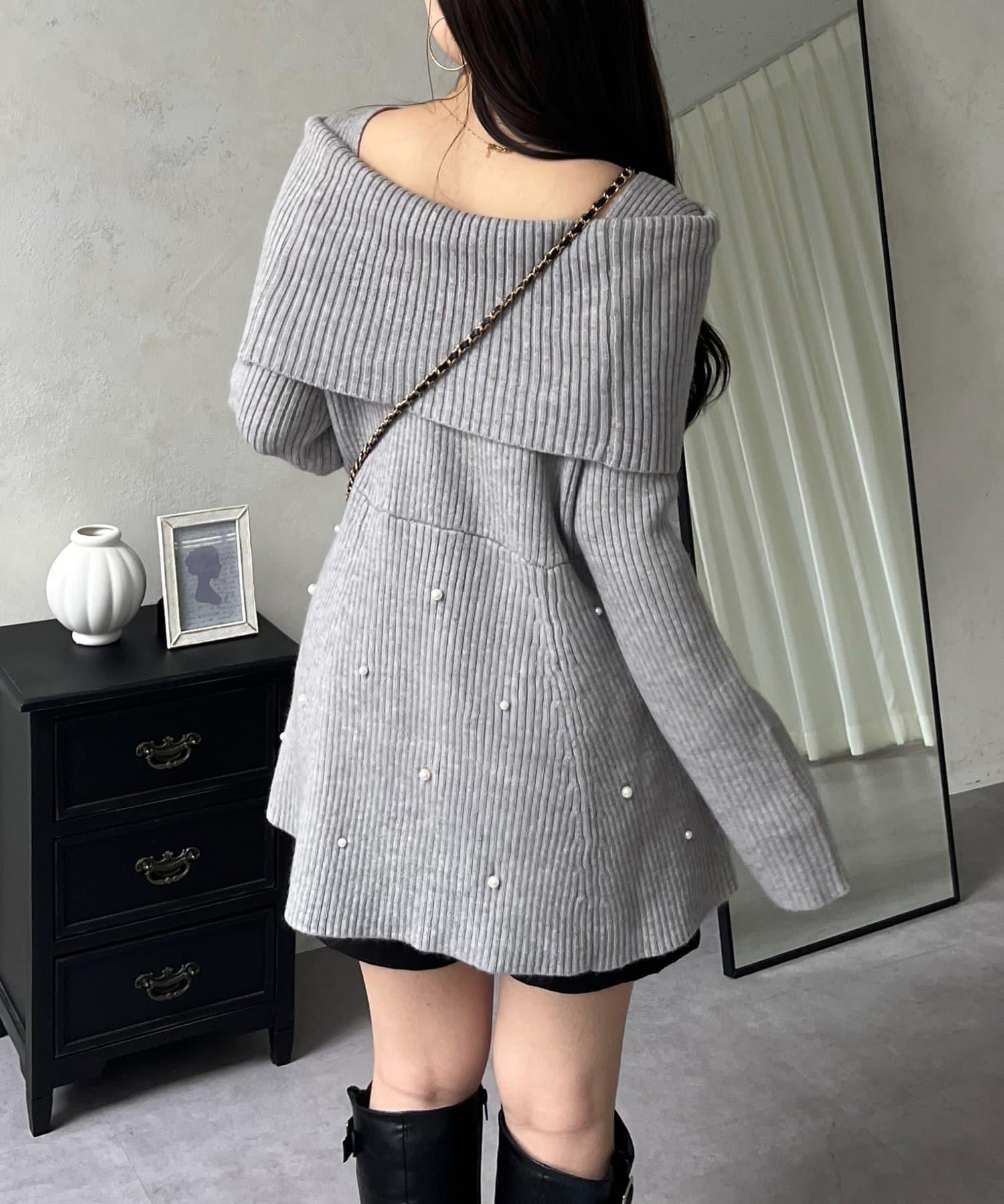 預約商品【防靜電】下襬珍珠一字肩荷葉邊針織衫