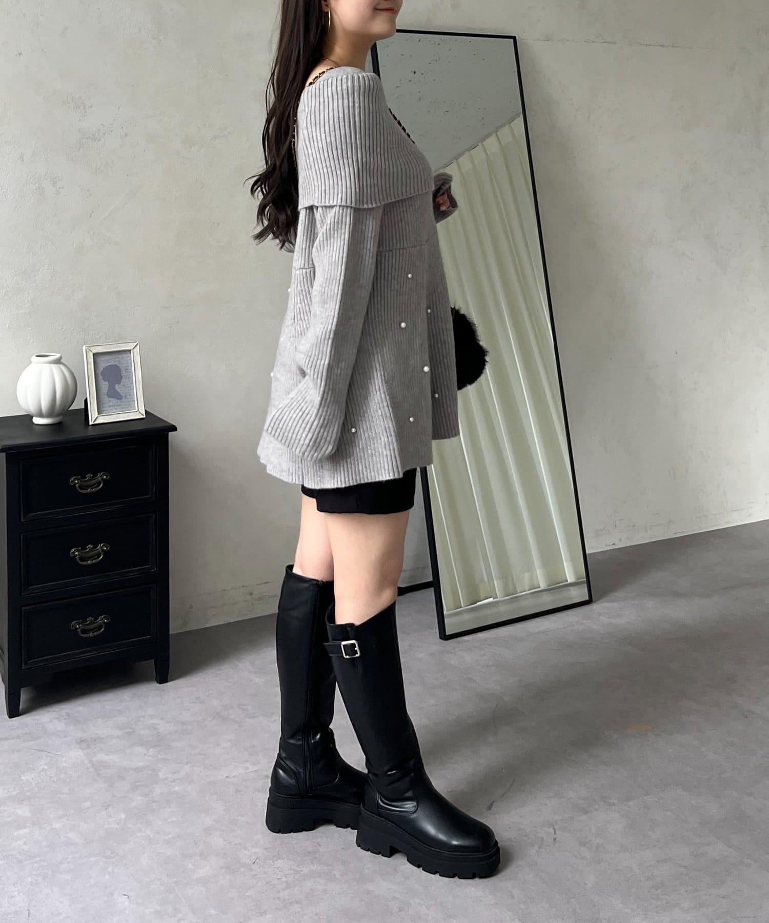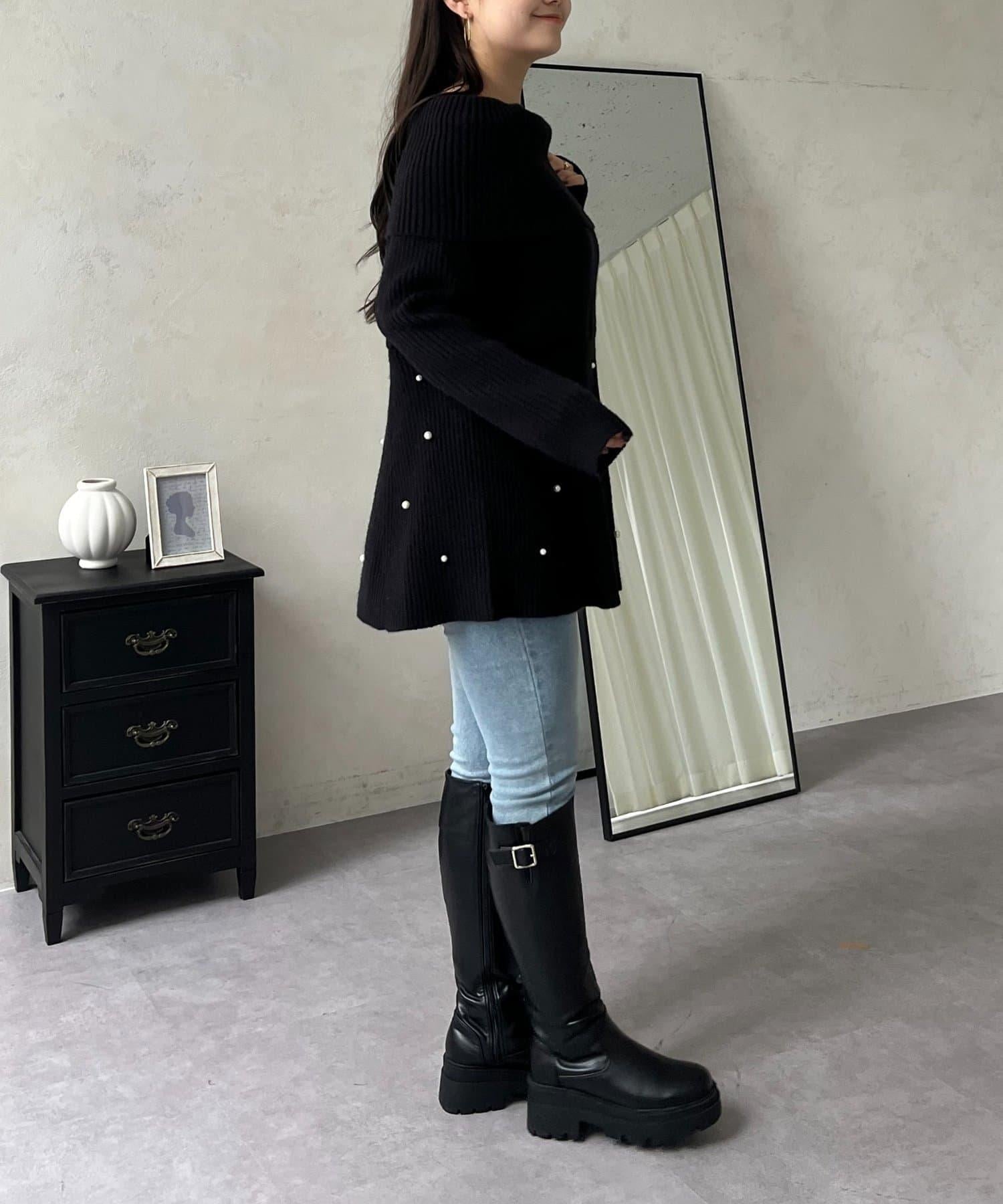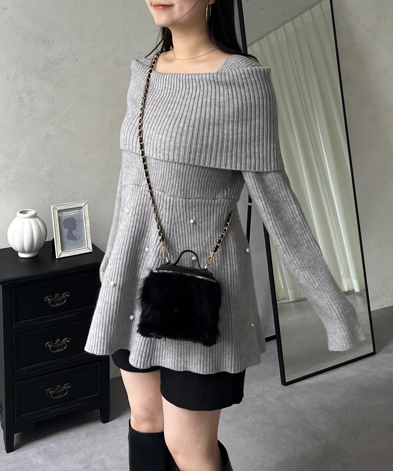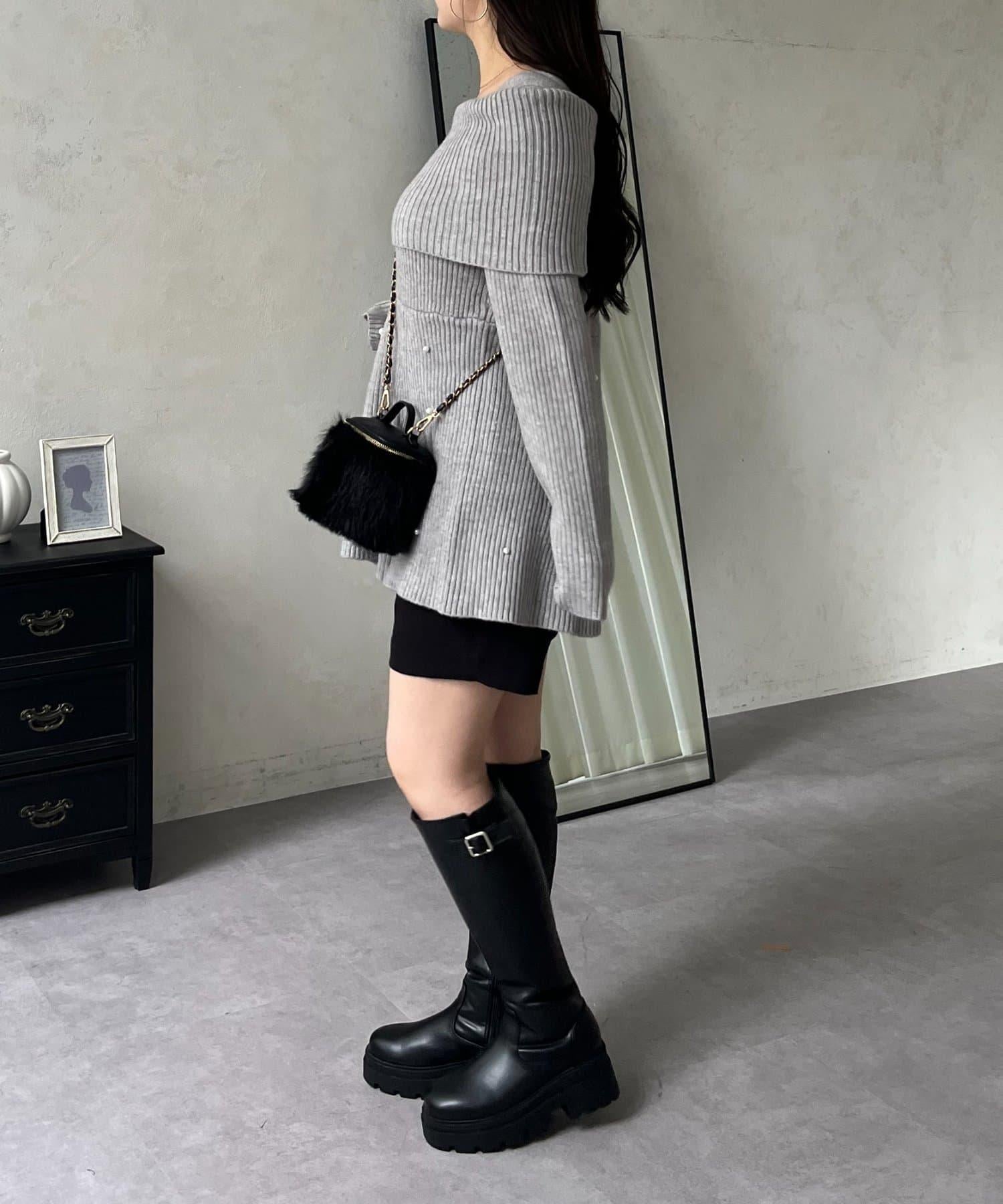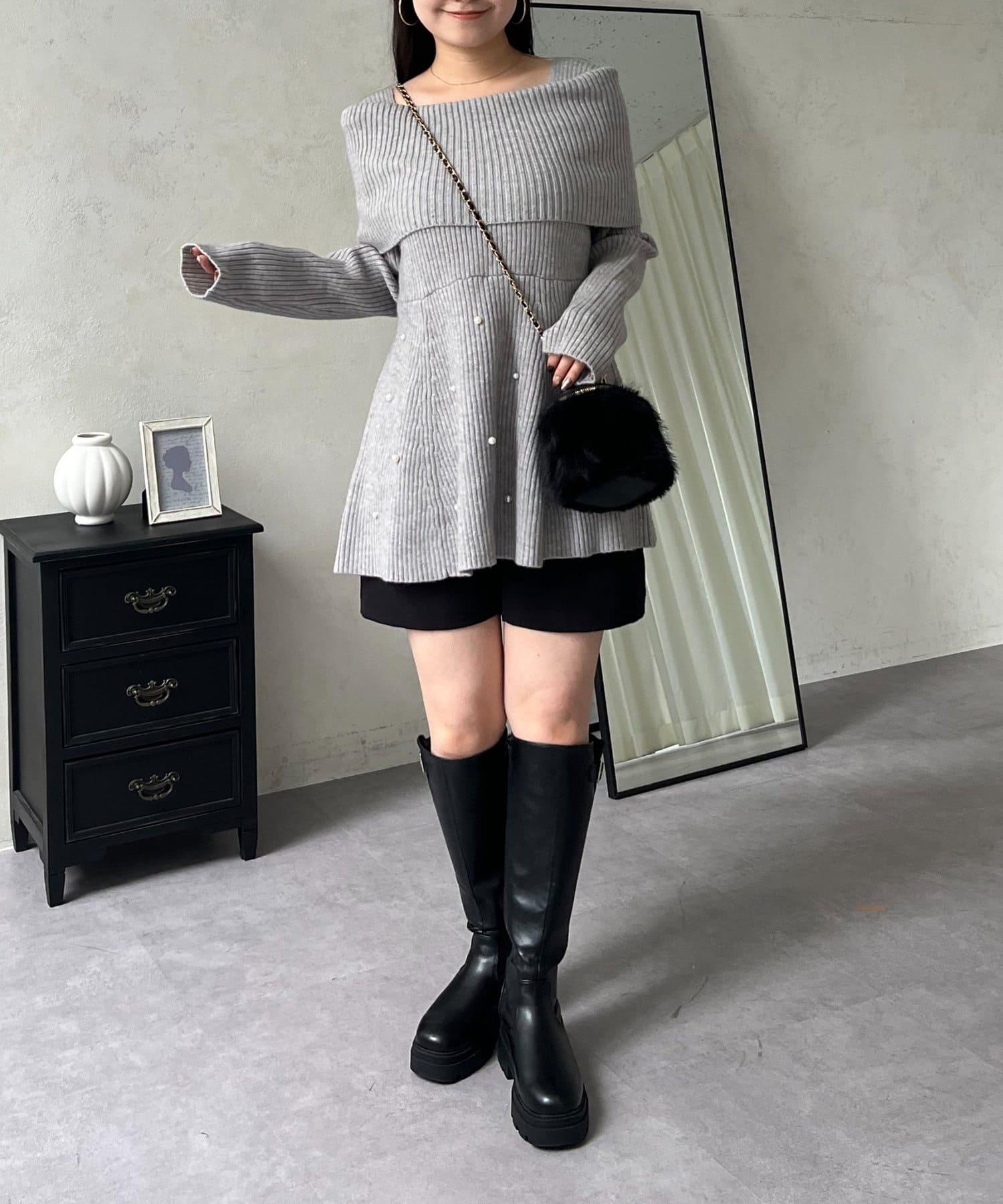 預約商品【防靜電】下襬珍珠一字肩荷葉邊針織衫