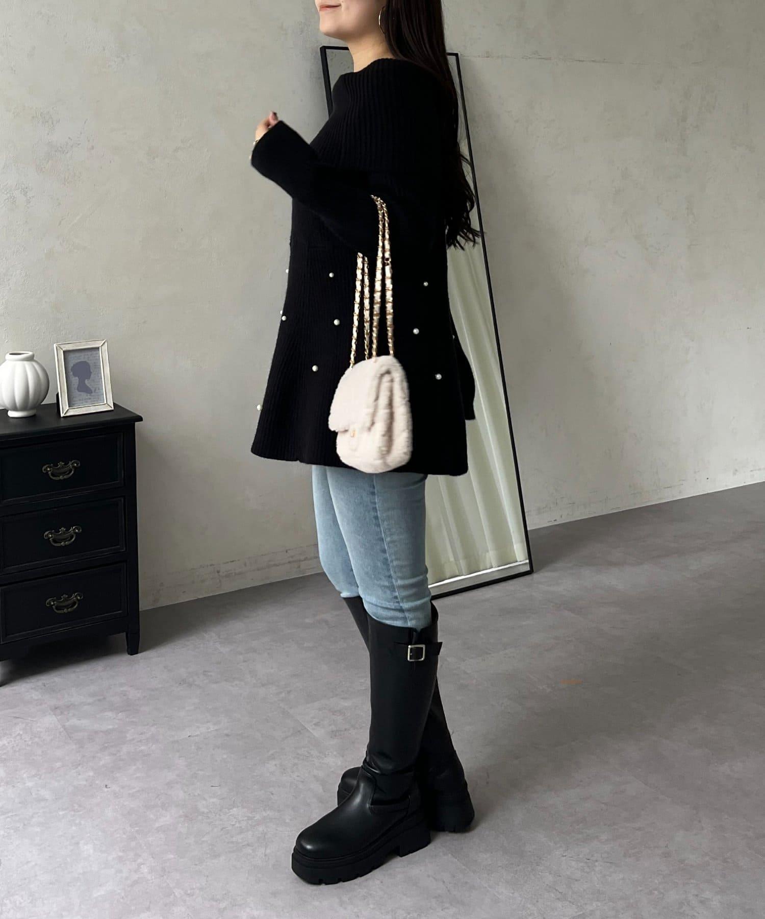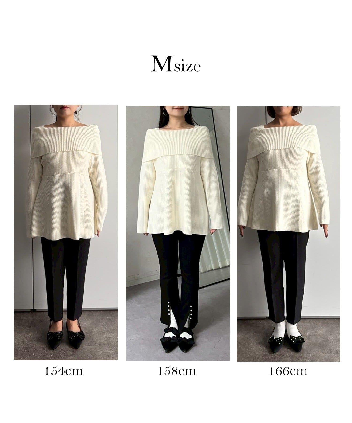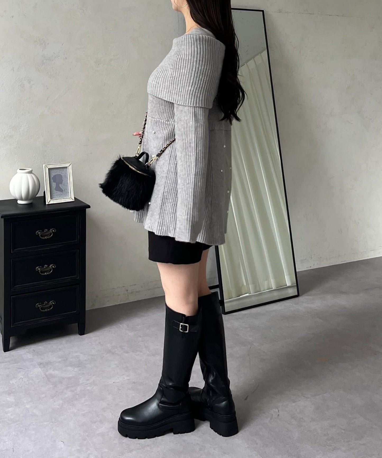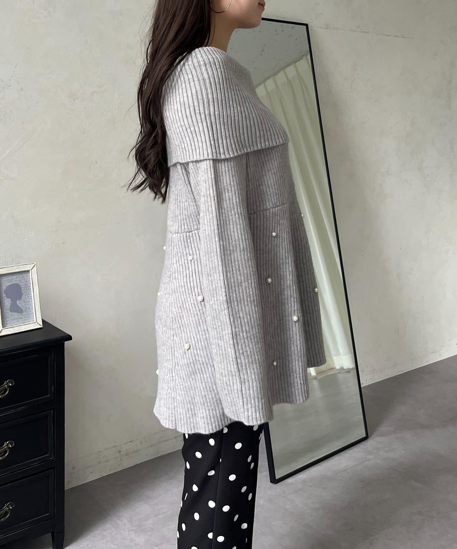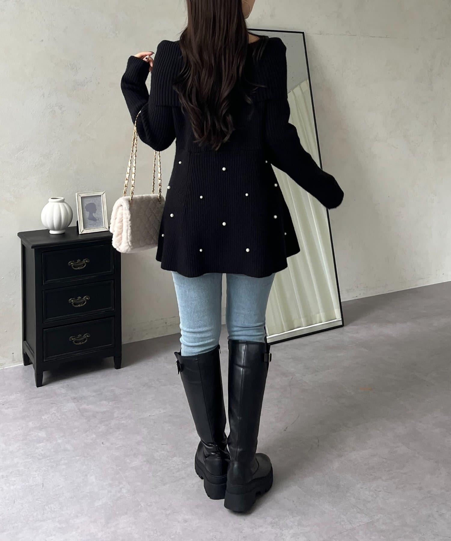預約商品【防靜電】下襬珍珠一字肩荷葉邊針織衫