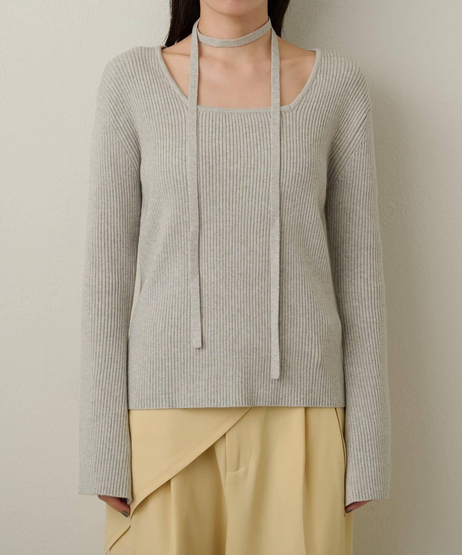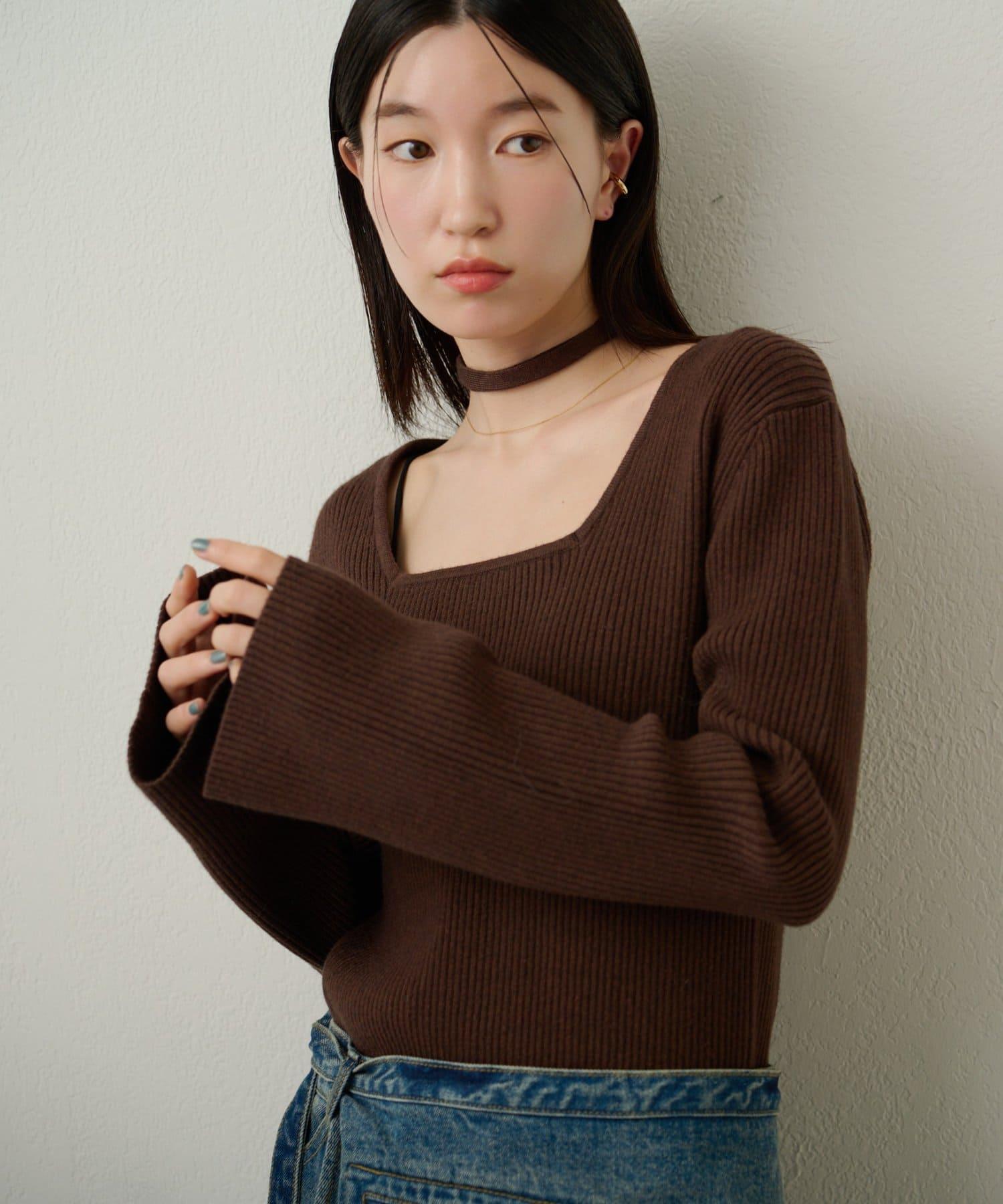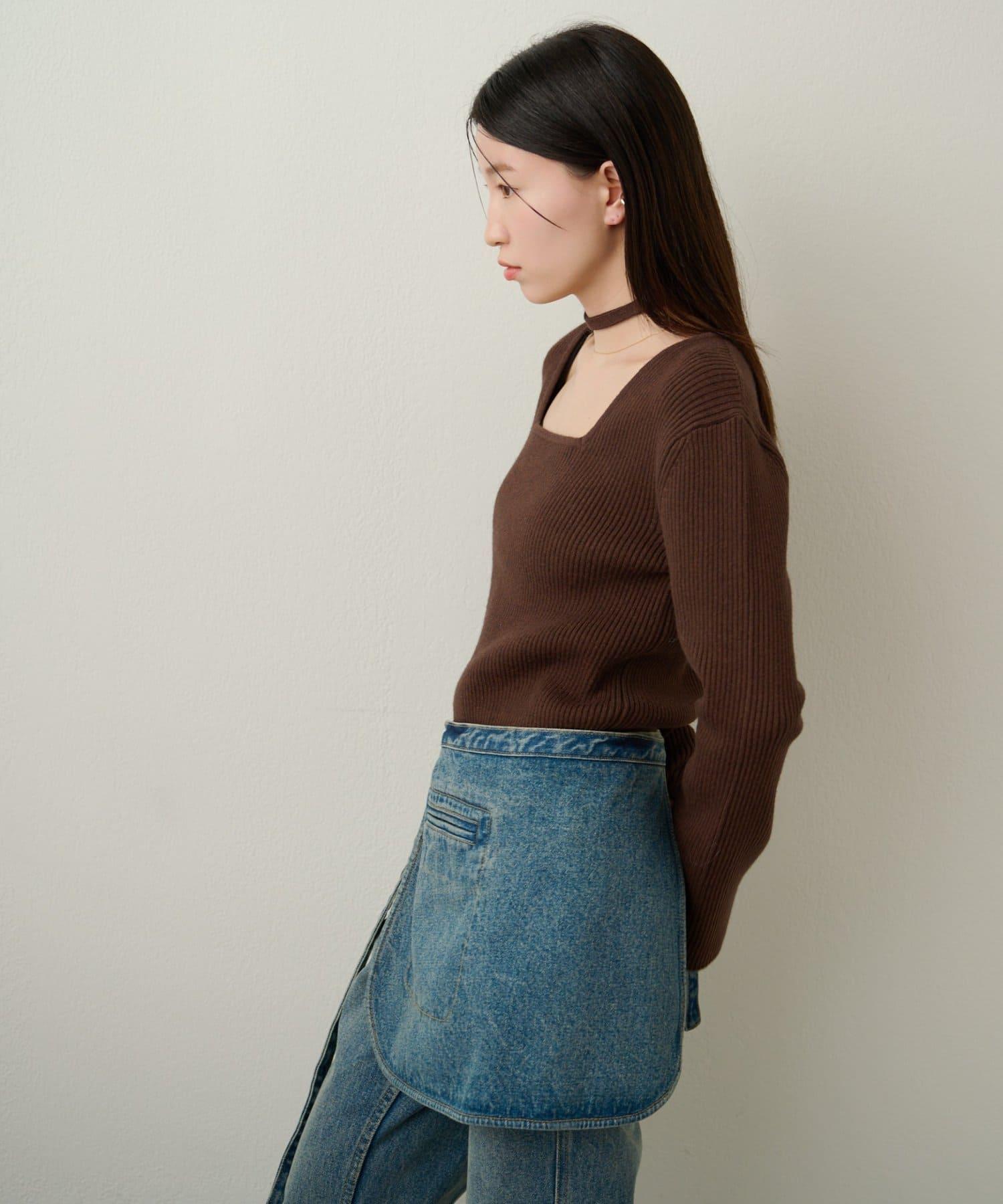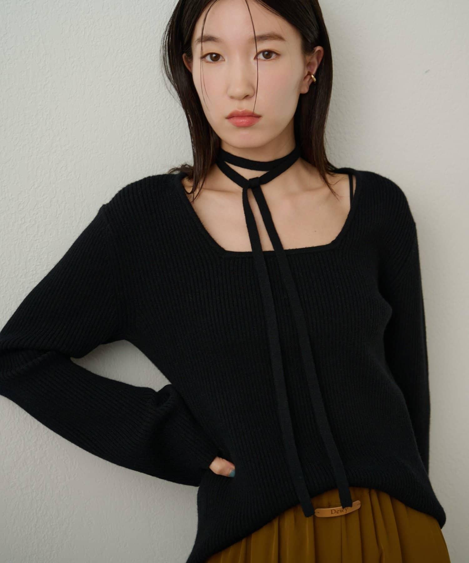 方形顏色與choker的組合賦予了這款針織衫季節性的風格。