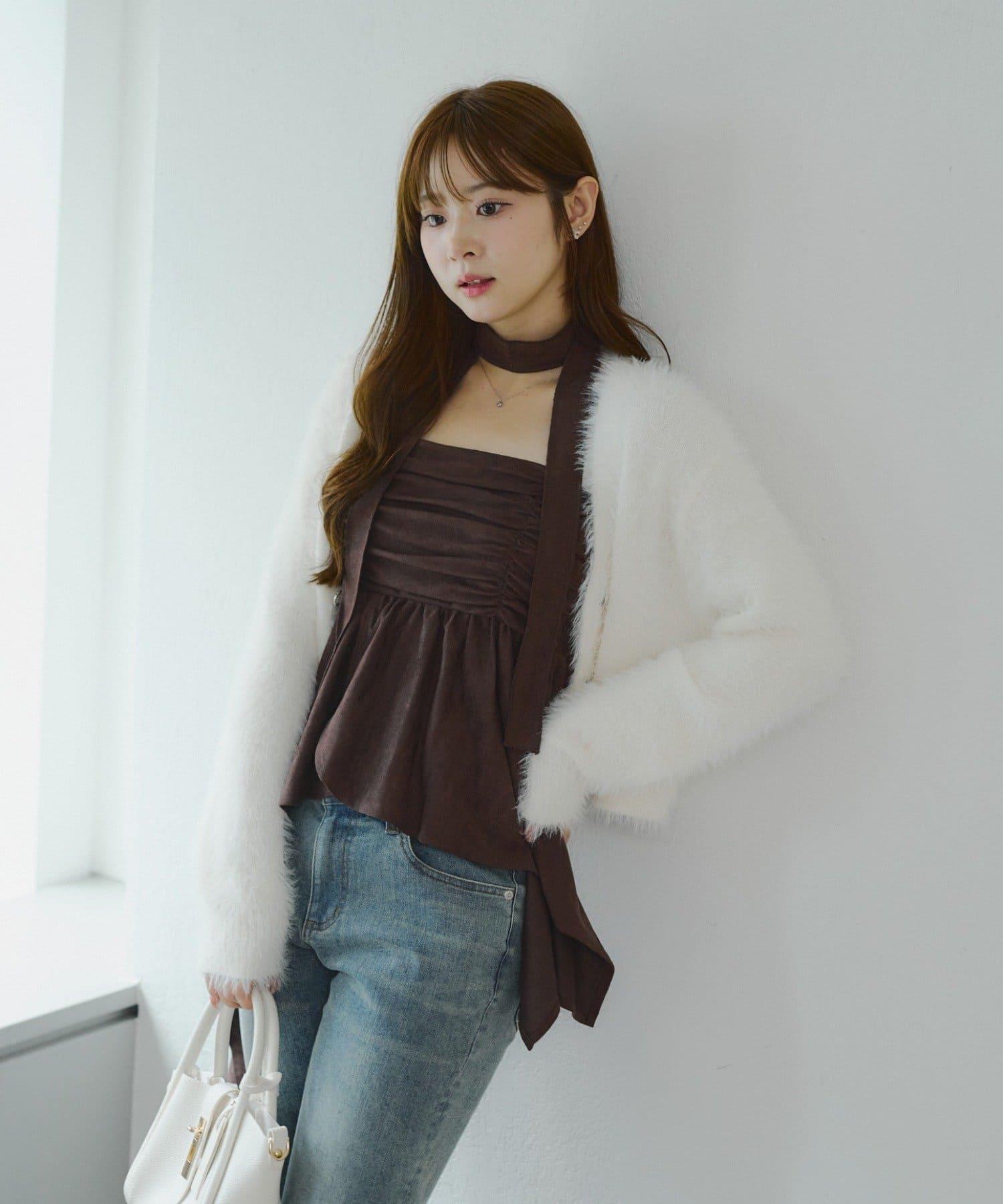 秋冬季節,可在蕾絲或薄紗 T 恤上疊穿一件開衫,打造嫵媚造型。