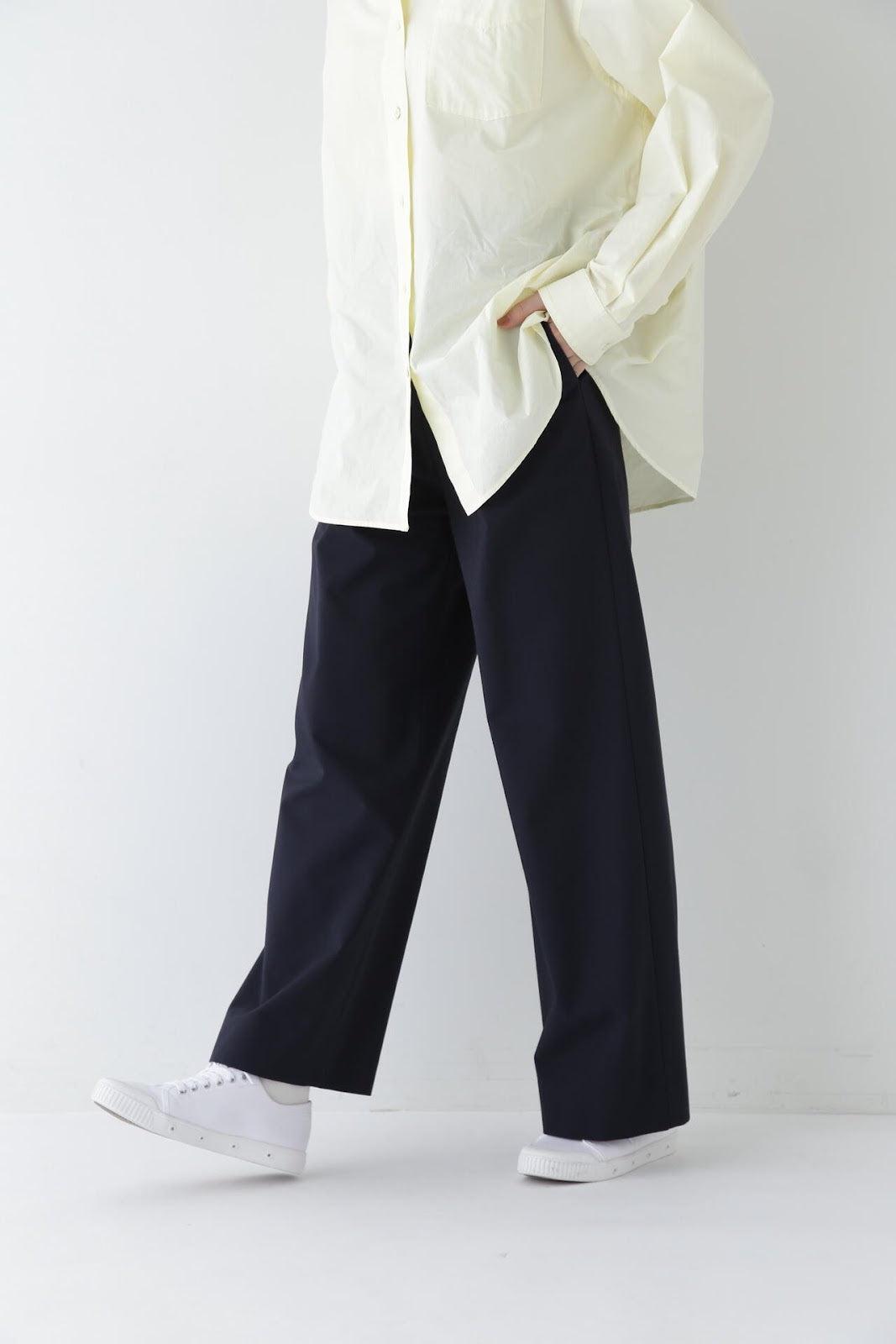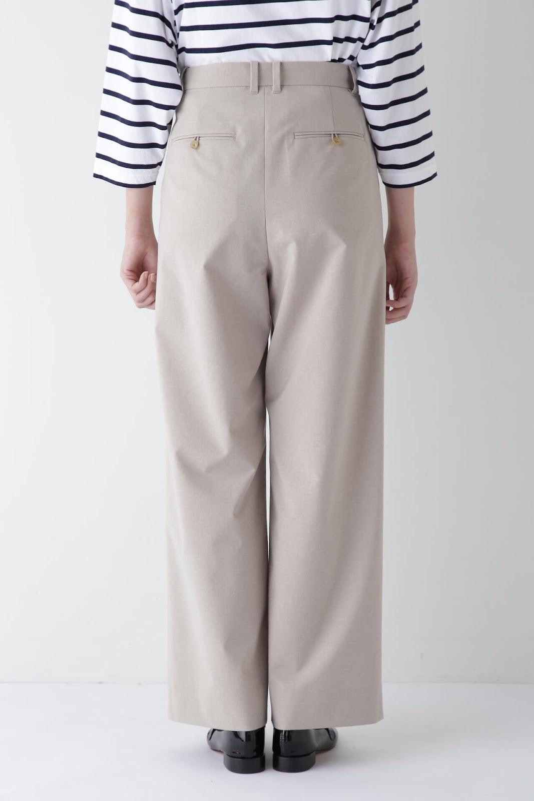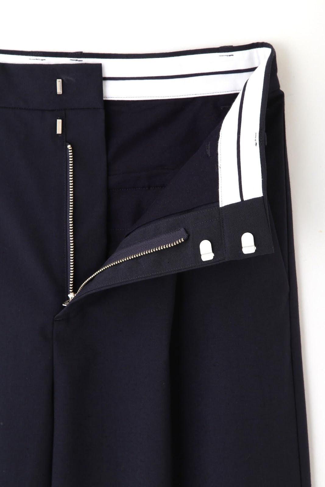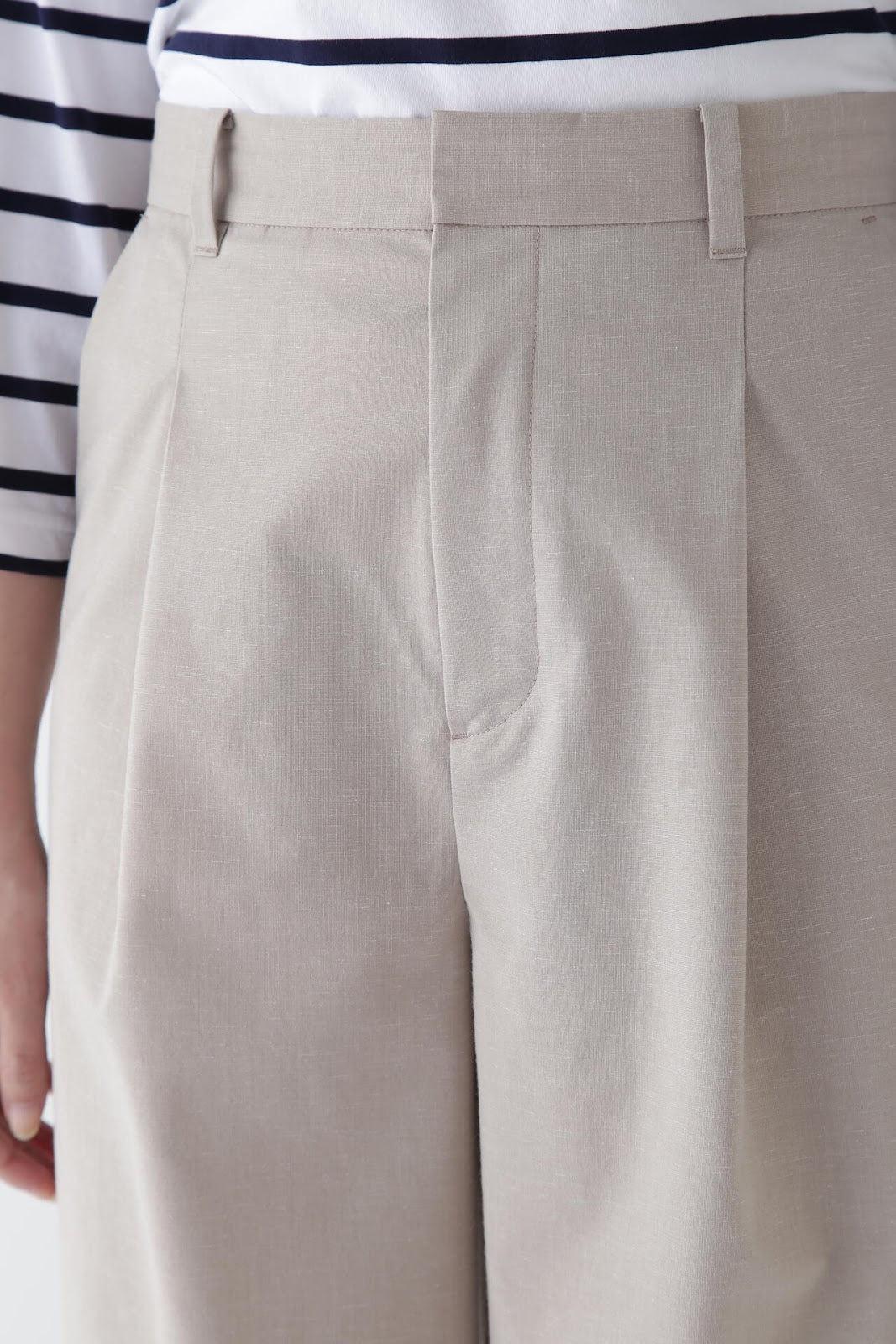 半寬鬆長褲,腰帶式規格,盡顯男士風範 [設計特色] 這款單襉半寬鬆長褲剪裁簡潔,成熟穩重。前開口可以拆下,腰部向後摺疊,露出腰帶式規格。面料由 TR府綢製成,這是一種亞麻混紡面料,表面光潔美觀。該面料還具有良好的自然伸縮性,穿著舒適。這款長褲設計簡潔,用途廣泛,但我們也建議在上衣內搭時穿著,腰部向後摺疊,以展示奇妙的腰帶設計。也可與同種面料的外套搭配穿著。