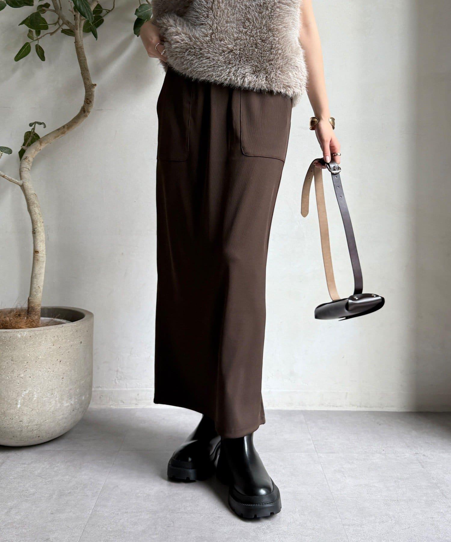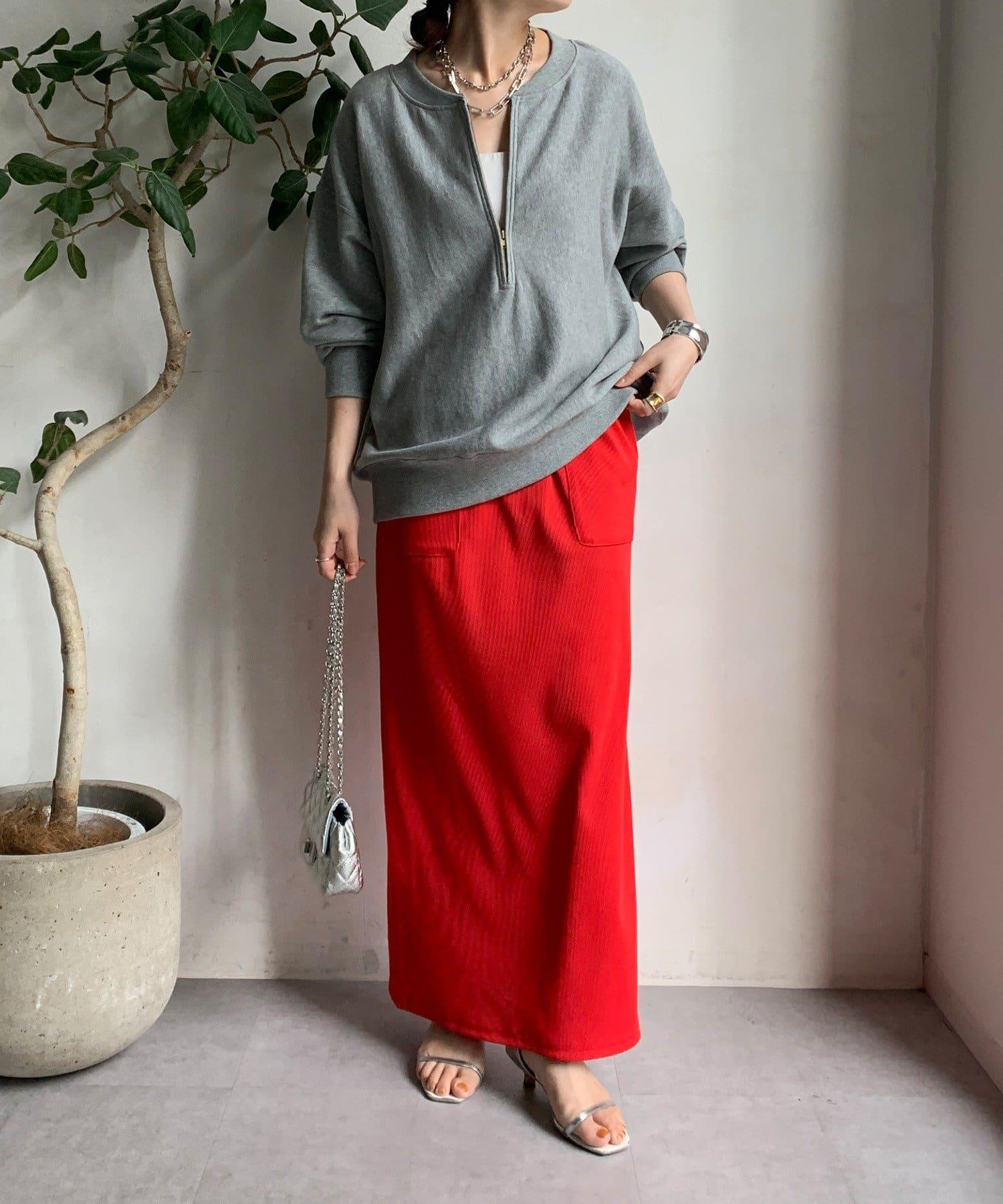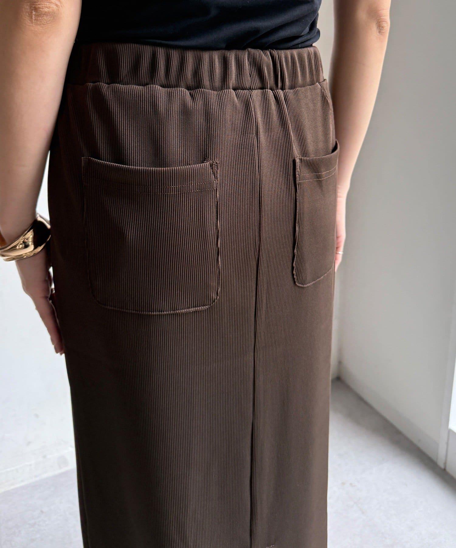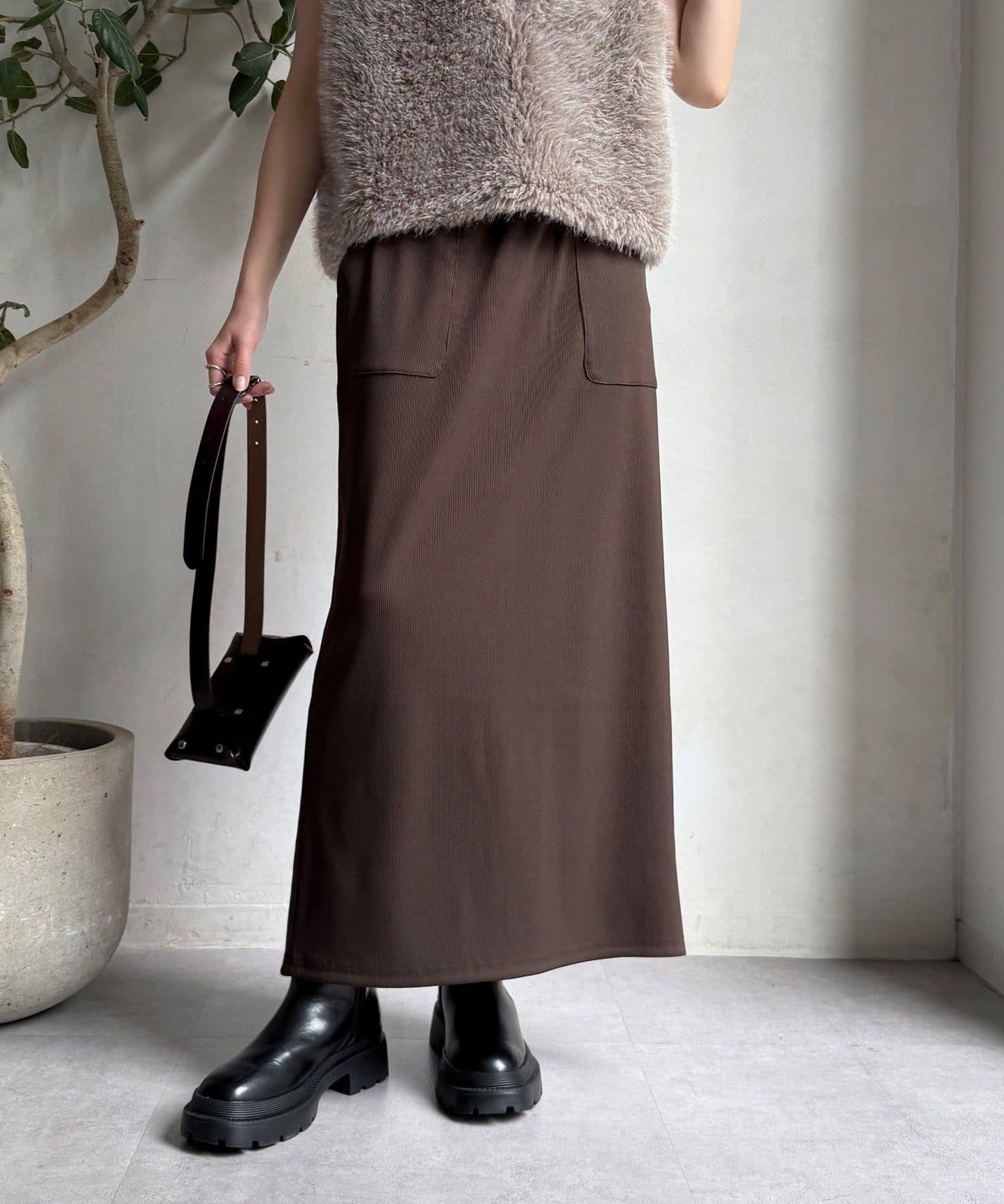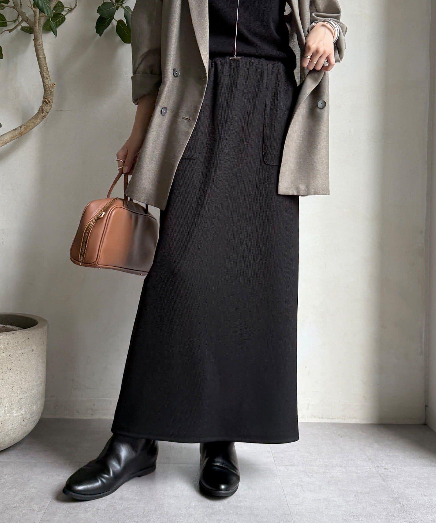 羅紋簡易半身裙,採用 I 字形廓形,營造出成熟的氛圍。