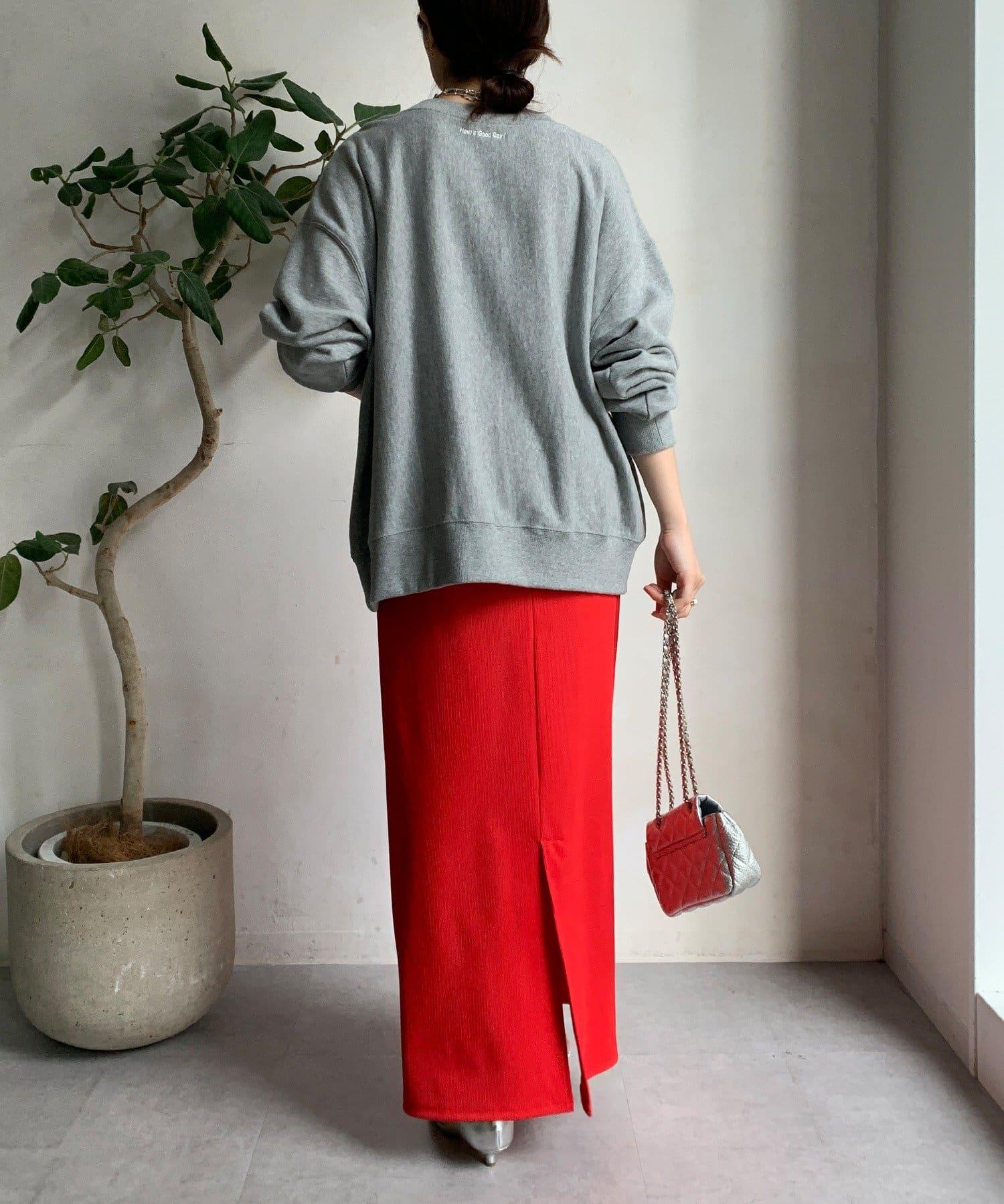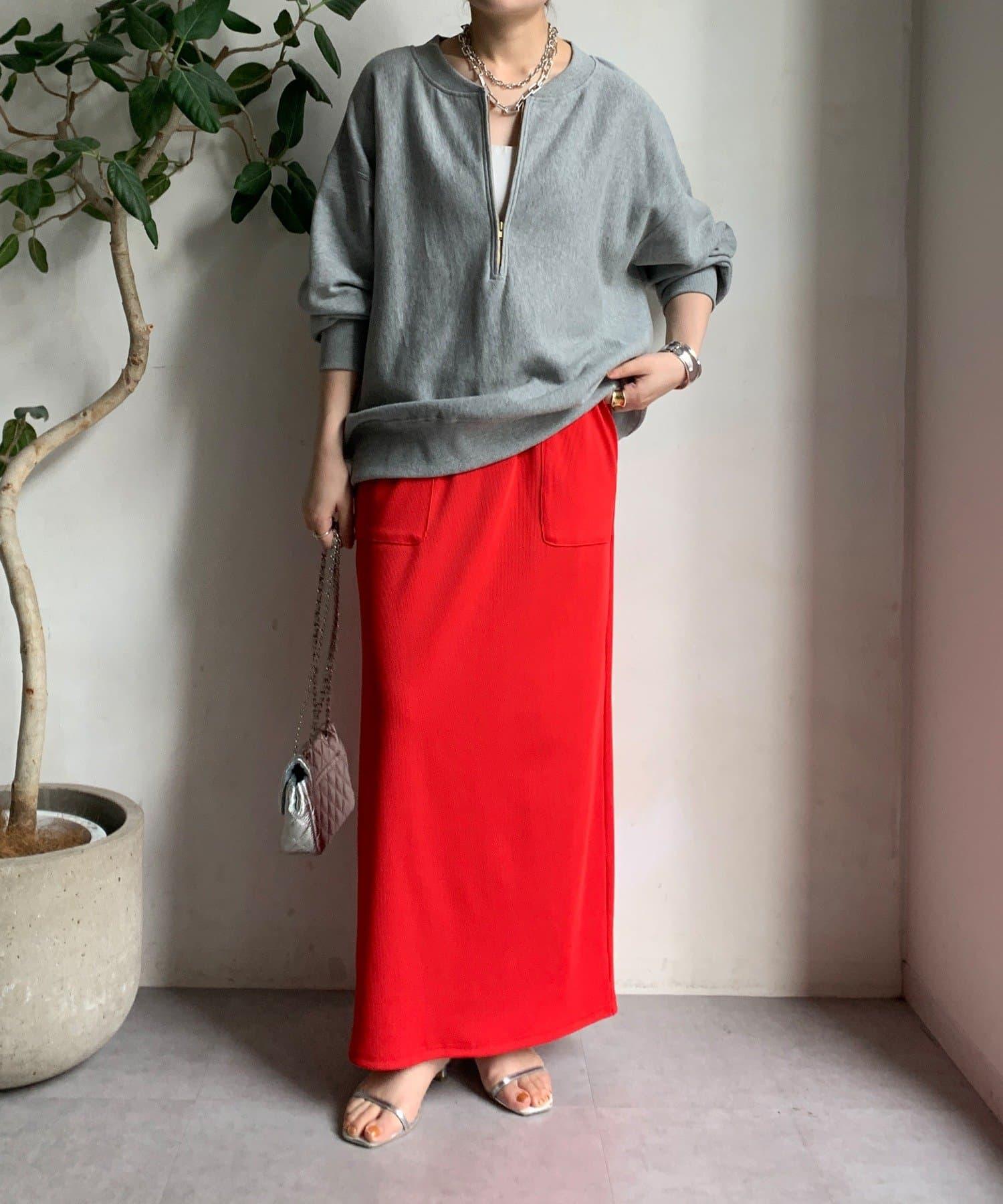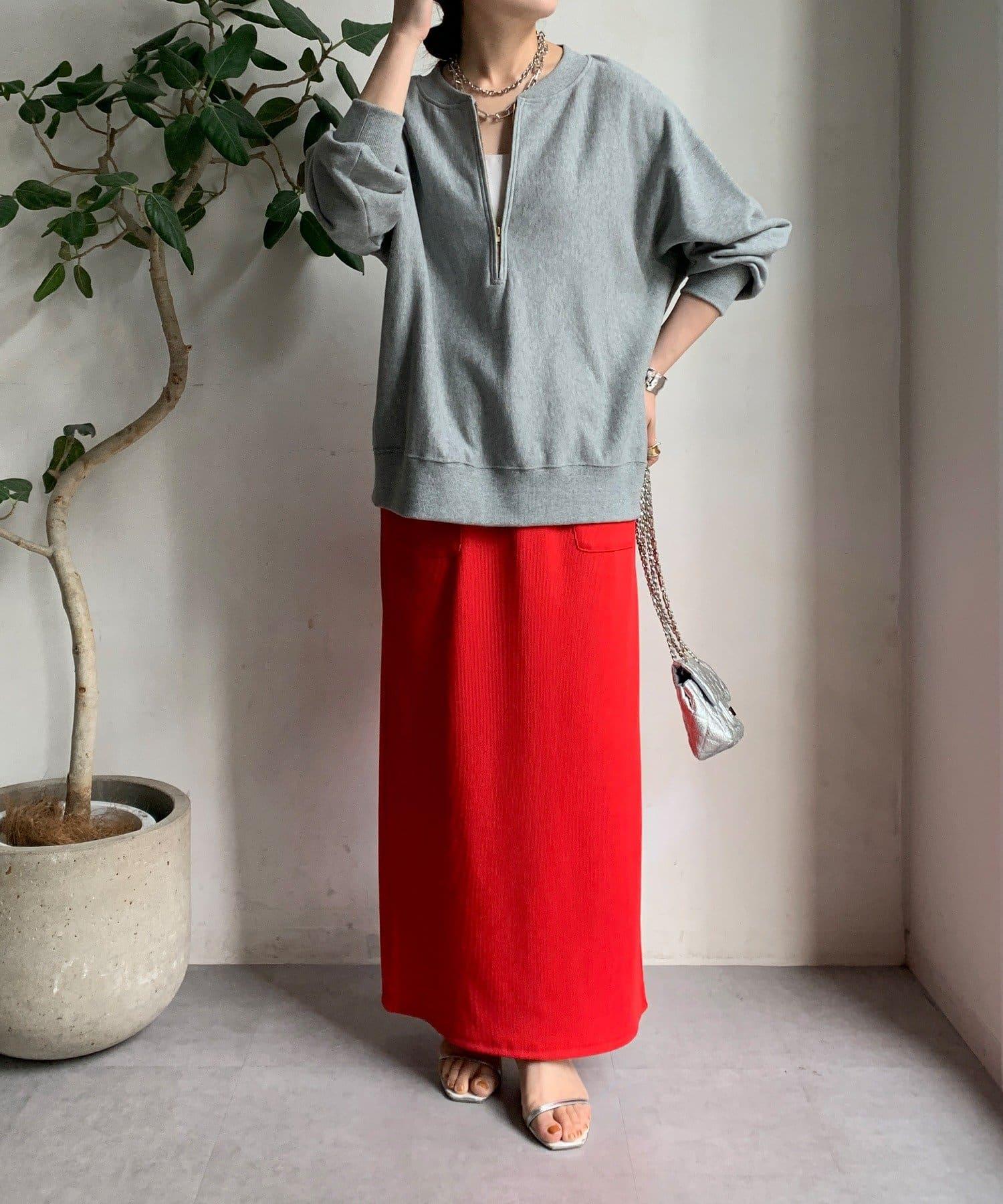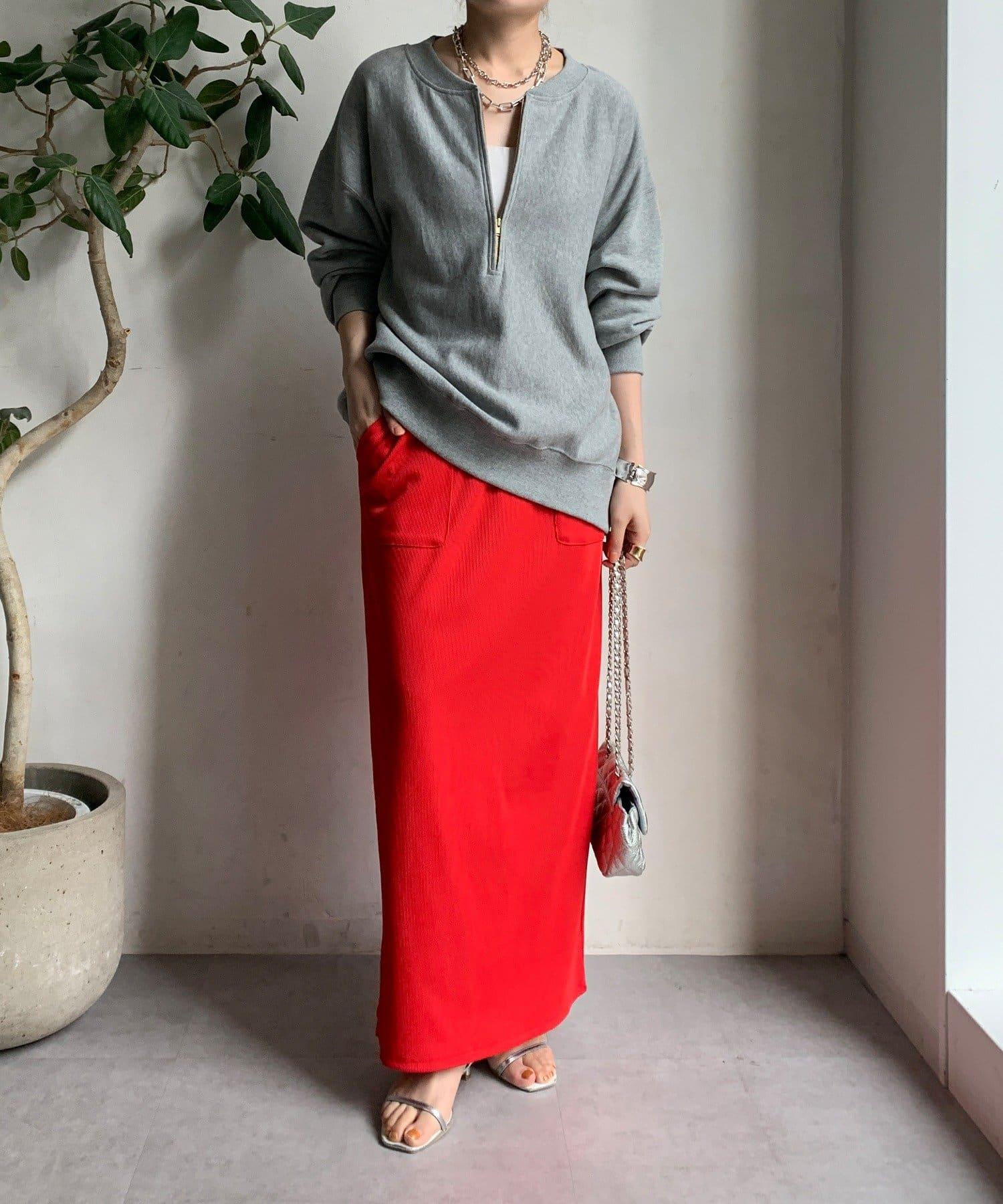 羅紋簡易半身裙,採用 I 字形廓形,營造出成熟的氛圍。