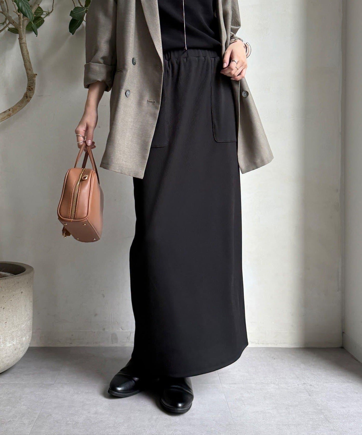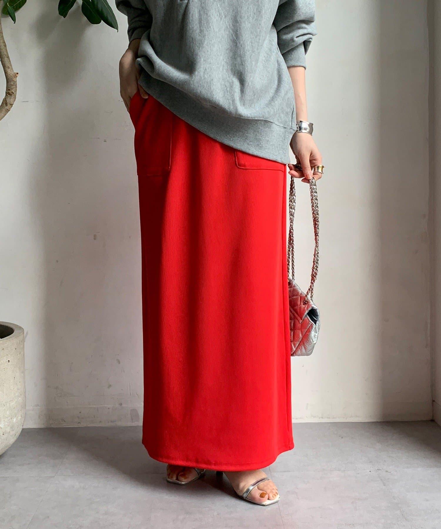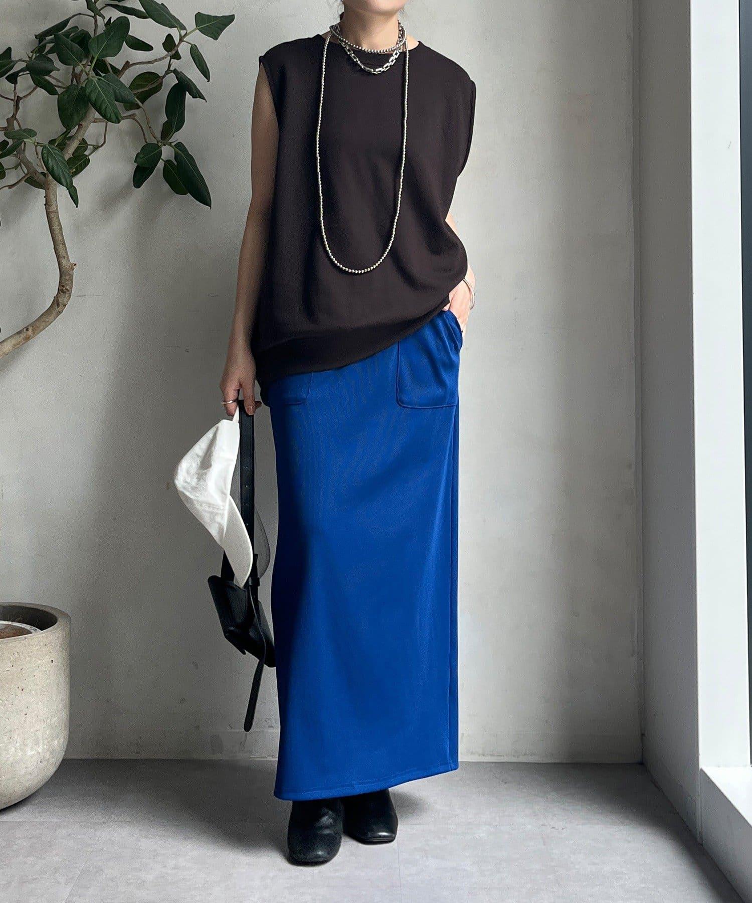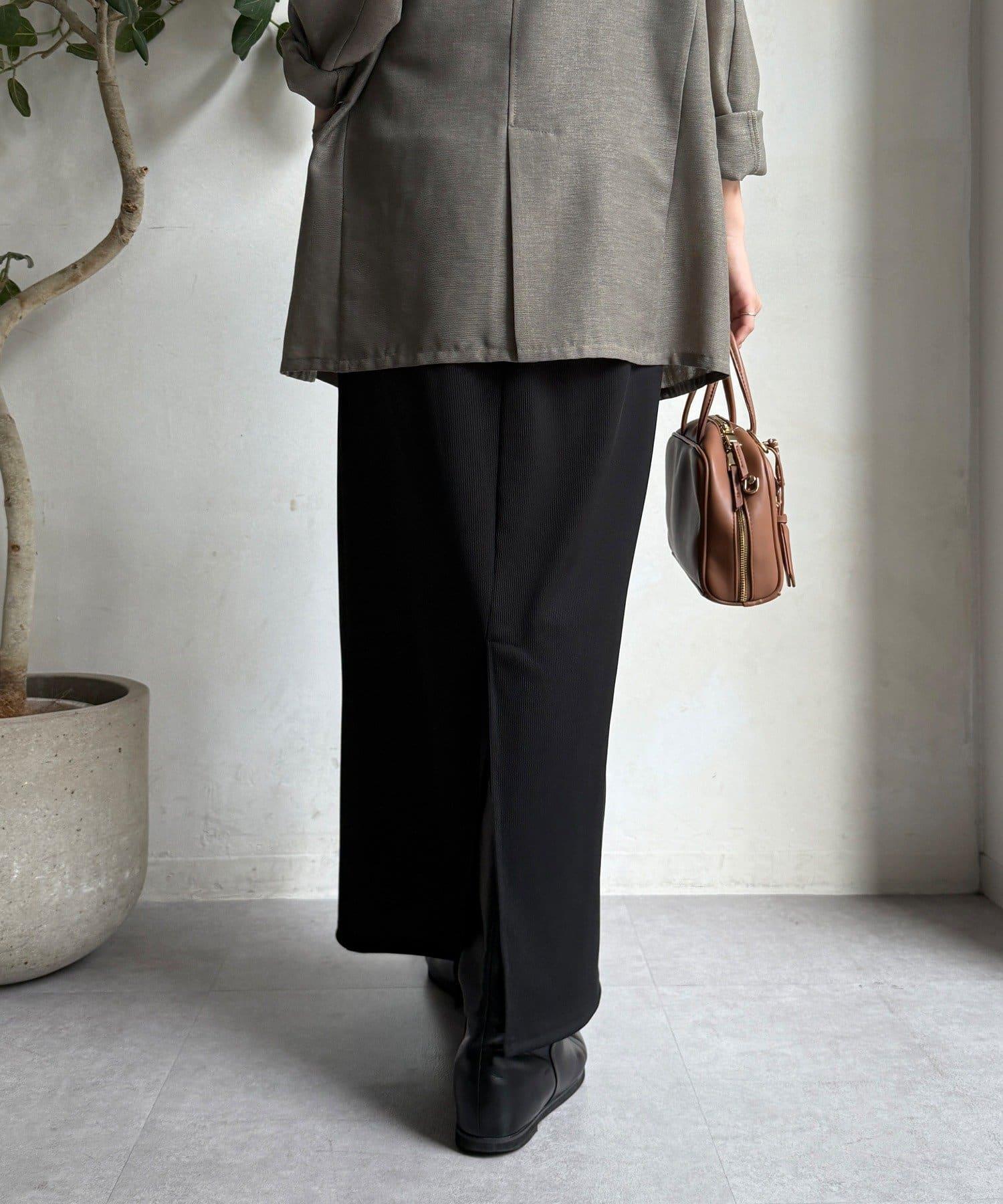 羅紋簡易半身裙,採用 I 字形廓形,營造出成熟的氛圍。