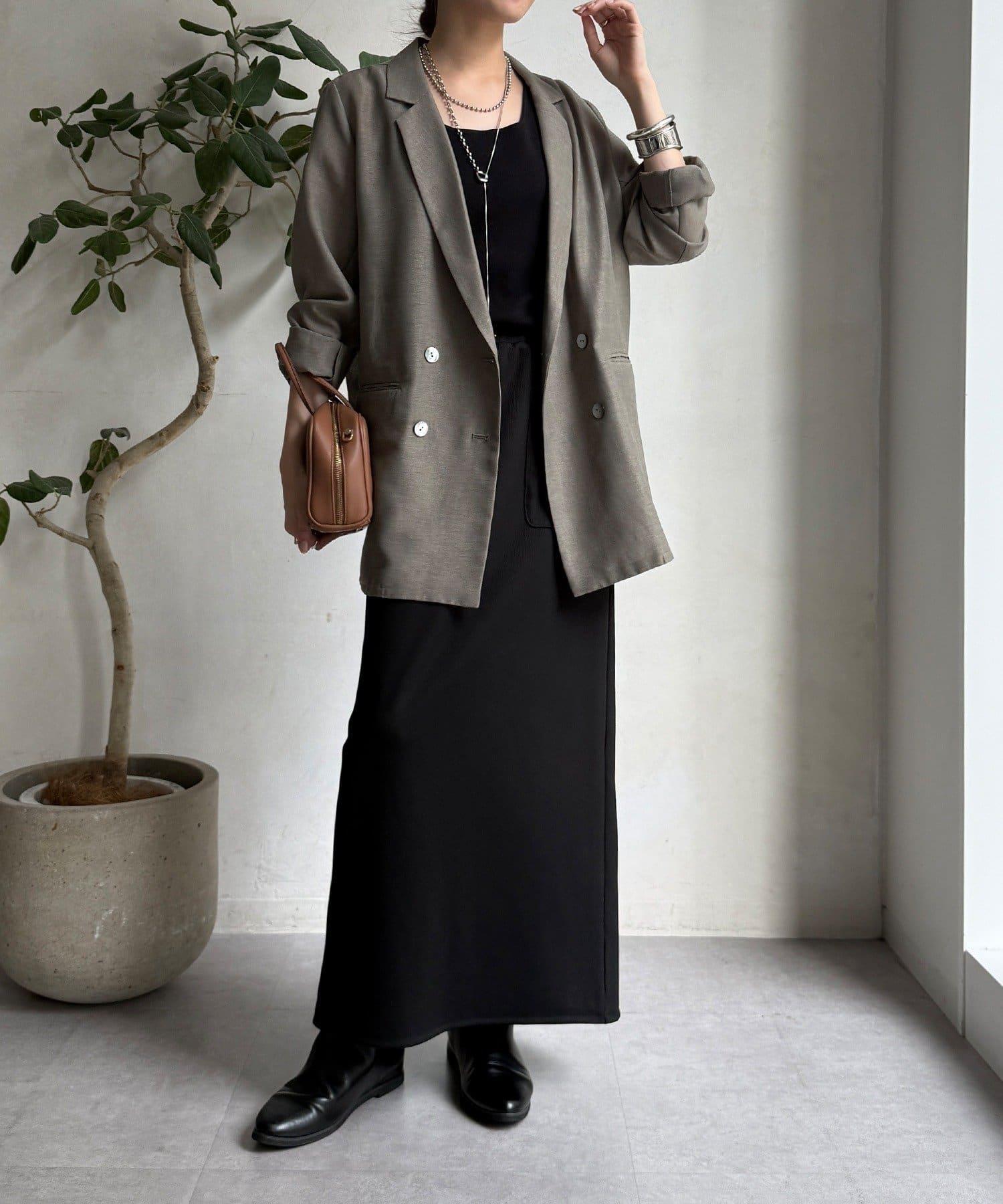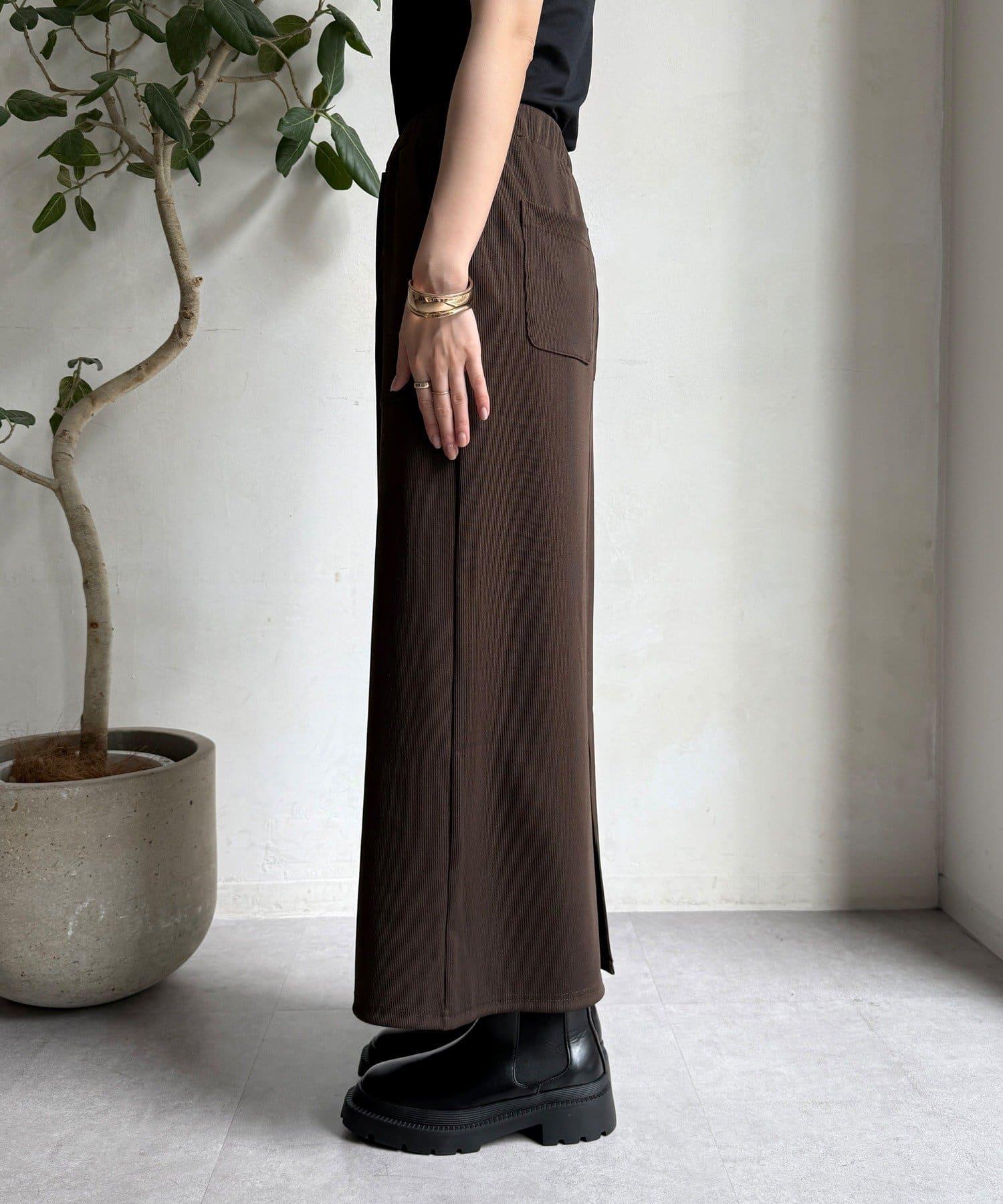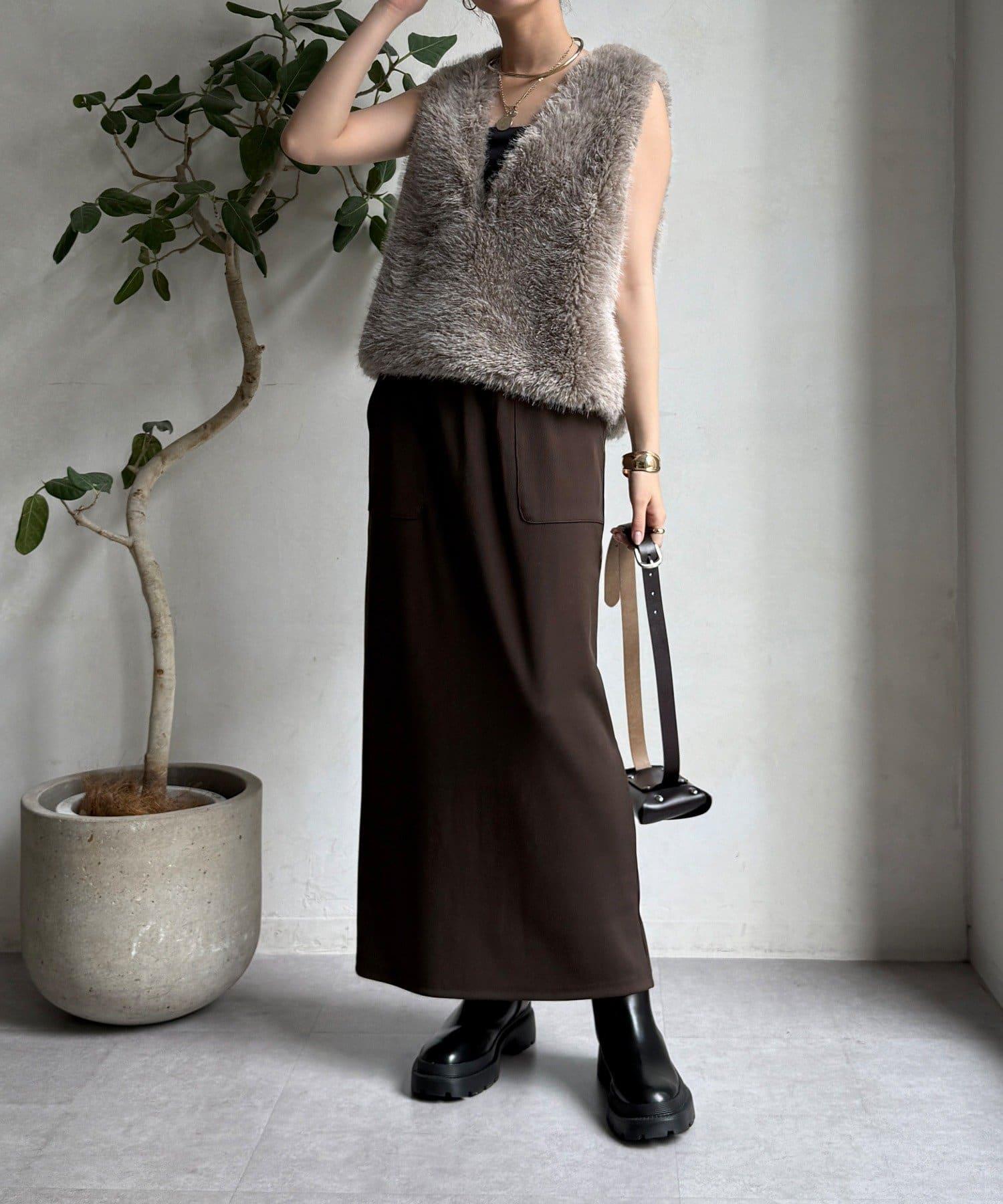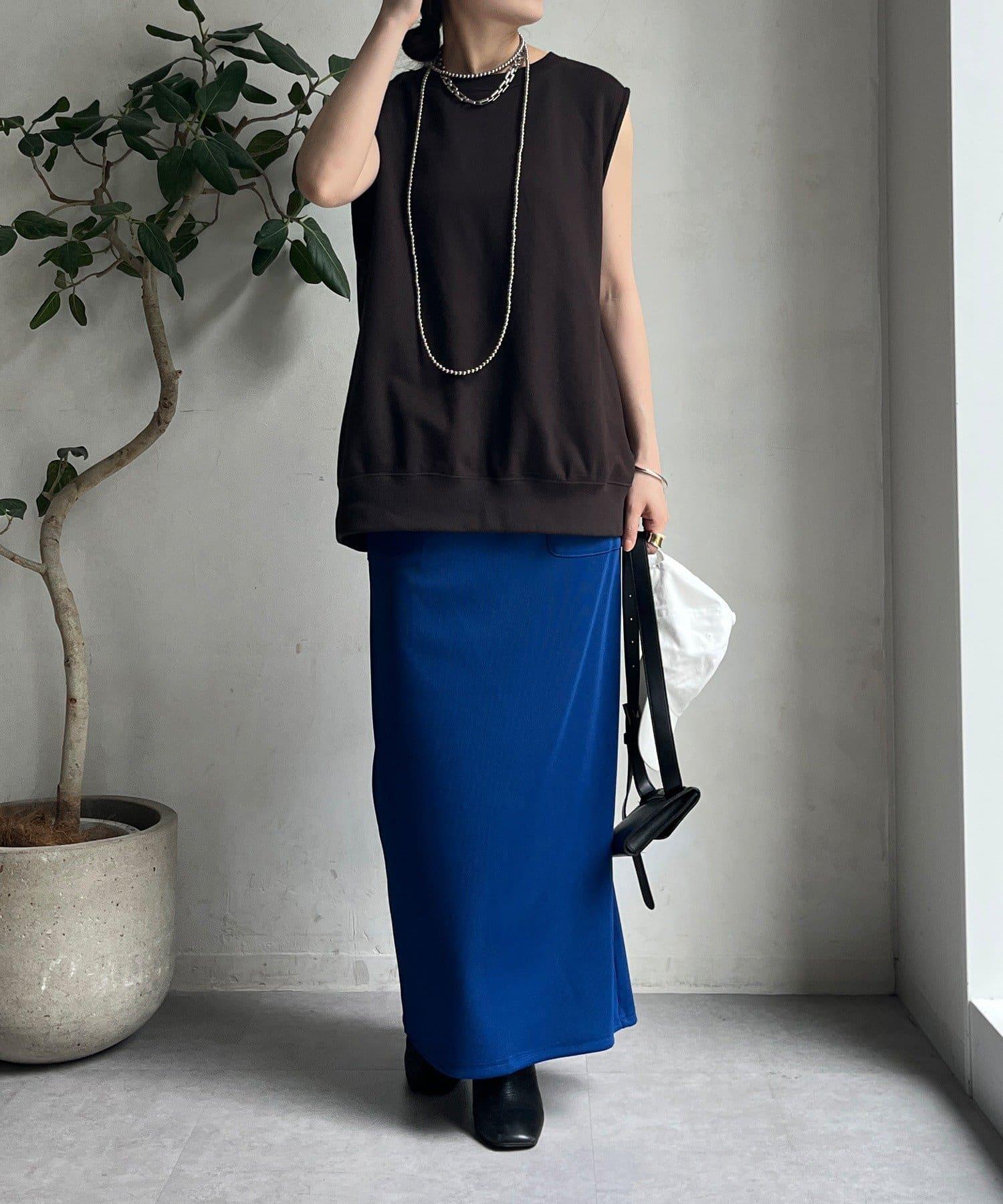 羅紋簡易半身裙,採用 I 字形廓形,營造出成熟的氛圍。