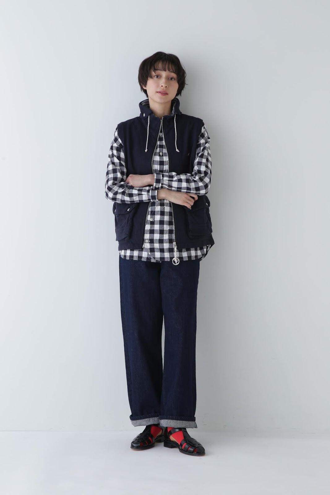 橙色滌綸連帽被塞進立領的圓領內,可以不戴連帽。其輪廓為箱型,後部有長長的圓形下襬,前部為方形,具有運動服裝中常見的功能規格。這是一款方便的馬甲,三季都可穿著,易於疊穿。正面是素色的,背面是帶有邊框的原始棉質襯裡。它是一種通過在反面填充邊線的程度,使其無法透視到表面,從而對外衣的背毛進行加工的材料。natic] na = 海軍,t = 技術,i = 創新,c = 概念。