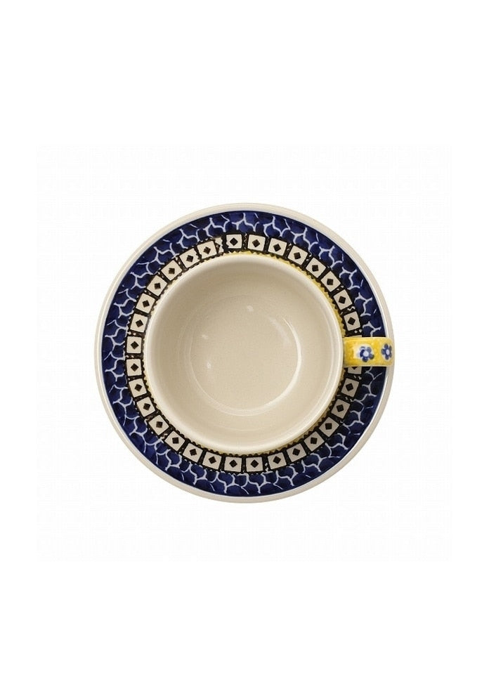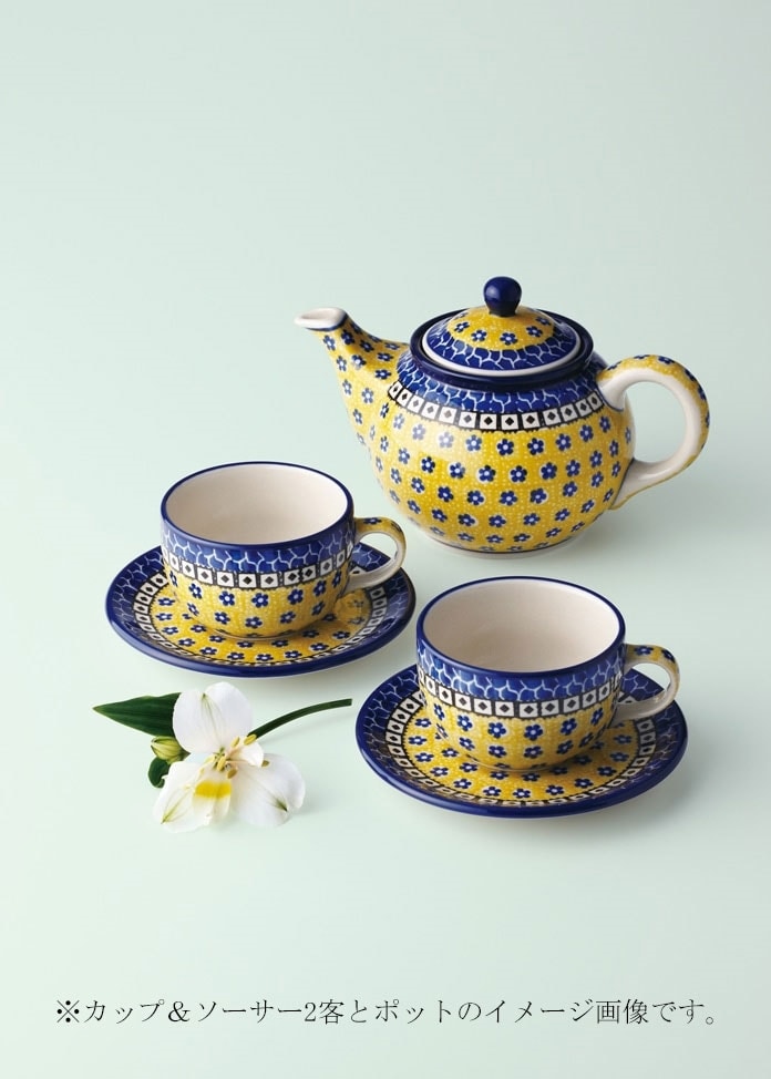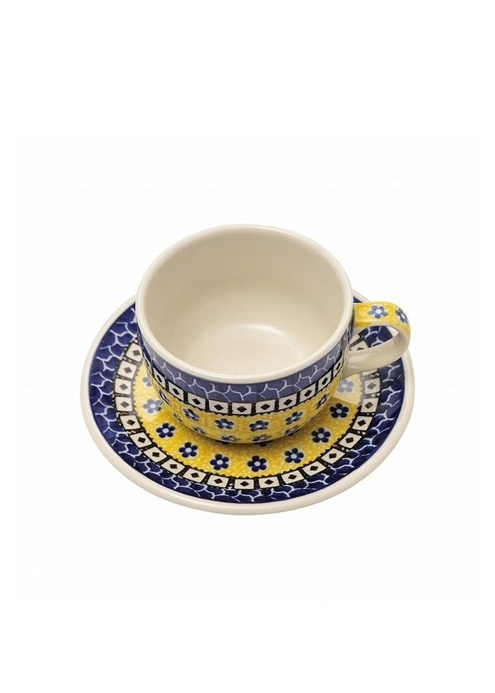 這個杯碟的形狀是用來喝茶的。茶葉在高溫下衝泡時味道更好,所以杯子的內孔直徑很大,這樣更容易使溫度下降。該設計來自紅花系列,花紋是黃色的,給人一種自然明亮的感覺,而靛藍則是Ceramica的基本色。這個流行組合是為了裝飾餐桌而設計的。設計師Teresa Riana設計了許多美麗的圖案,這些圖案在日本也很流行。