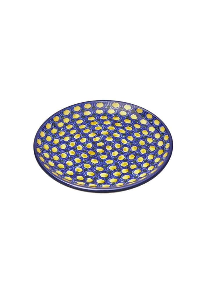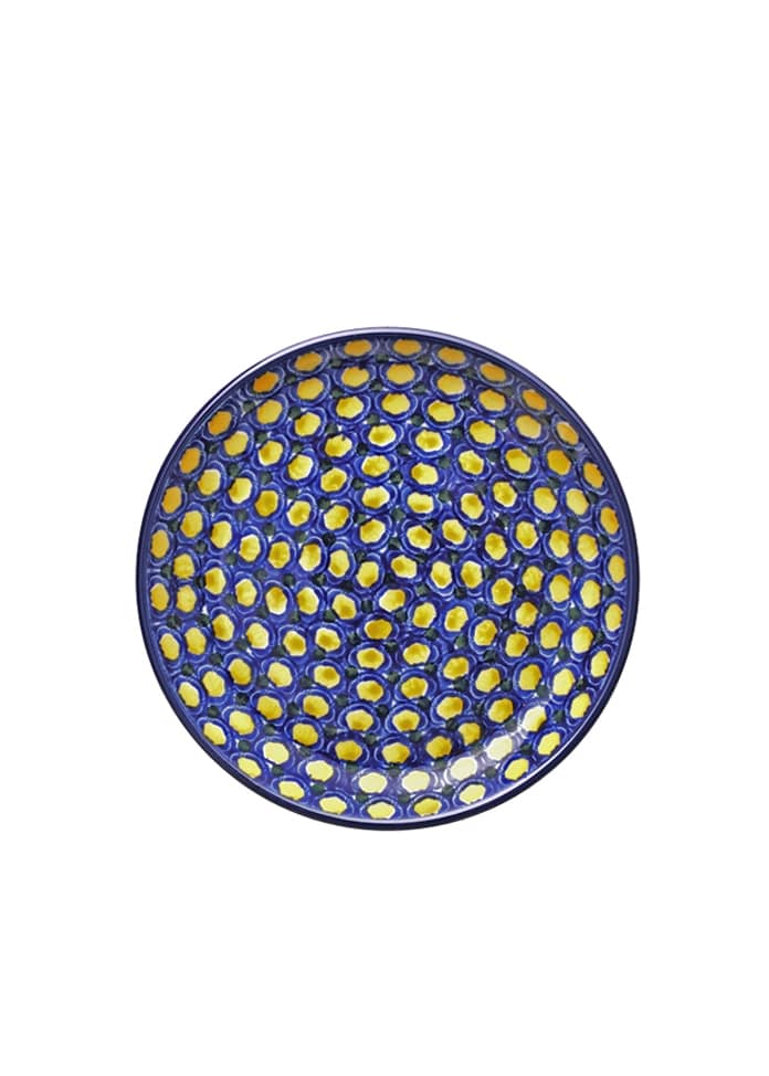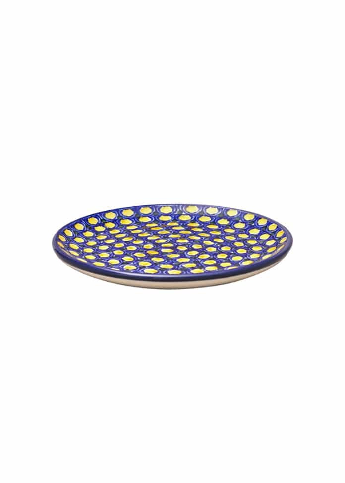 這個直徑為16厘米的盤子可以方便地將麵包和沙拉放在上面,也可以作為餐具使用。該設計來自鈷黃色系列。編織的圖案看起來像孔雀的眼睛,是典型的Bolesławiec陶瓷圖案。