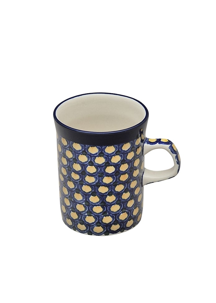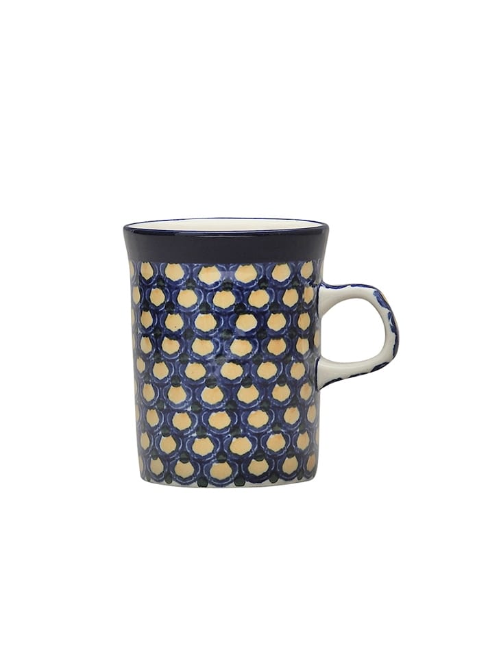 基本的圓柱形馬克杯很穩定,可以隨身攜帶。該設計來自鈷黃色系列。編織的圖案看起來像孔雀的眼睛(孔雀的羽毛),這是博萊斯瓦維茨陶瓷的典型圖案。