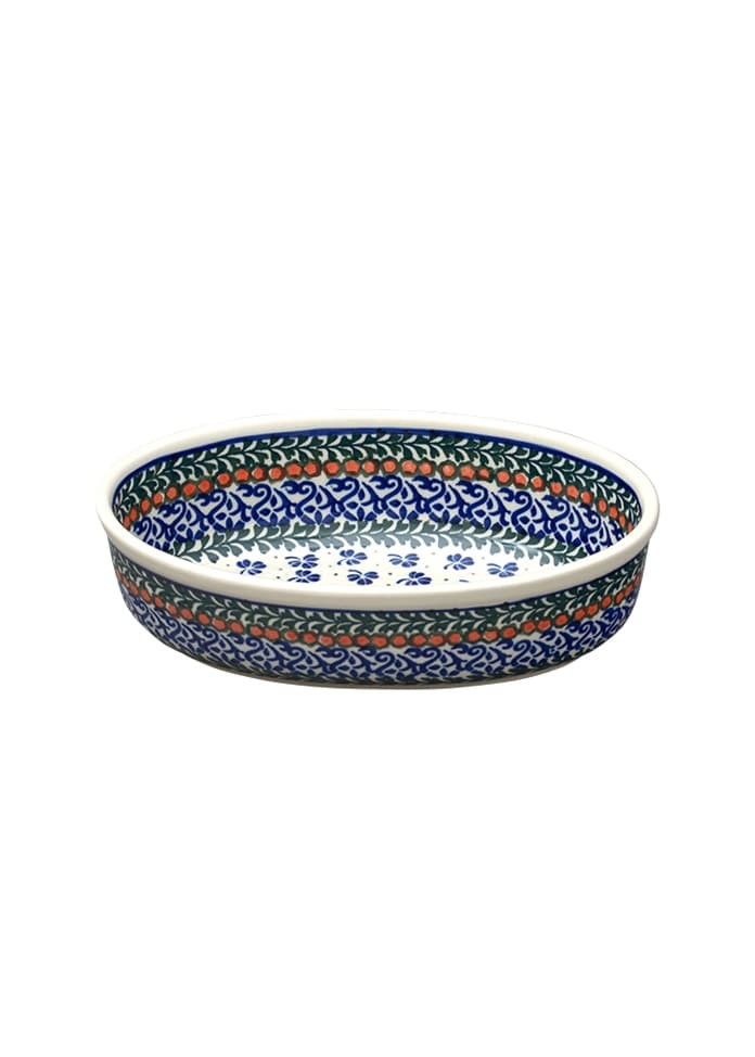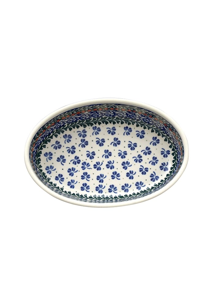 碗的形狀像一個小橢圓形,如果你有一個,無論是用於烤箱烹飪還是用於盛放咖喱或意大利麵,都是一個有用的物品。 這個設計來自 "Arena "系列,中間鑲嵌著藍色三葉草的自然設計。