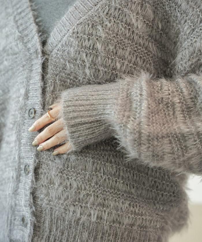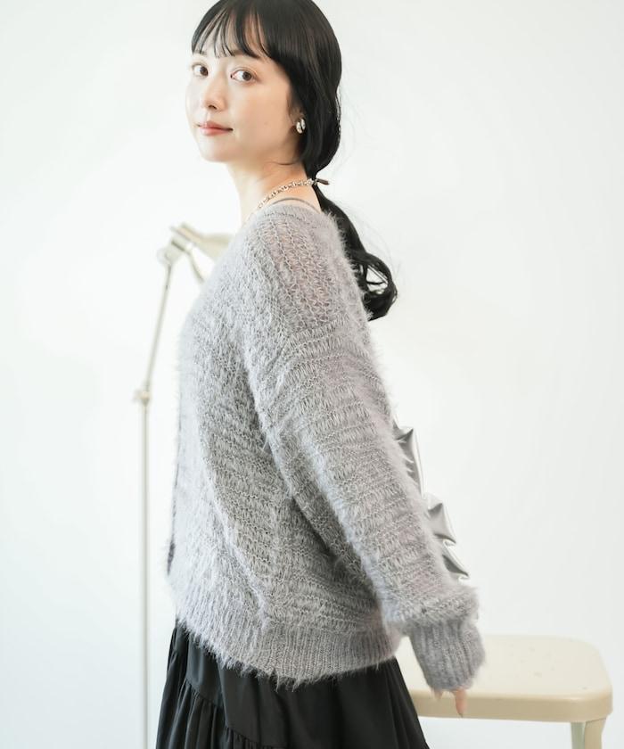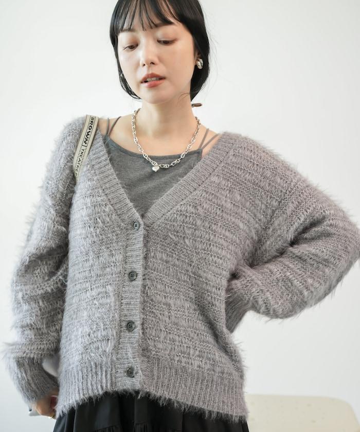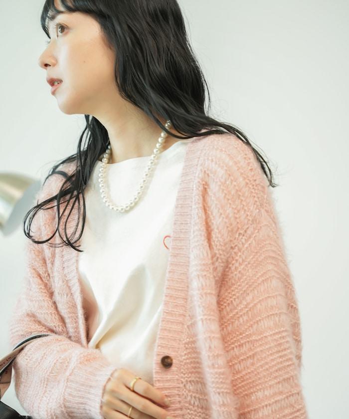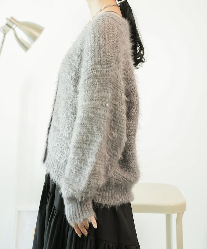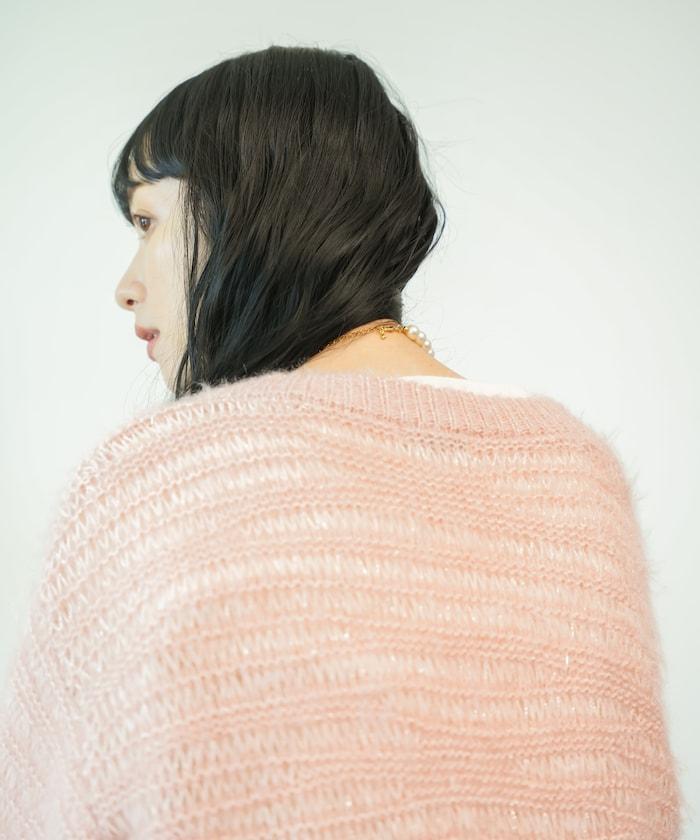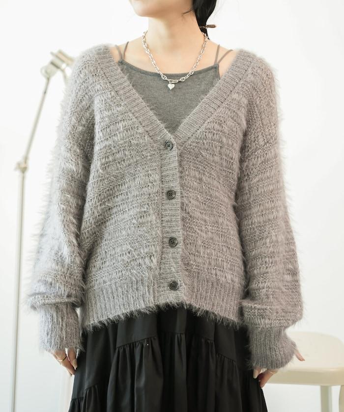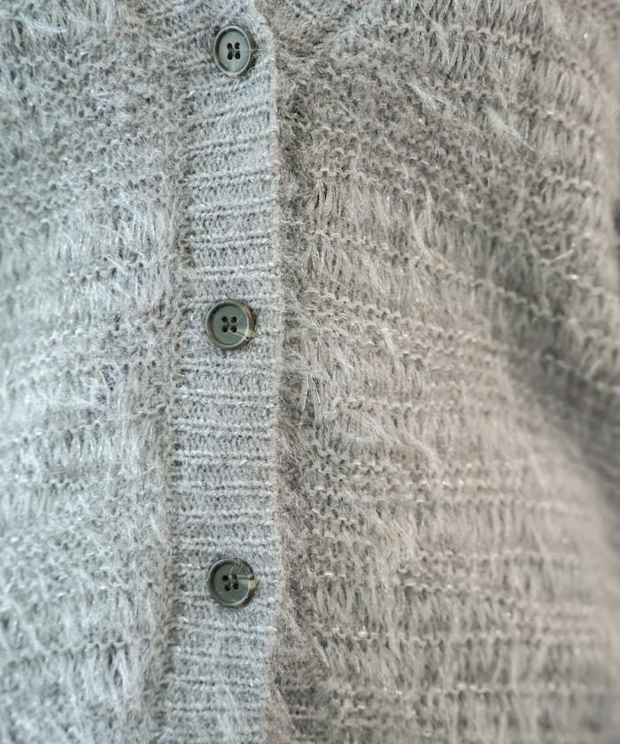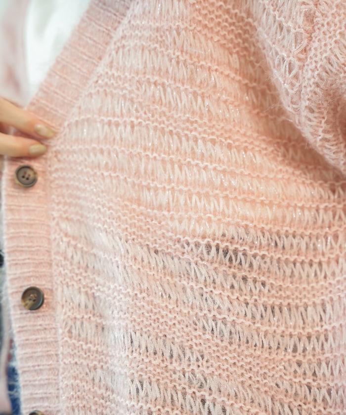 這款女性化開襟羊毛衫採用透明針織面料,手感柔軟蓬鬆。