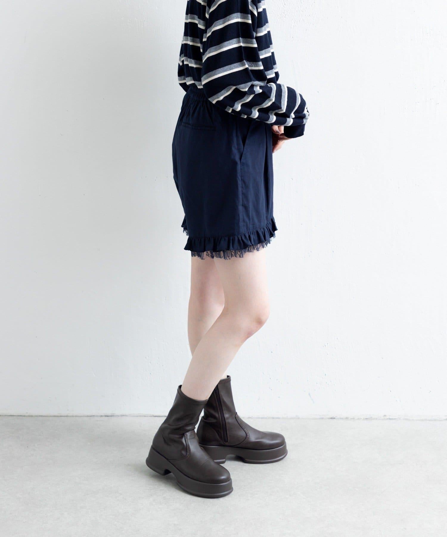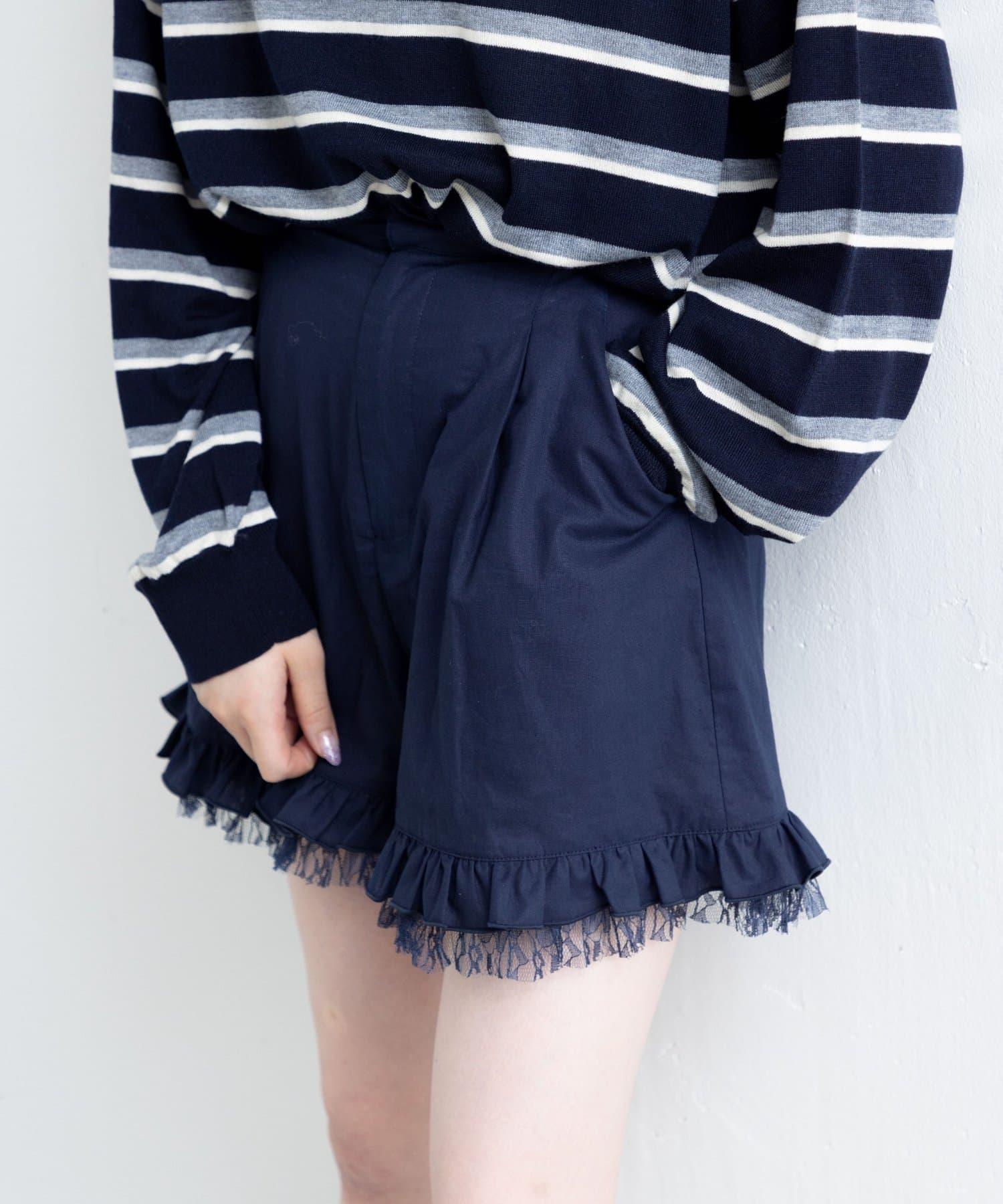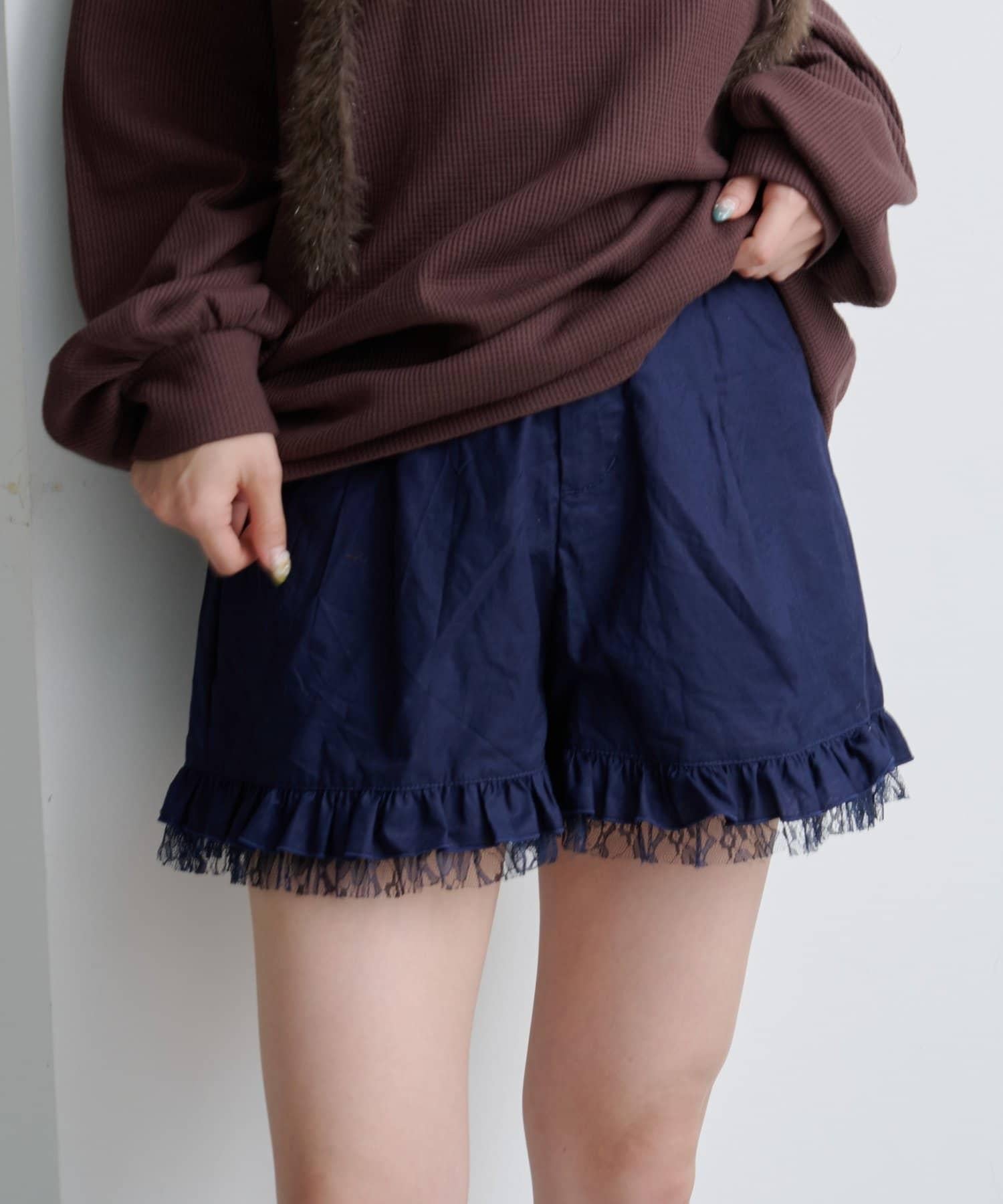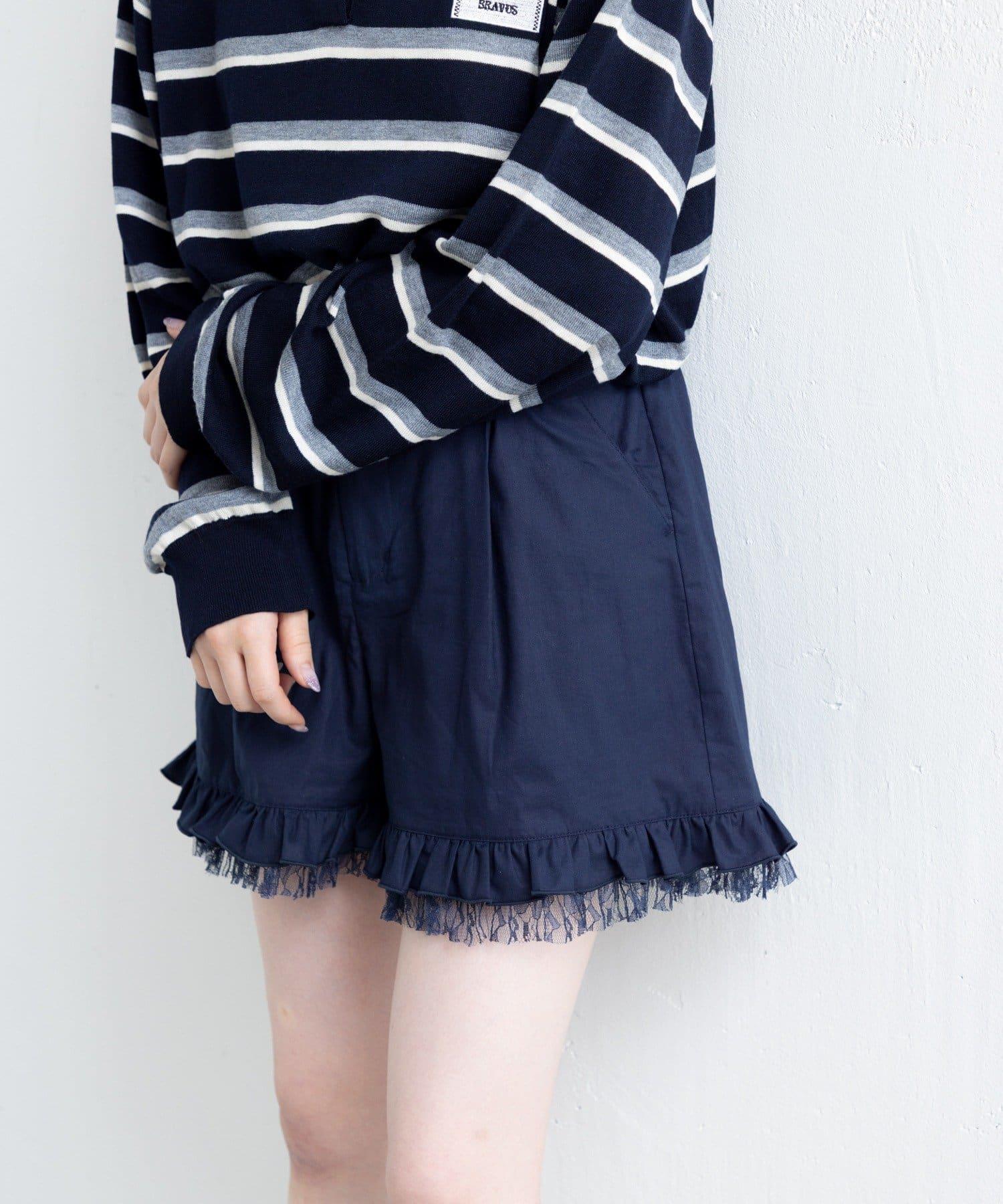 短褲下襬的雙層荷葉邊和精緻的蕾絲花邊十分搶眼。