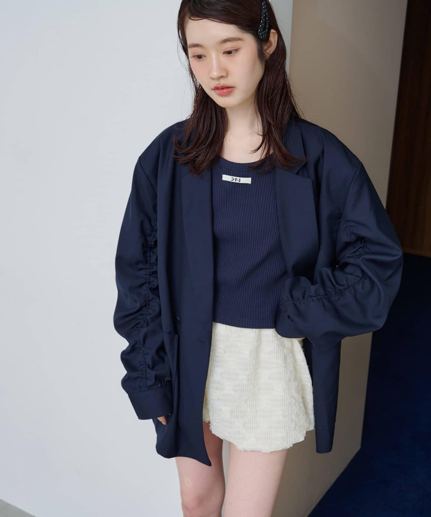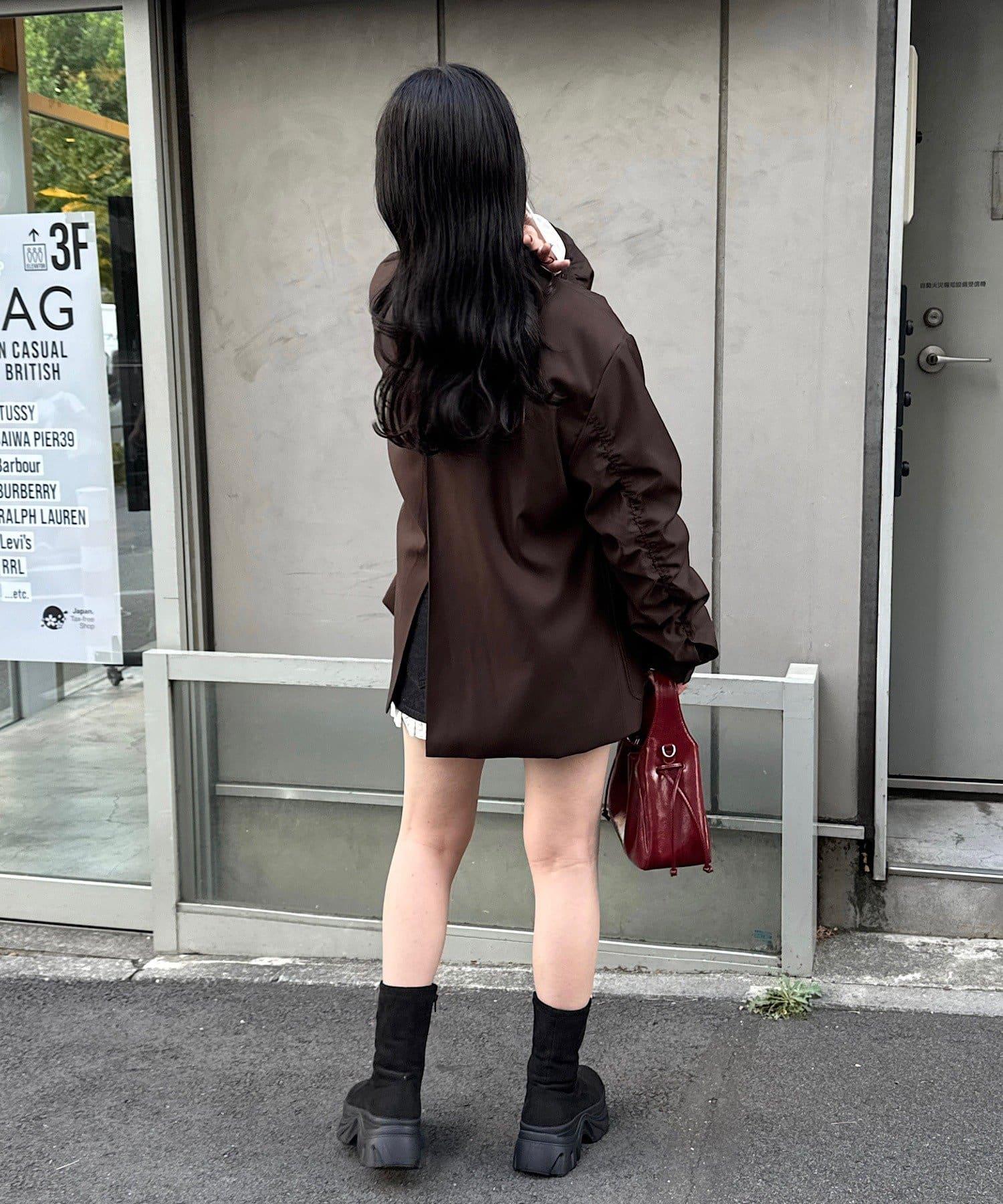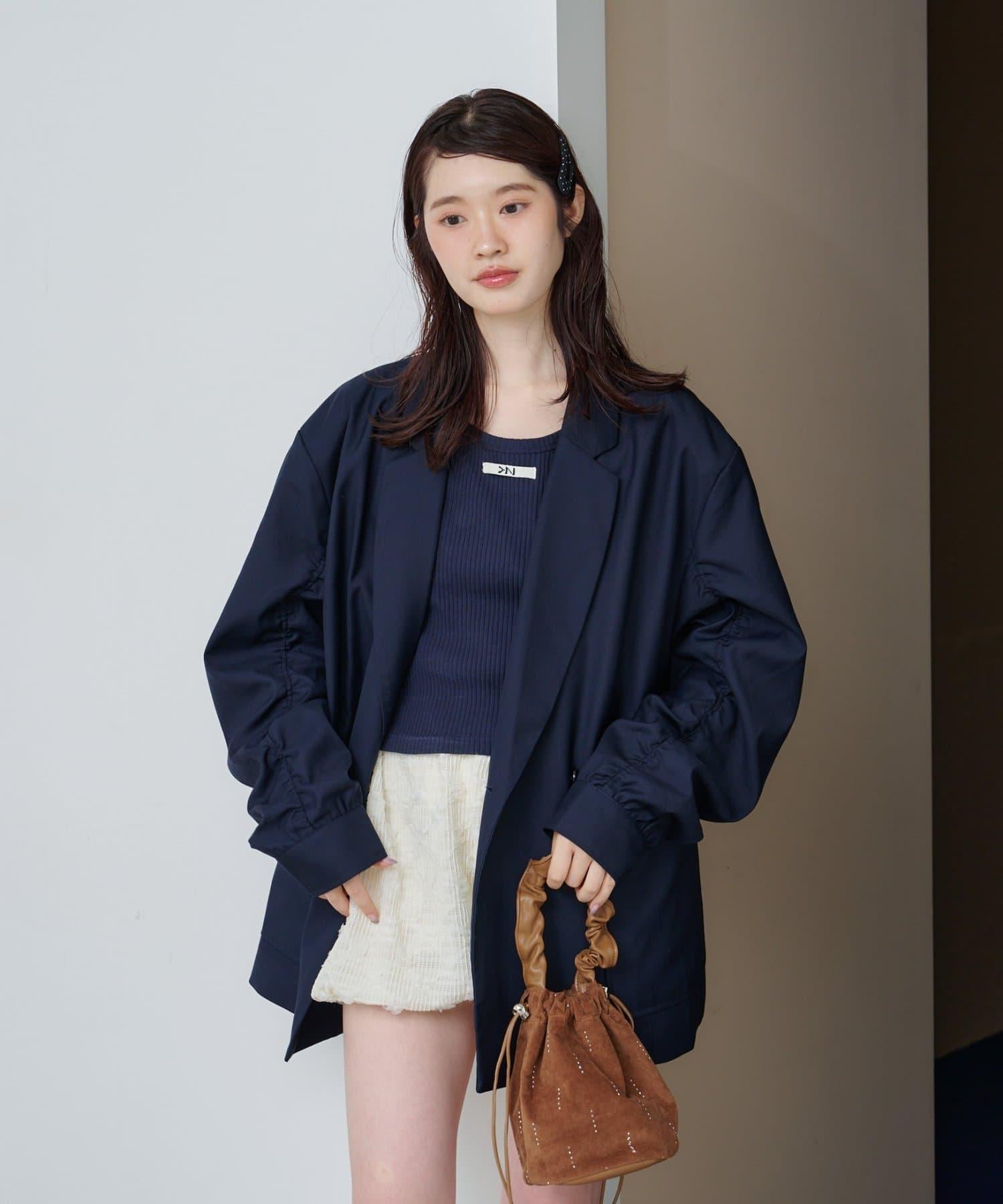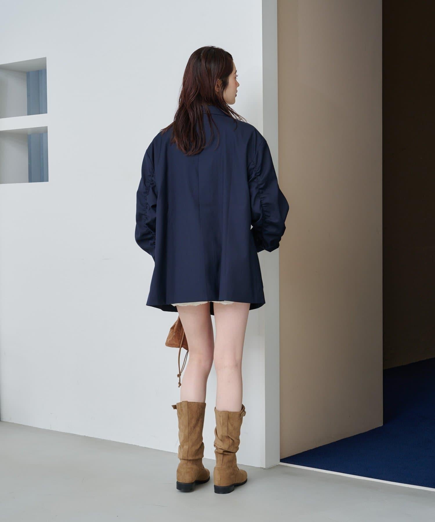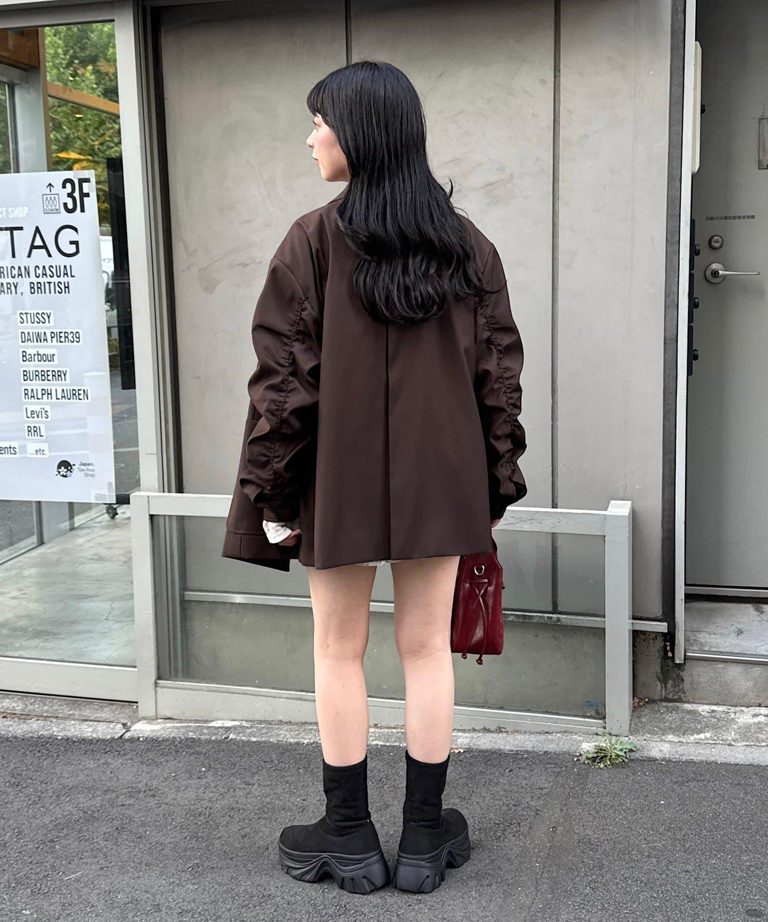 袖子上的聚攏細節十分搶眼,使這款夾克成為全場的焦點。