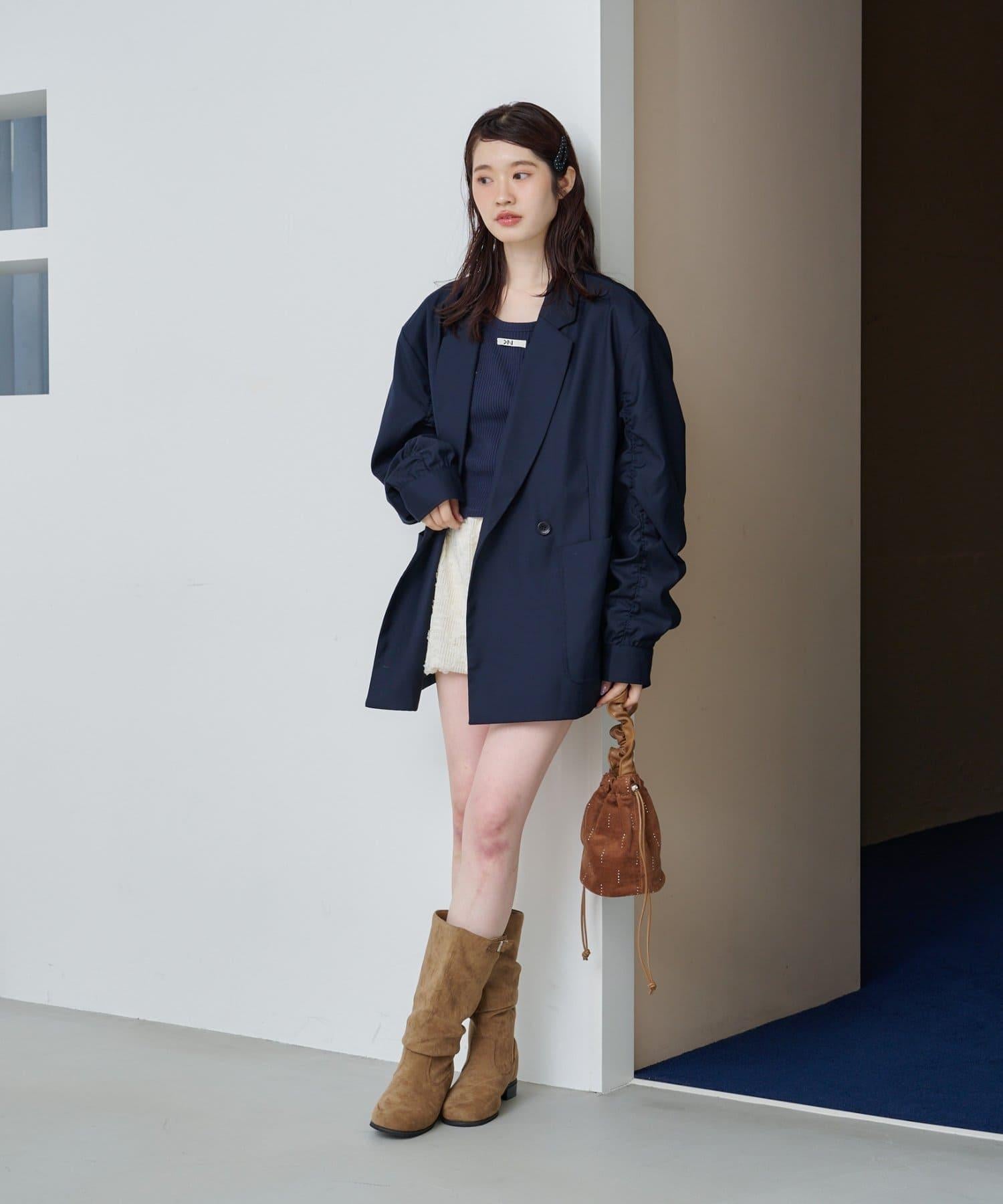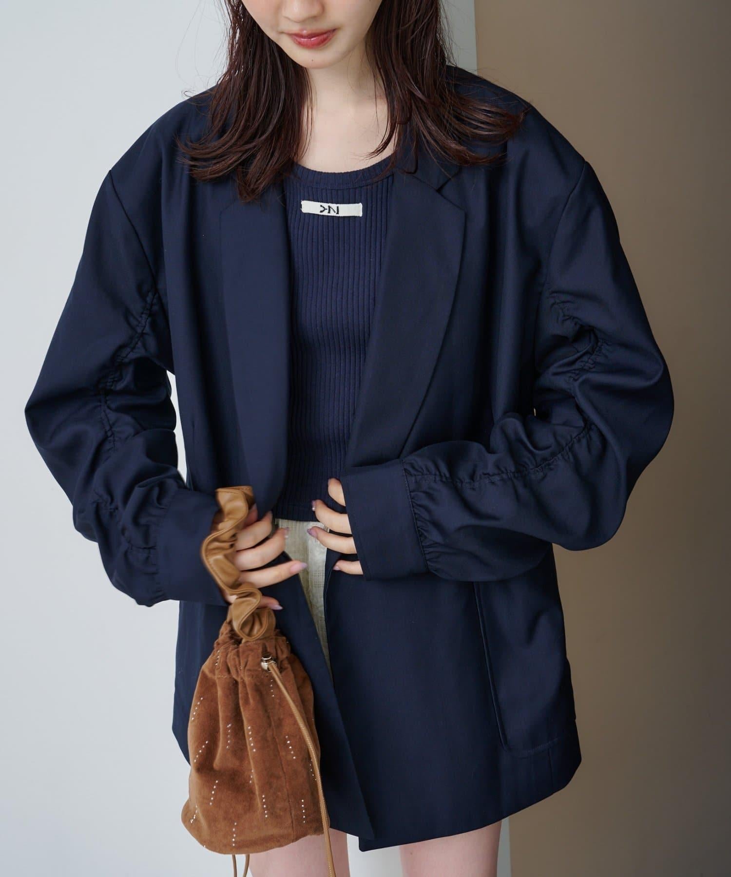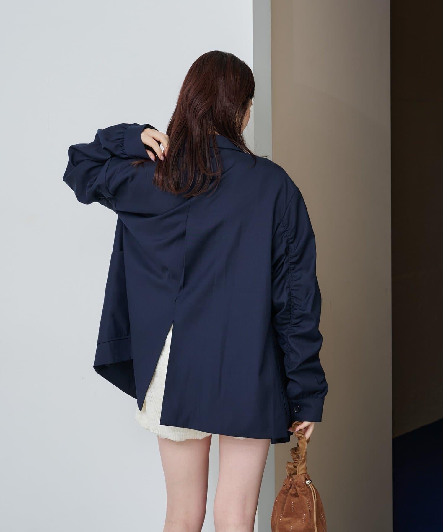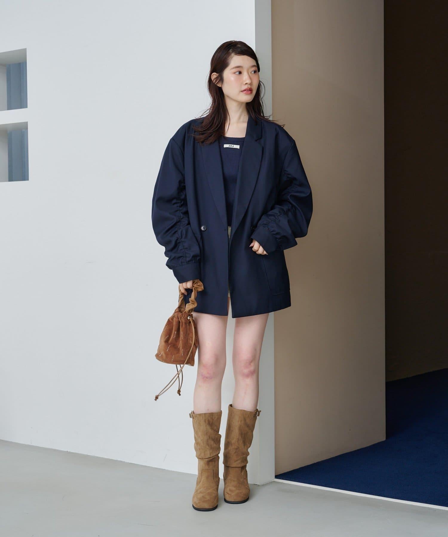 袖子上的聚攏細節十分搶眼,使這款夾克成為全場的焦點。