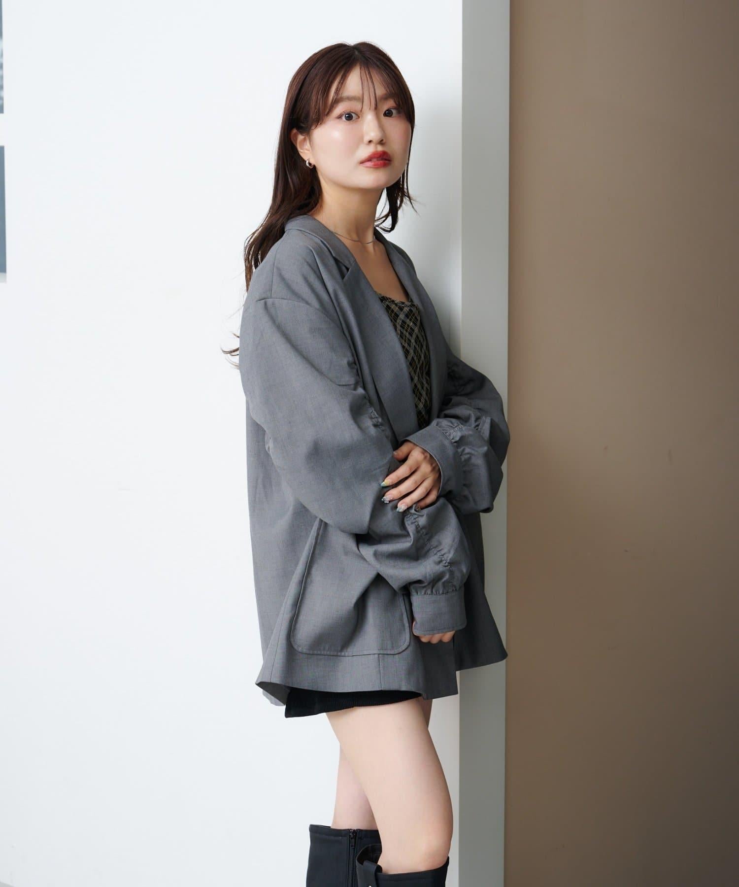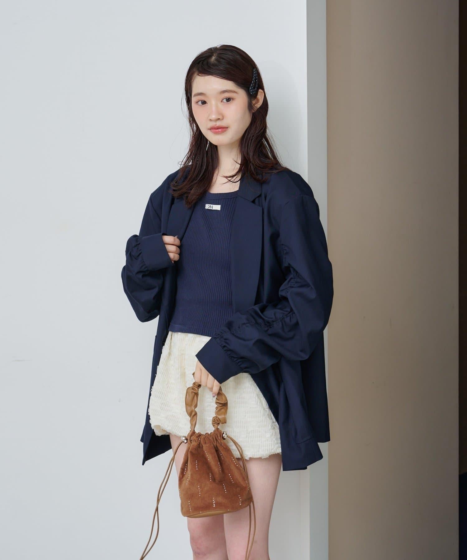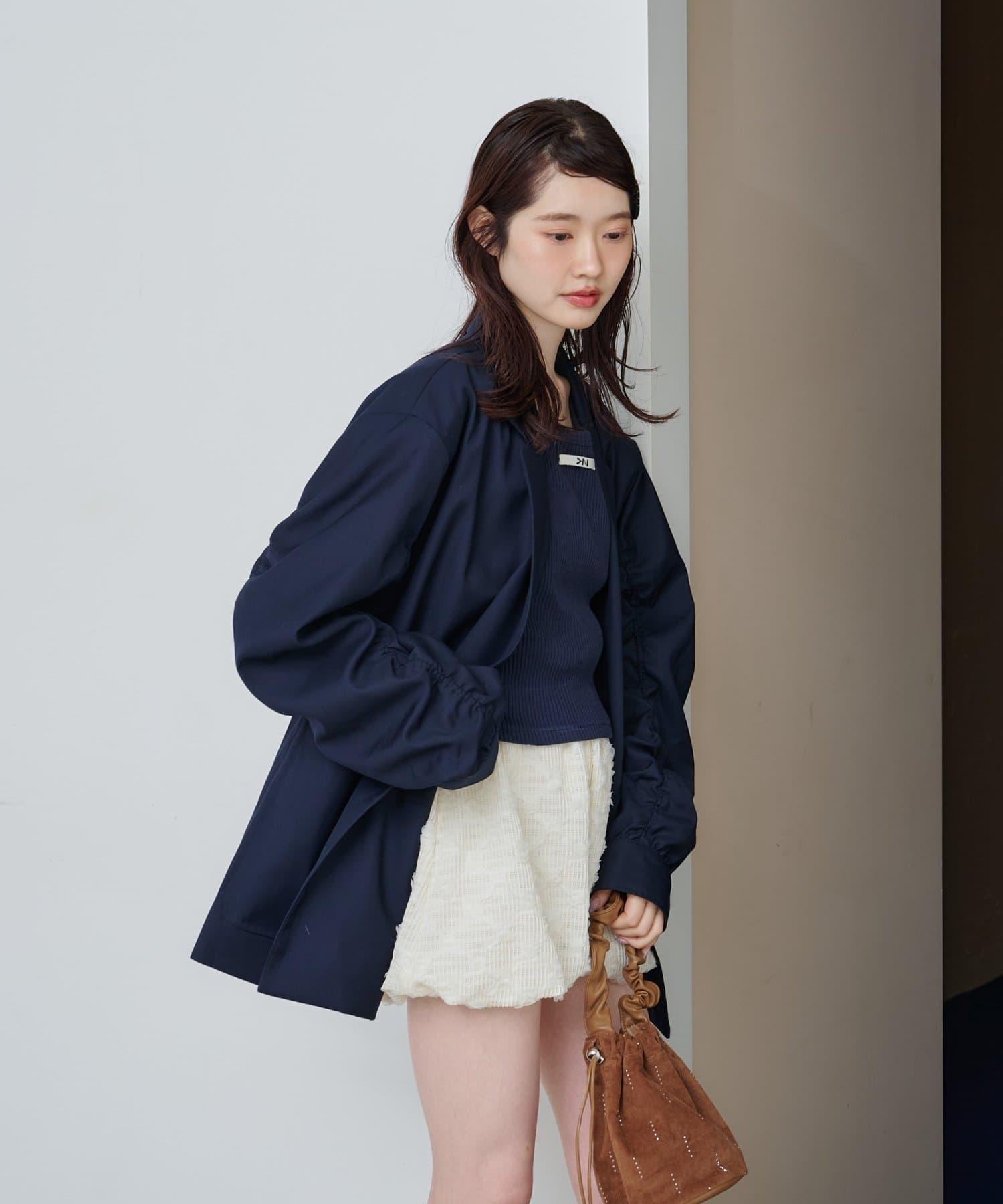 外搭 T 恤和寬鬆長褲,讓袖子上的褶皺成為焦點。利用配飾和髮型打造精緻印象。