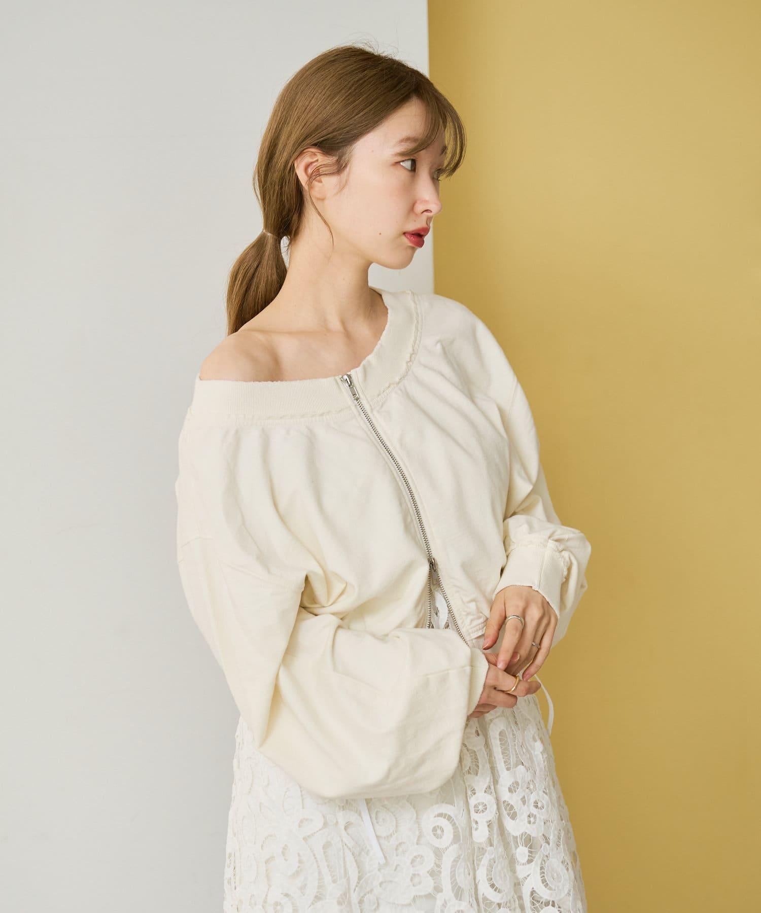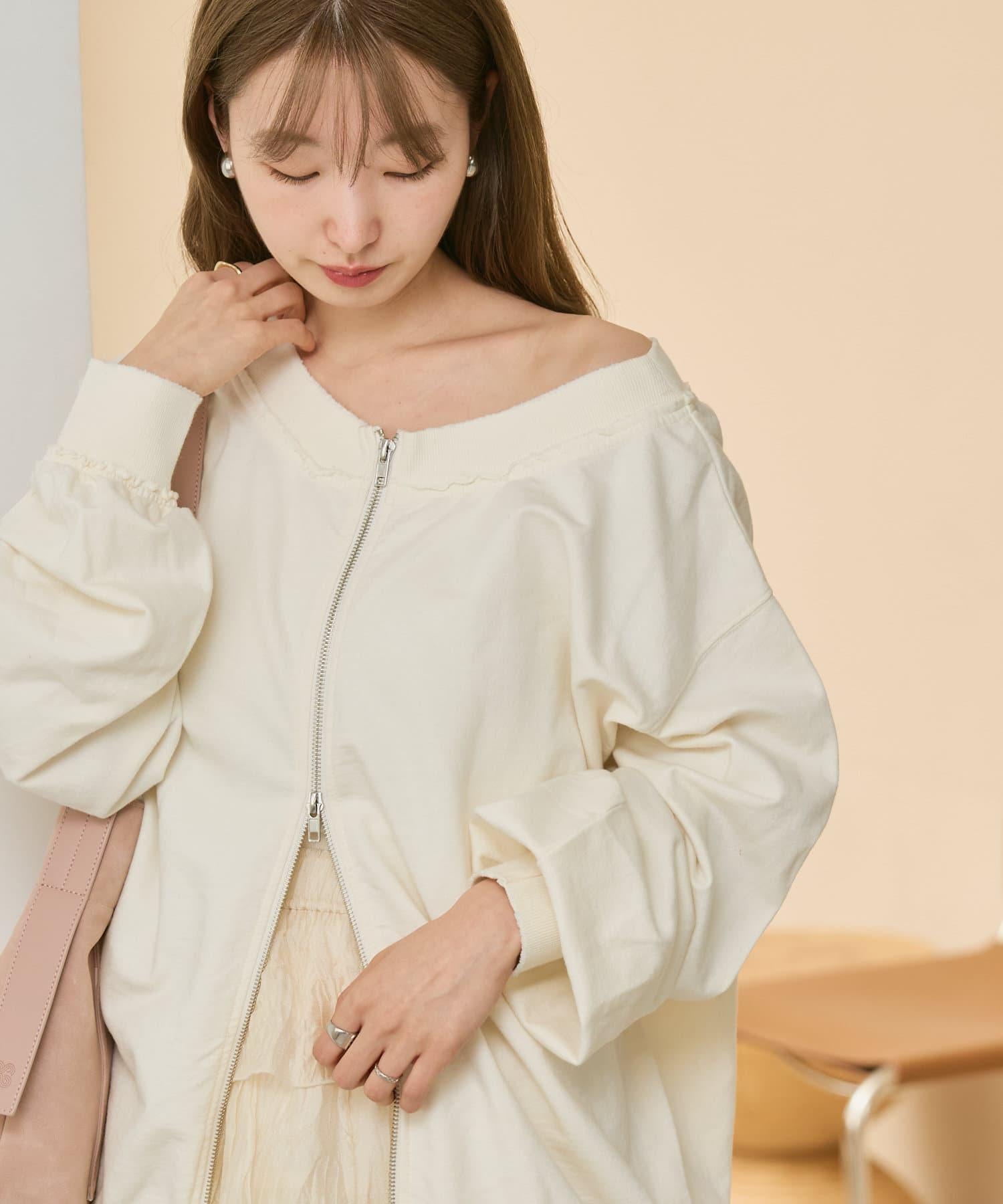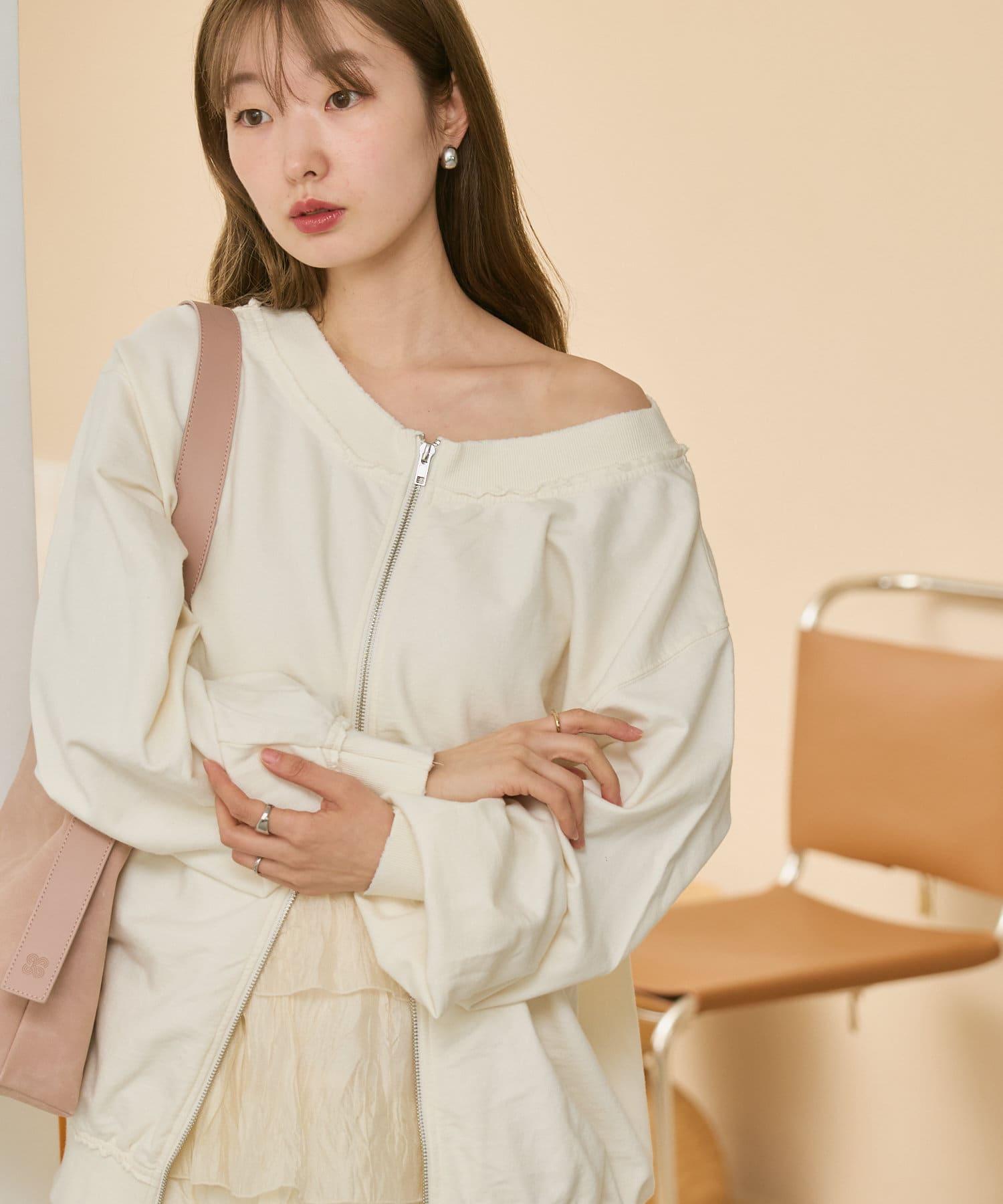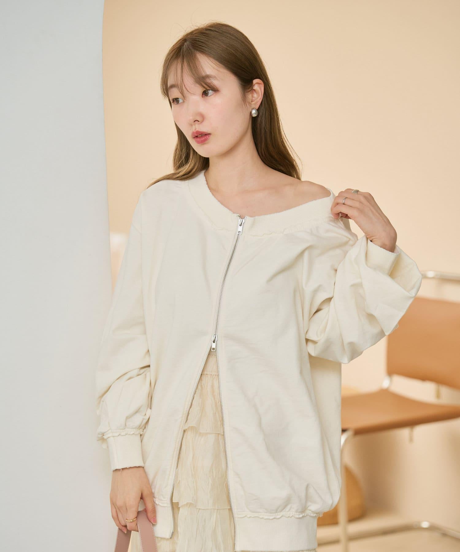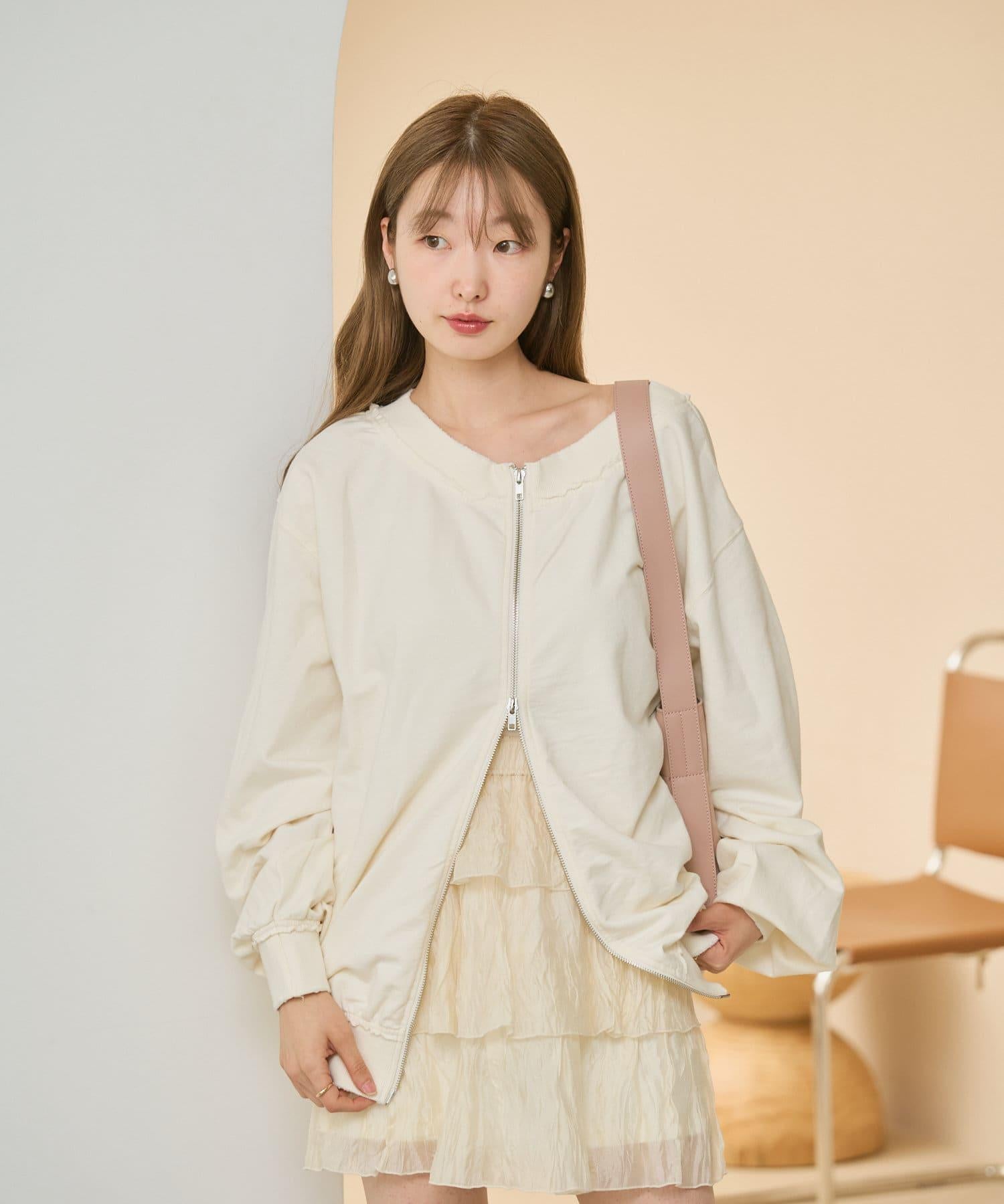 稍稍拉開拉鍊,讓肩部下垂,增加寬鬆感,打造成熟穩重的風格。