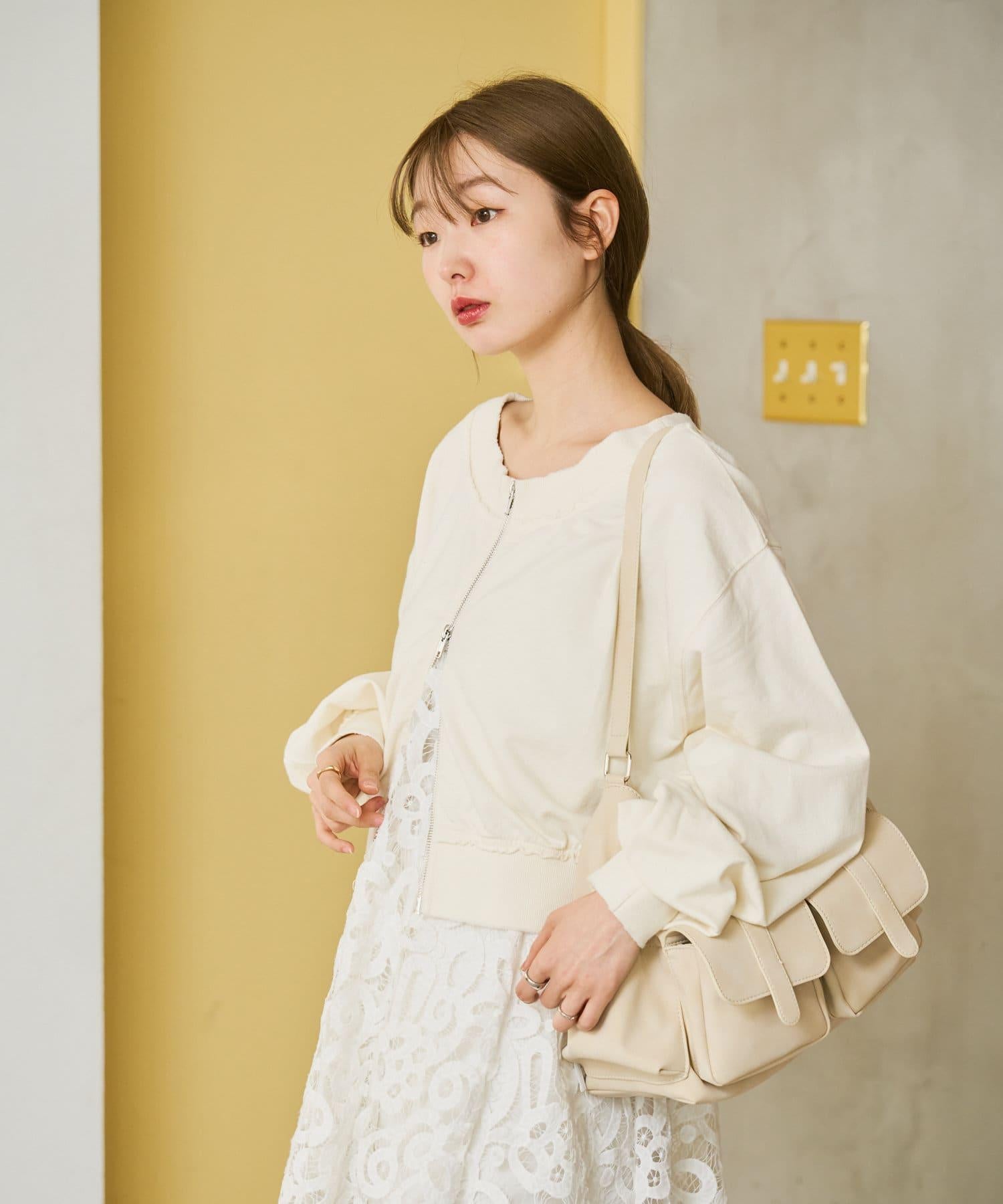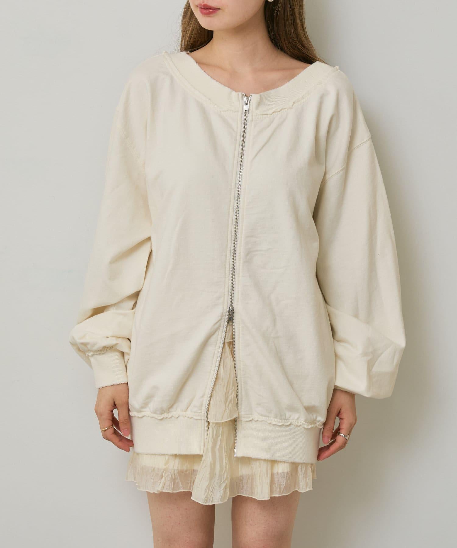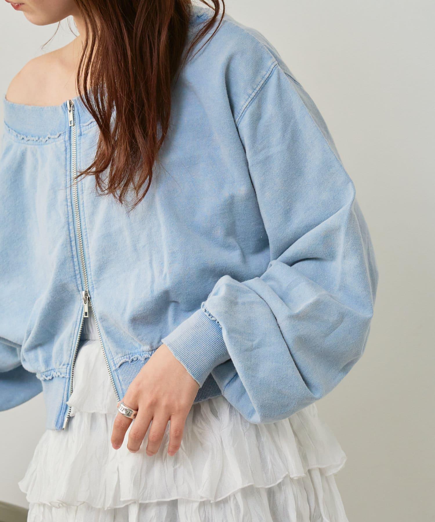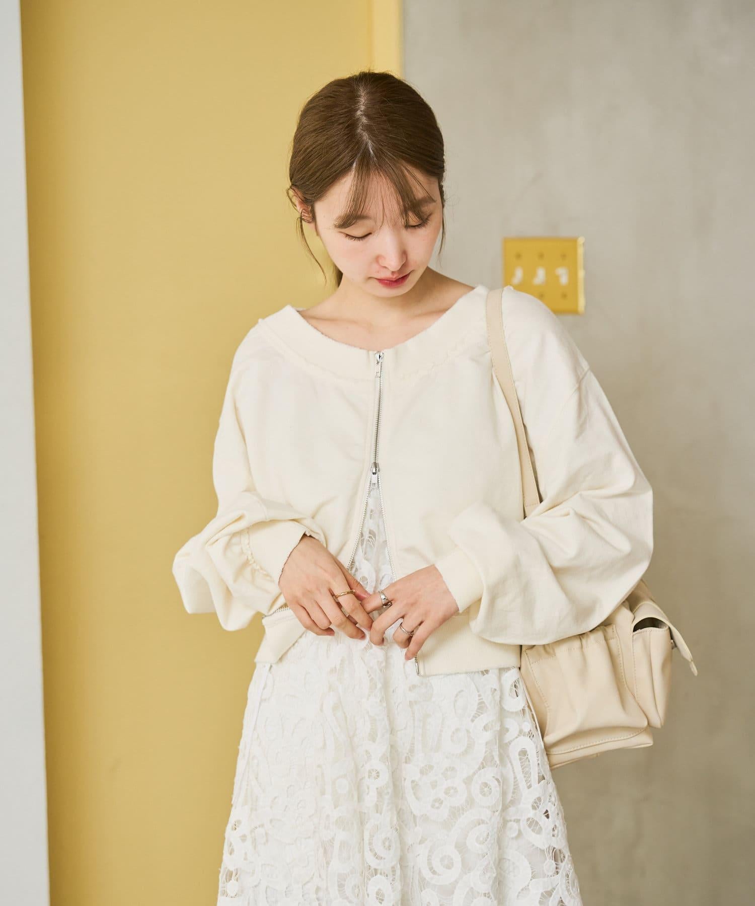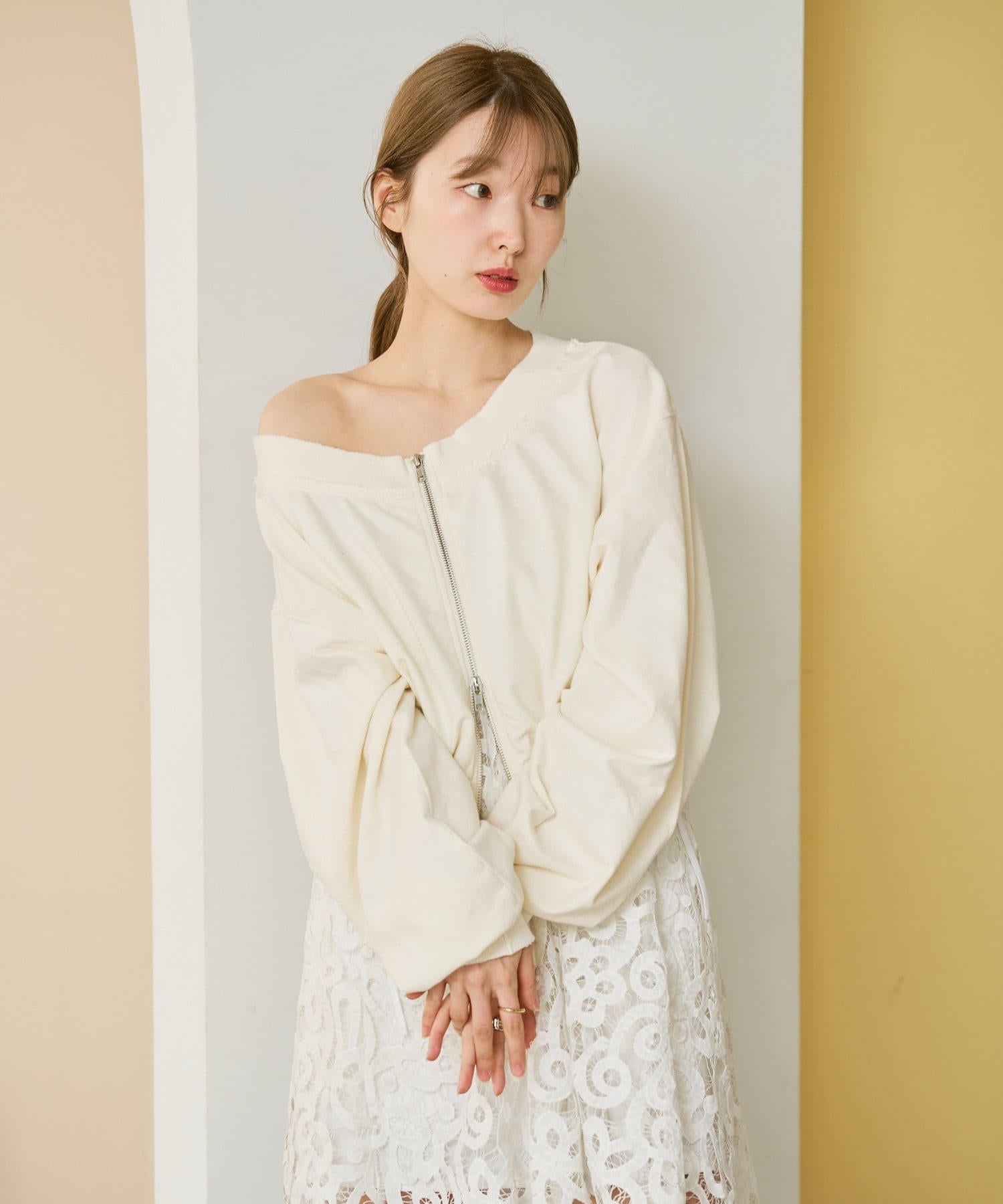 稍稍拉開拉鍊,讓肩部下垂,增加寬鬆感,打造成熟穩重的風格。
