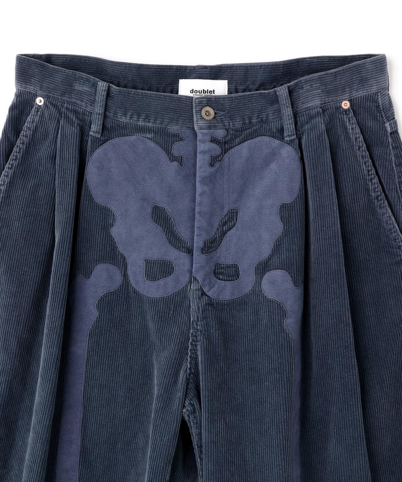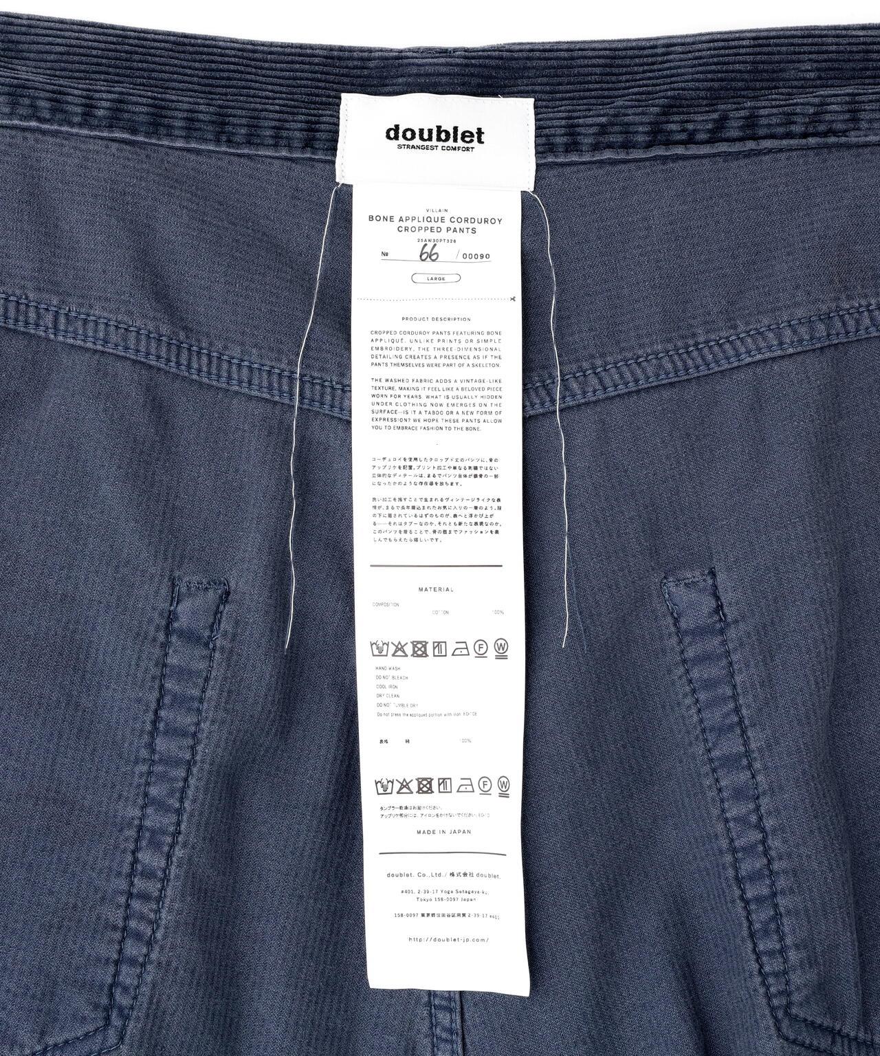 燈芯絨剪裁長褲,前幅飾有雙層骨頭圖案。立體的骨骼設計極具衝擊力。寬身剪裁,中間收口,寬鬆合體。水洗面料讓褲子看起來更有復古感。配有腰帶環,與您的腰帶相匹配。建議與同系列的 BONE APPLIQUE CORDUROY JACKET 搭配穿著。 Doublet ... 日本男裝品牌 [doublet]。由在三原康裕(Mihara Yasuhiro)積累了豐富經驗的井野雅行(Masayuki Ino)和村上隆(Takashi Murakami)於 2013 年春夏系列中👍亮相。品牌名稱 "doublet "意為 "奇蹟"。