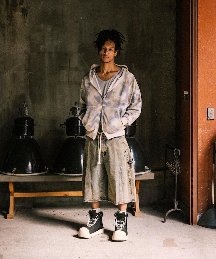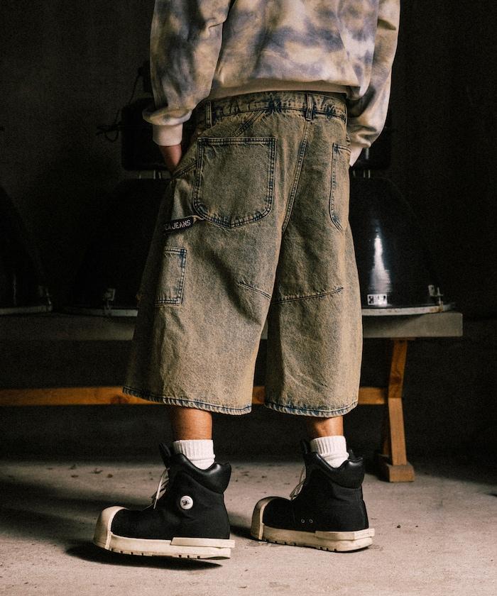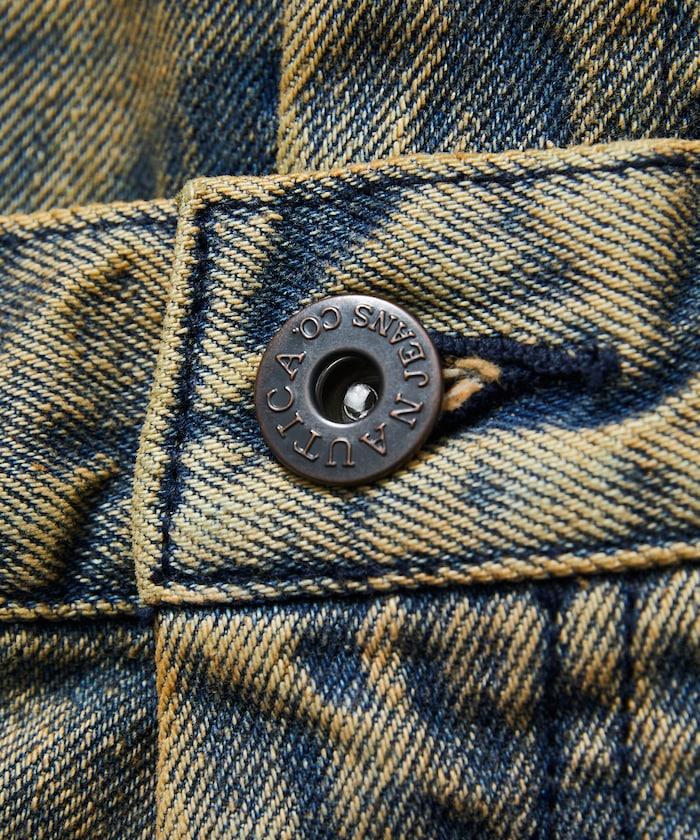 分層收腰款式由兩種不同的 12.5 盎司牛仔布製成,並帶有不同年齡的補丁。