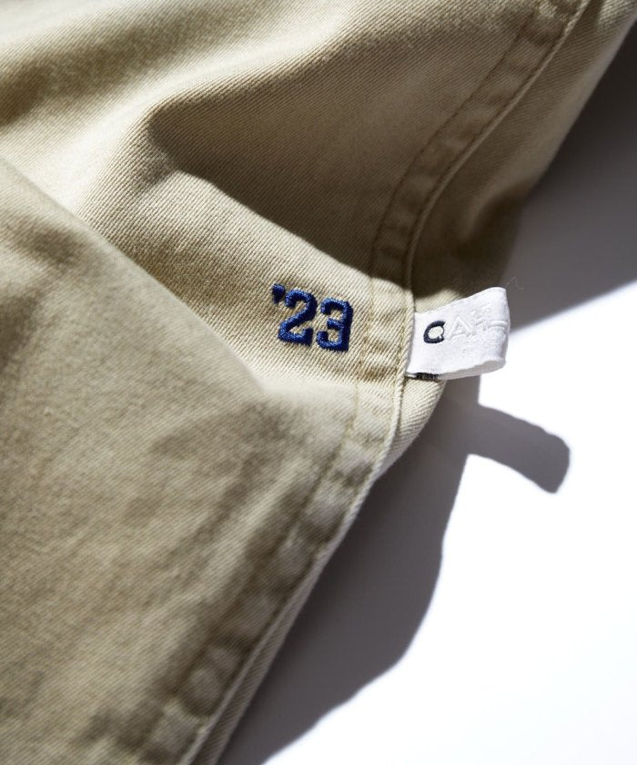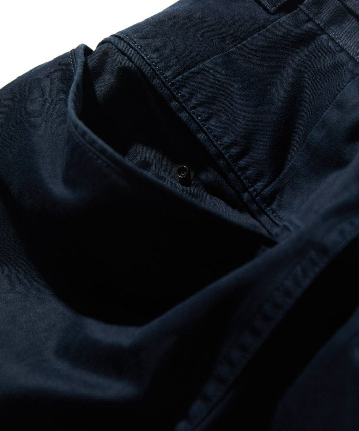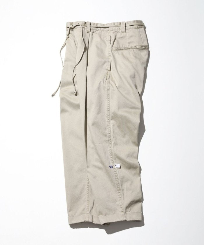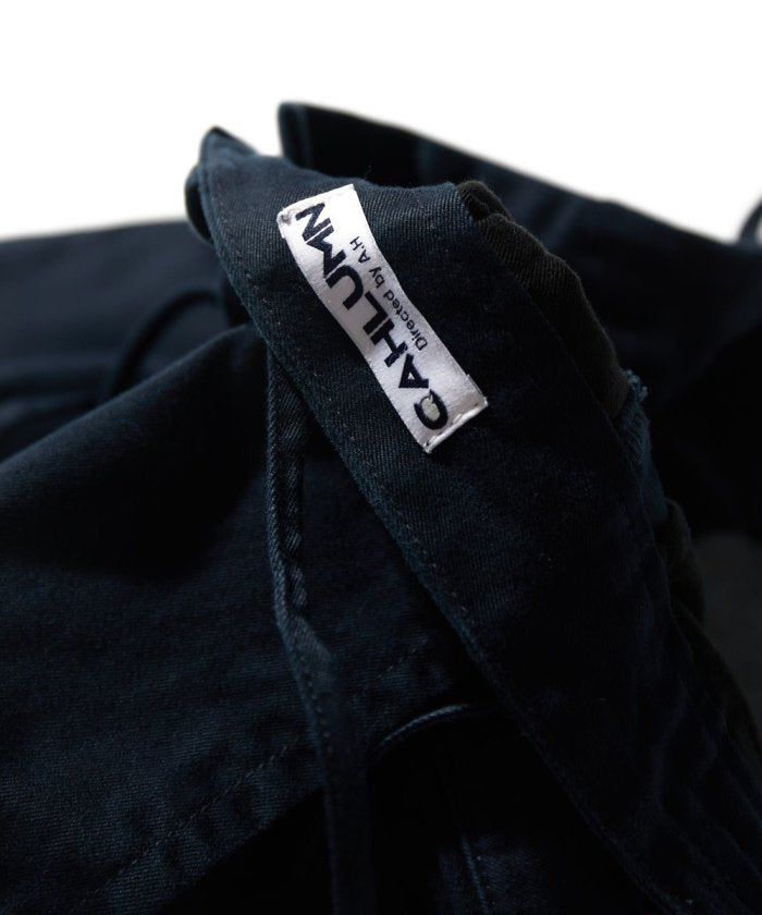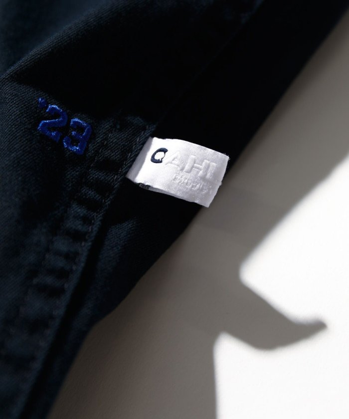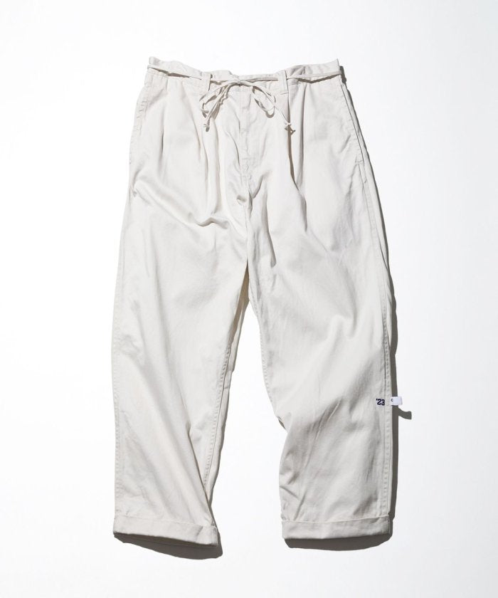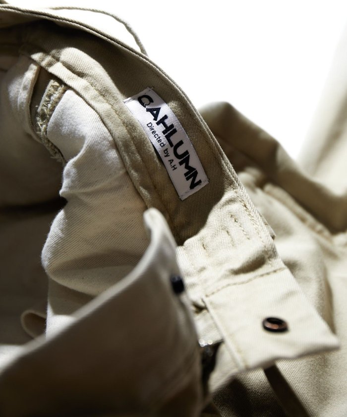 '到目前為止,我經常使用簡易褲型的聚攏和抽繩設計來打造腰部細節,但我想要一條更基本的褲子,所以我增加了腰帶環。共生繩其實是縫在臀部上方的環形區域的,所以原樣清洗也很方便。左側的後袋是一個很大的口袋,可以輕鬆裝下一本《CAHLUMN》雜誌。這條褲子原封不動地穿著太呆板了,所以我從一開始就把它洗了。洗得很乾淨,穿起來很舒服。
