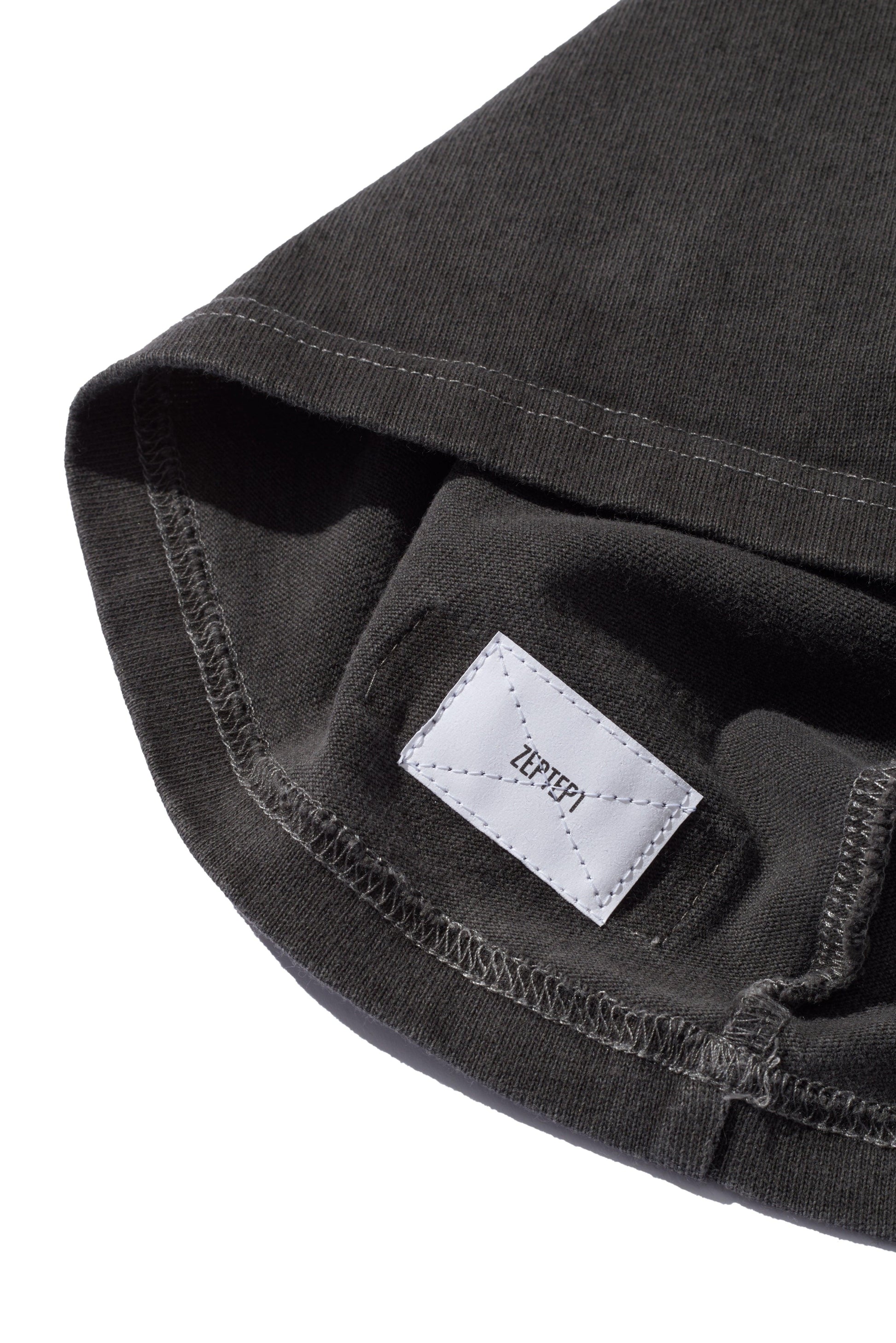 專為 "ZEPTEPI "定製的剪裁和縫製,由 10.5 盎司針織布製成,布壁紋理適中。染色工藝表現出在雨中溼透的感覺。背面的染色方法與正面相同。漂白後的衣身染成深灰色,然後染成黑色,以表現雨滴的樣子。