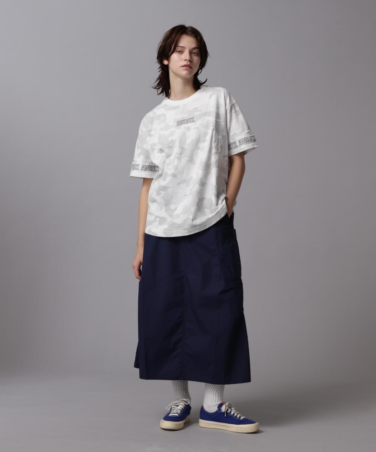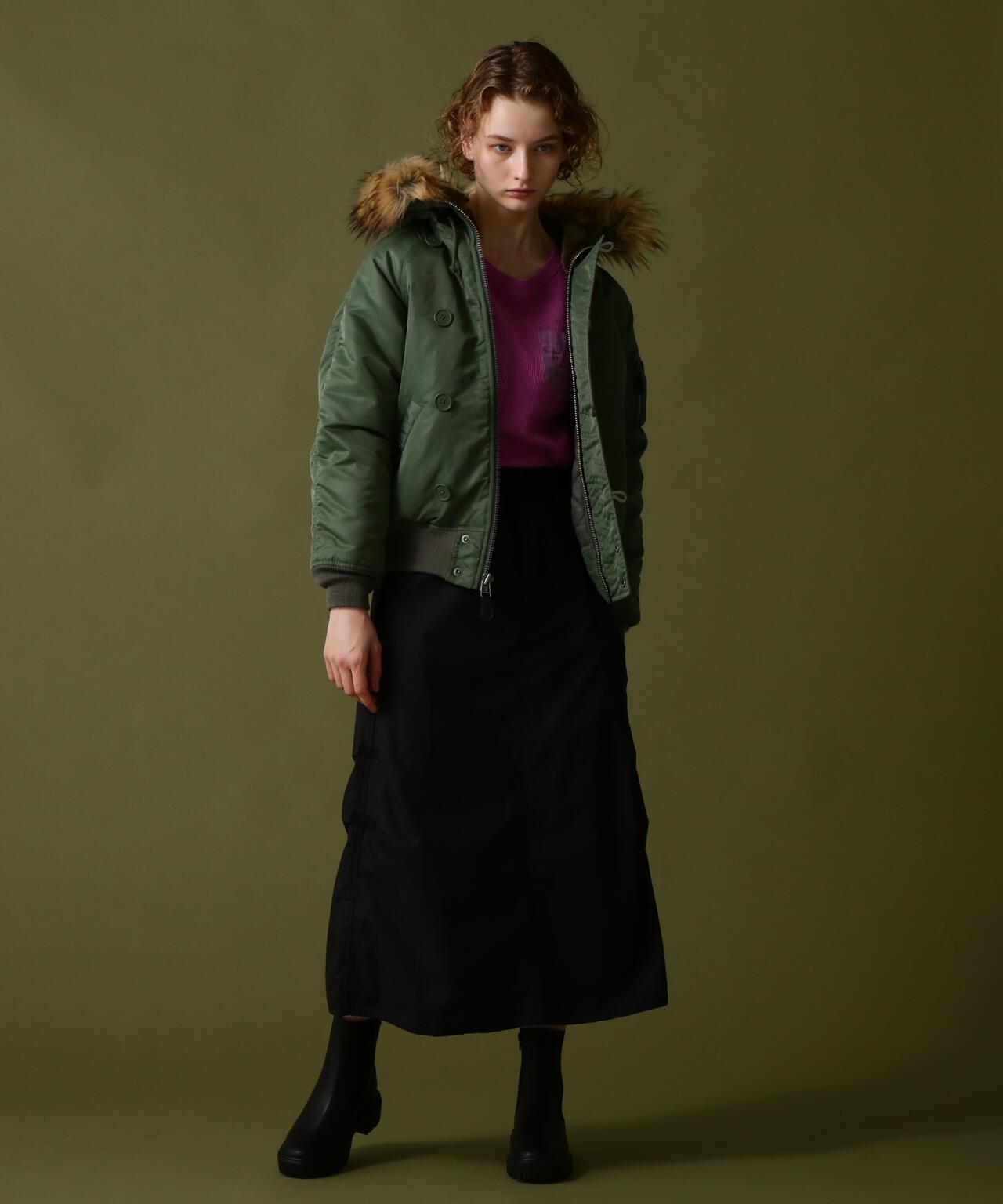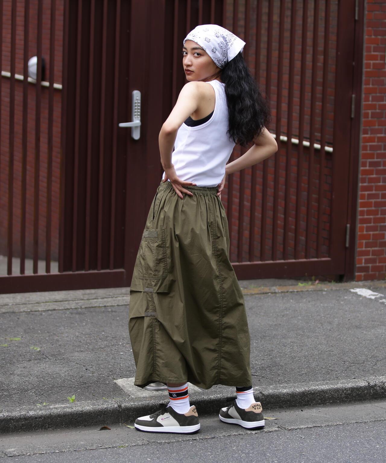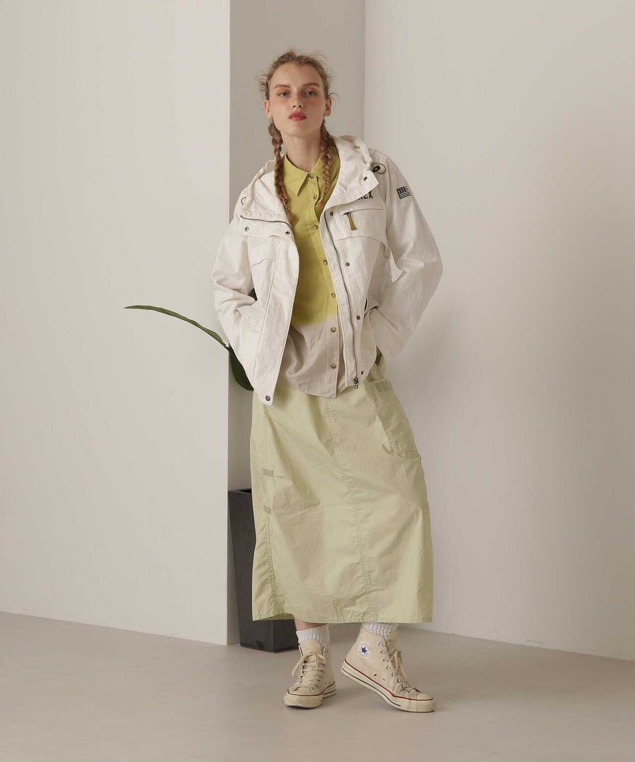 標準單品雪地裙--雪地褲的裙裝版型,大氣十足--兩側收腰設計,略顯 A 字廓形,不會顯得過於臃腫--裙身經過徹底水洗,在表面形成動感--腰部有鬆緊帶和繫帶,可搭配低腰褲穿著裙子的存在感很強,只需搭配一件簡單的 T 恤或背心,就能營造出很好的氛圍。裙子的存在感很強,只需搭配簡單的 T 恤或背心就能營造出很好的氛圍。AVIREX Belle] 將正宗軍裝的功能性和設計感與女式短裙相結合。
