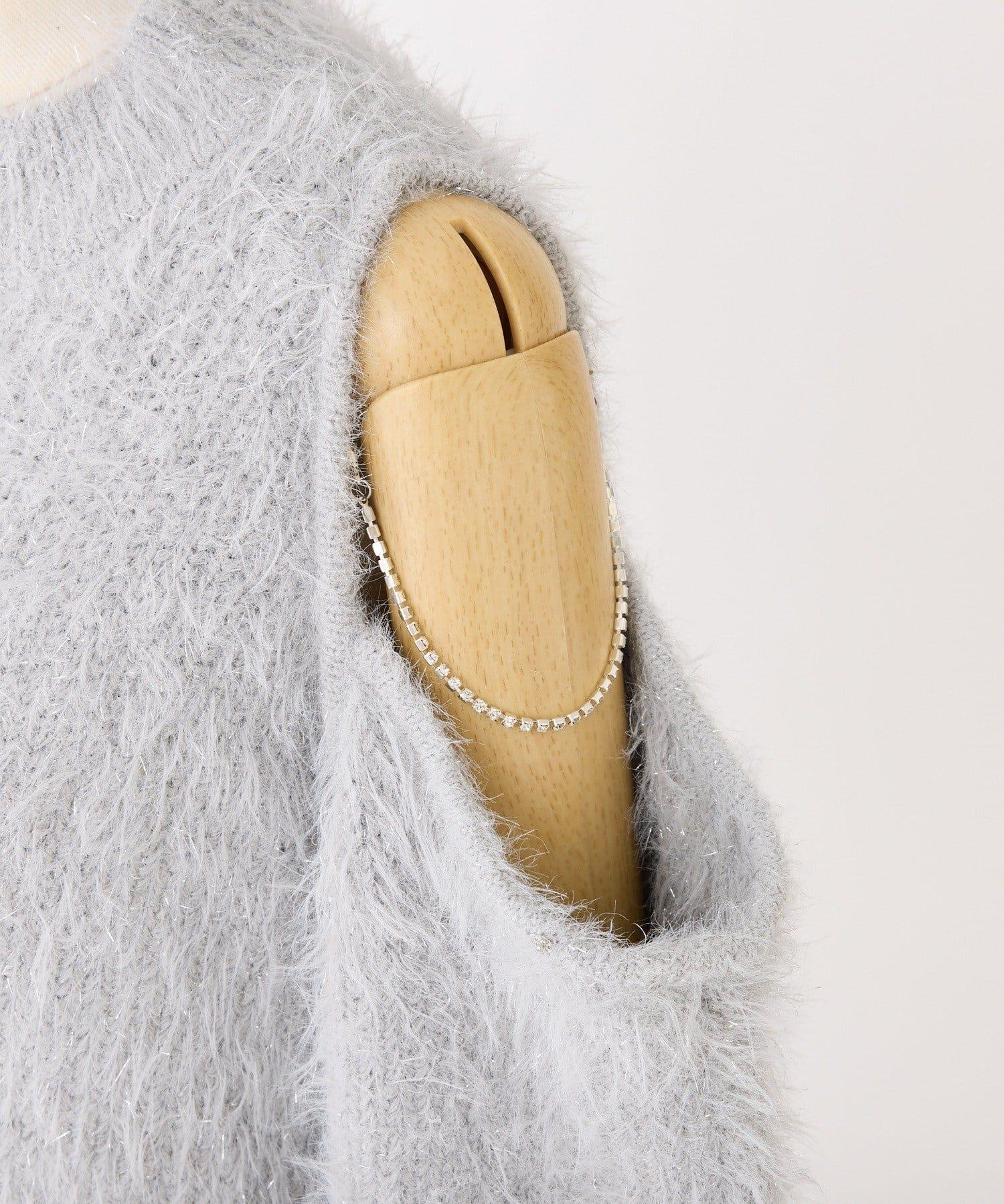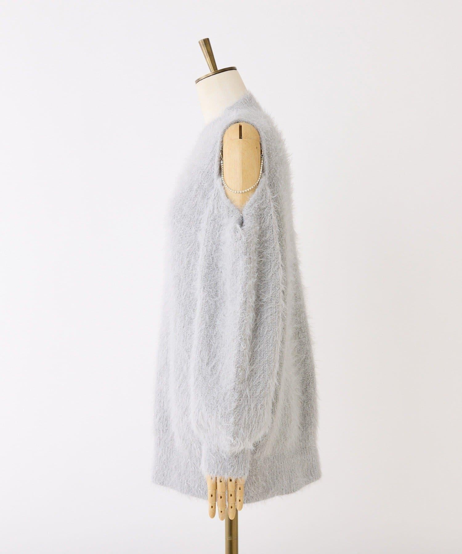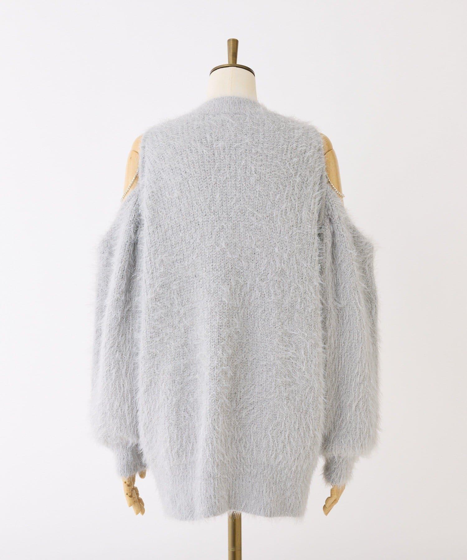 迷你針織連衣裙,採用開肩設計和閃亮鏈條。
