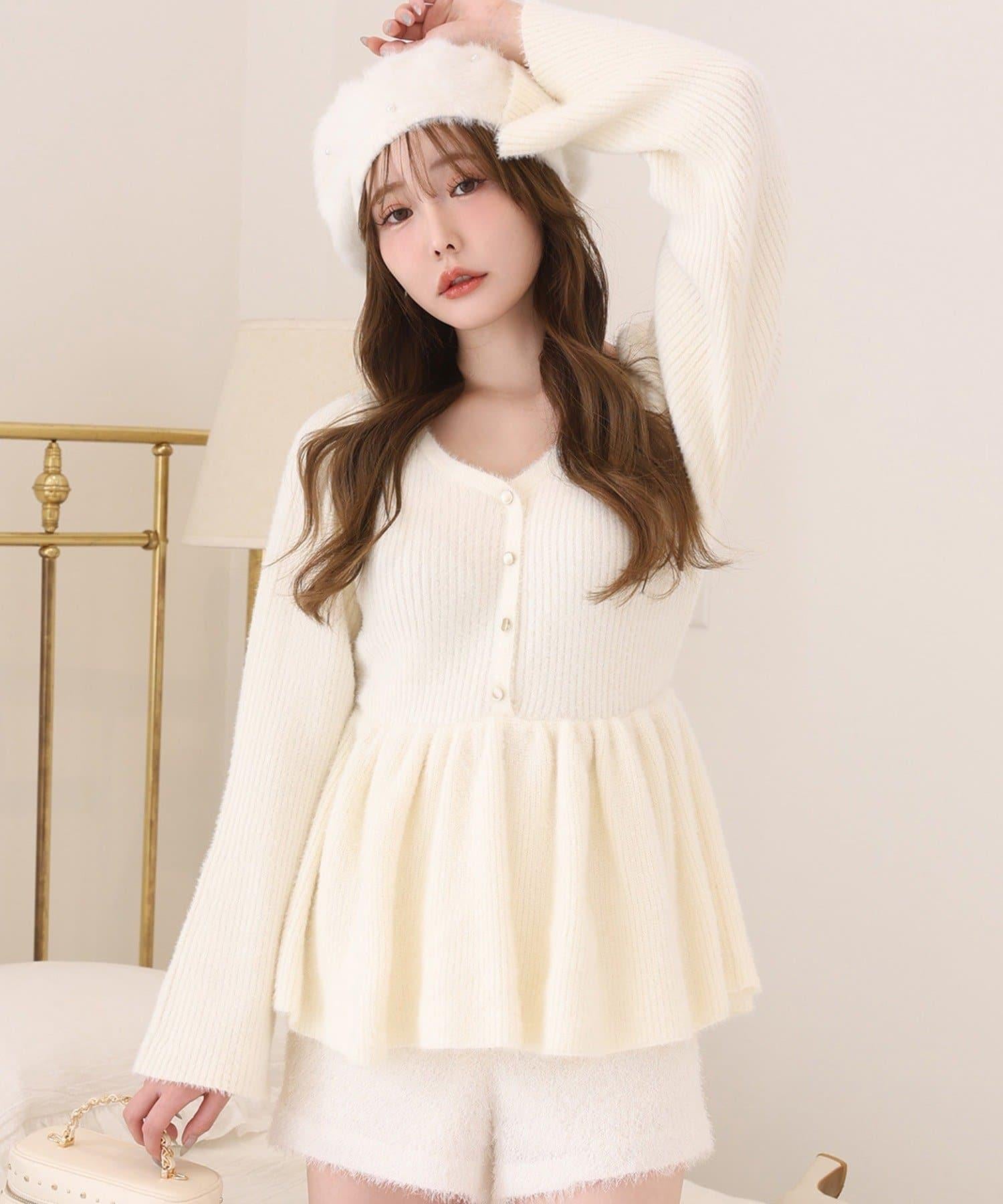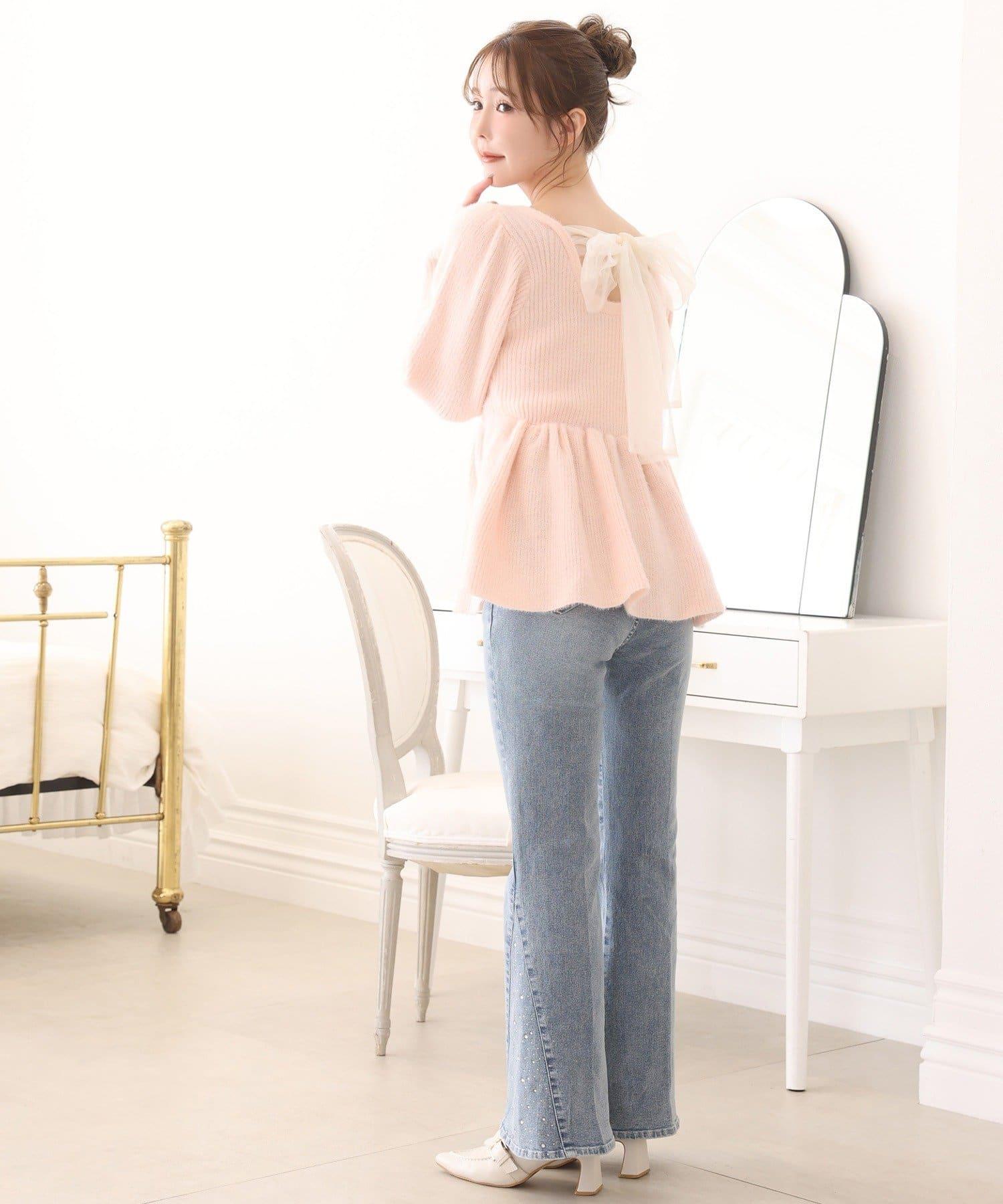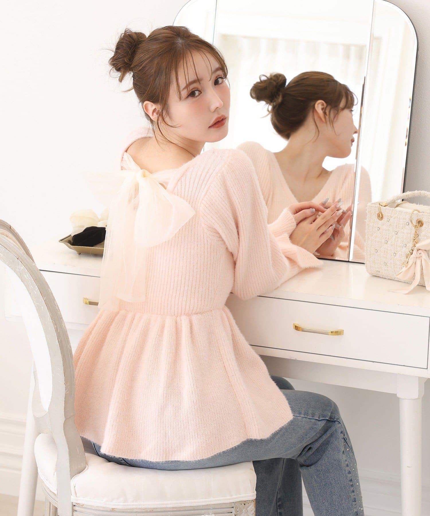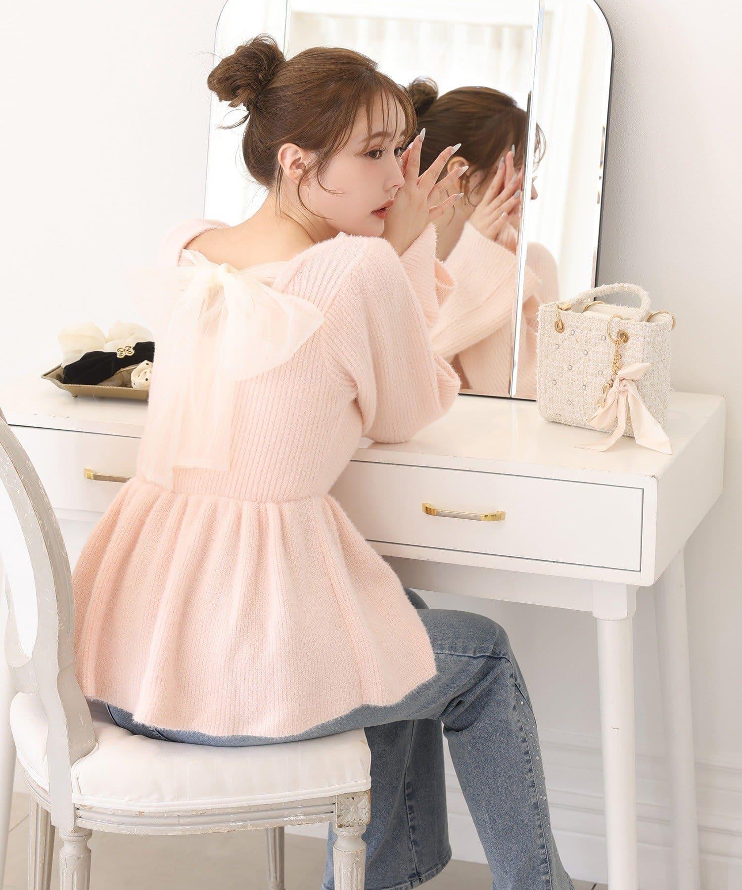 預約商品露背蝴蝶結羽毛裝飾荷葉邊針織衫
