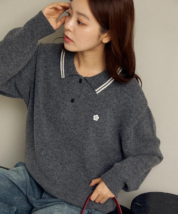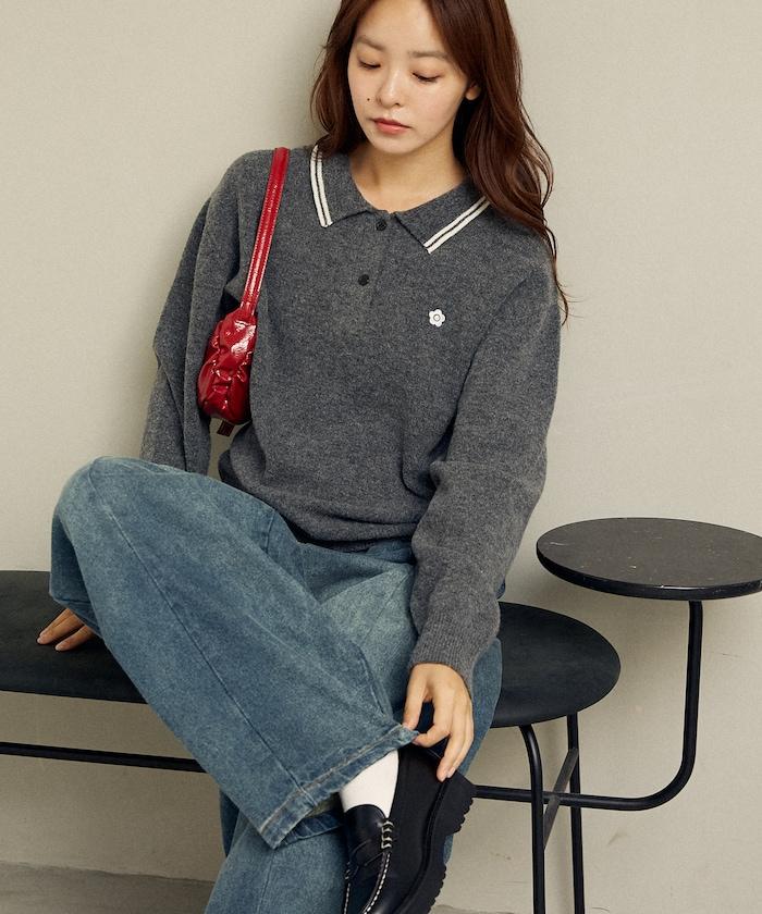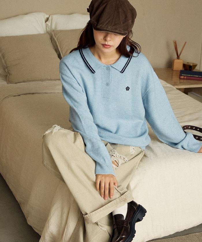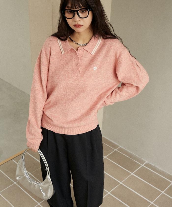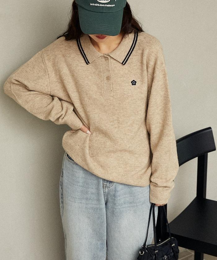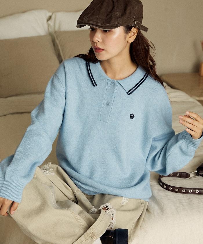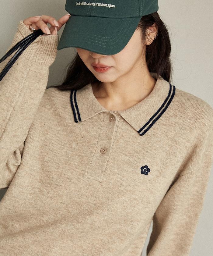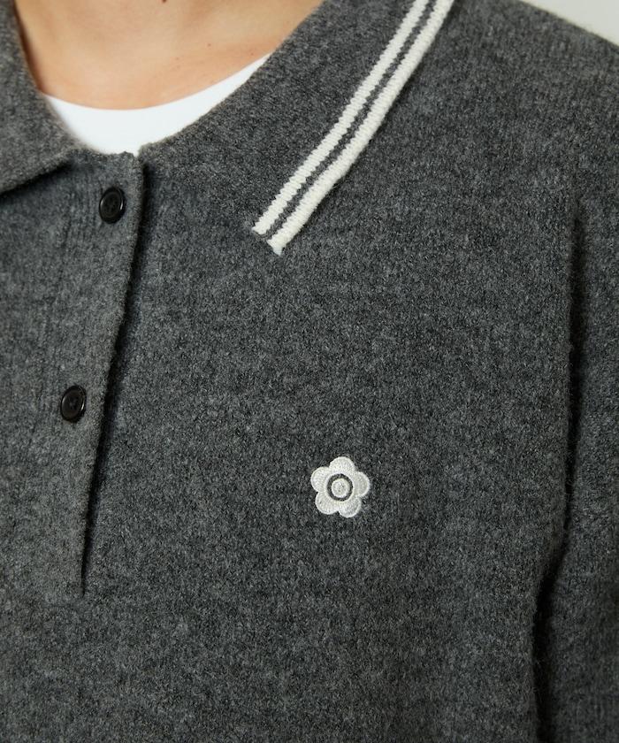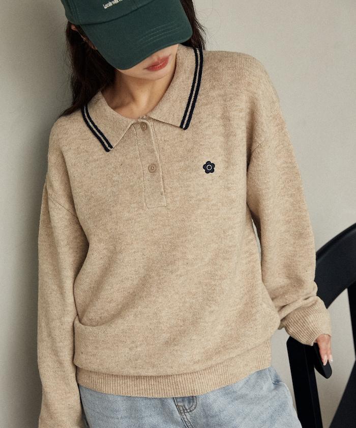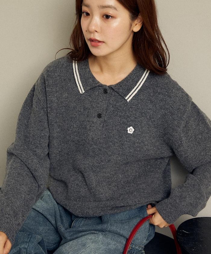 簡潔可愛的針織 Polo 衫,領口飾有線條,胸前飾有單點刺繡。