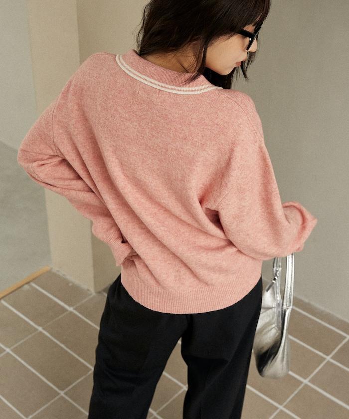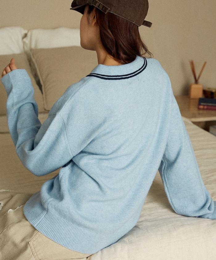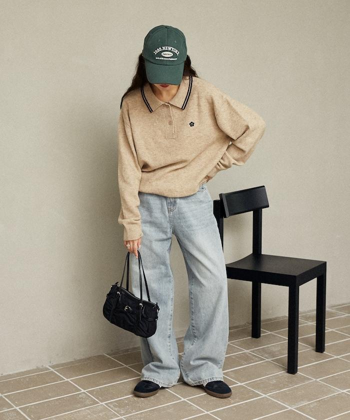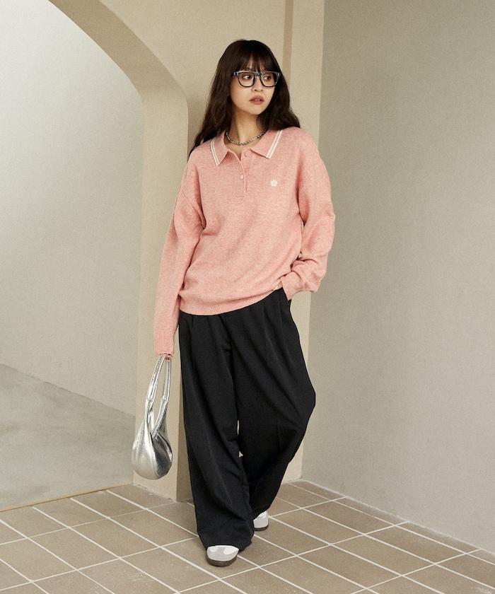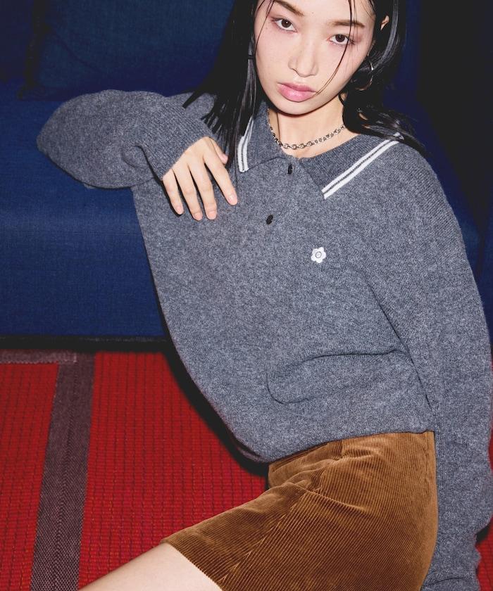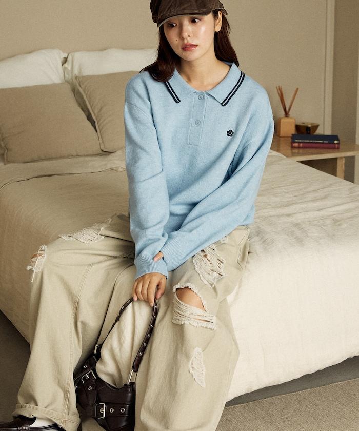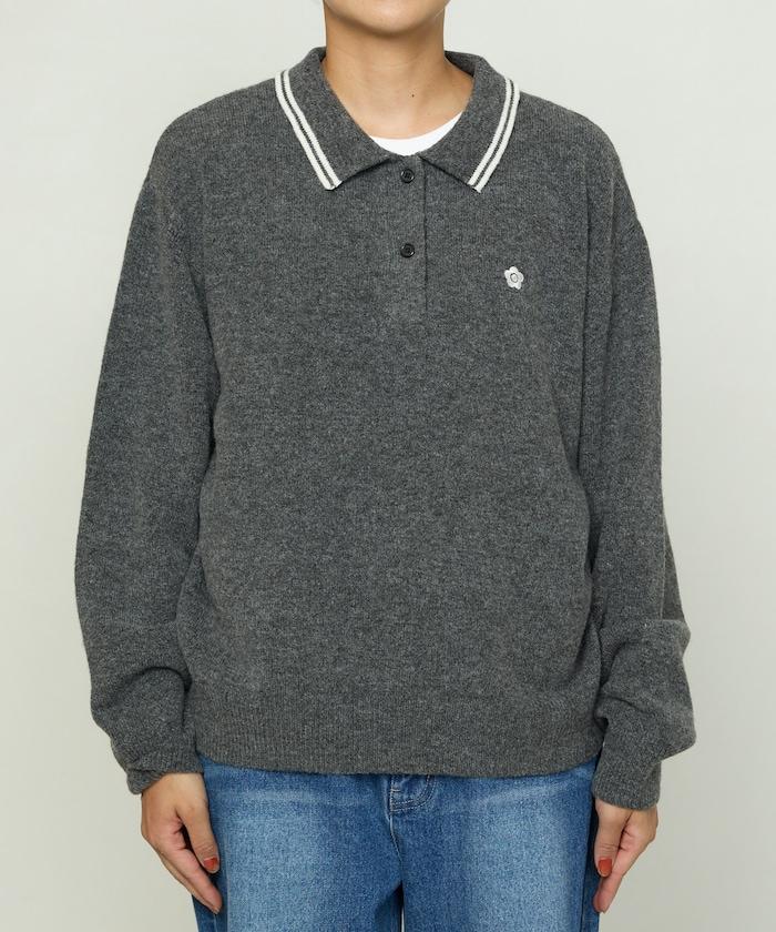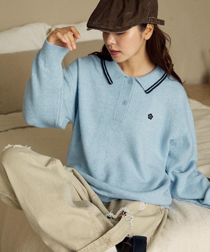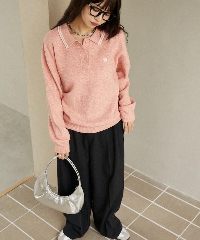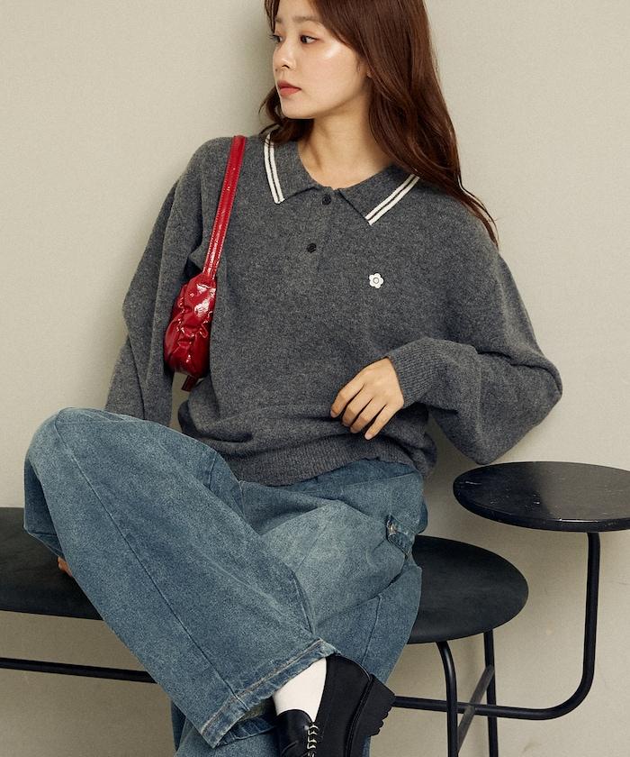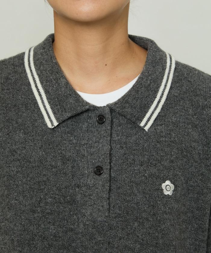 簡潔可愛的針織 Polo 衫,領口飾有線條,胸前飾有單點刺繡。