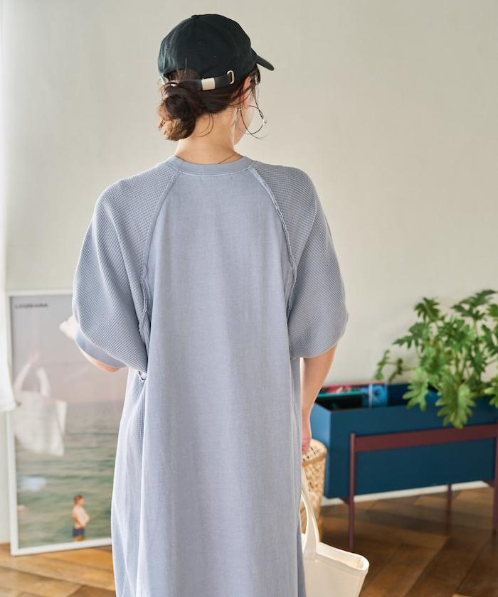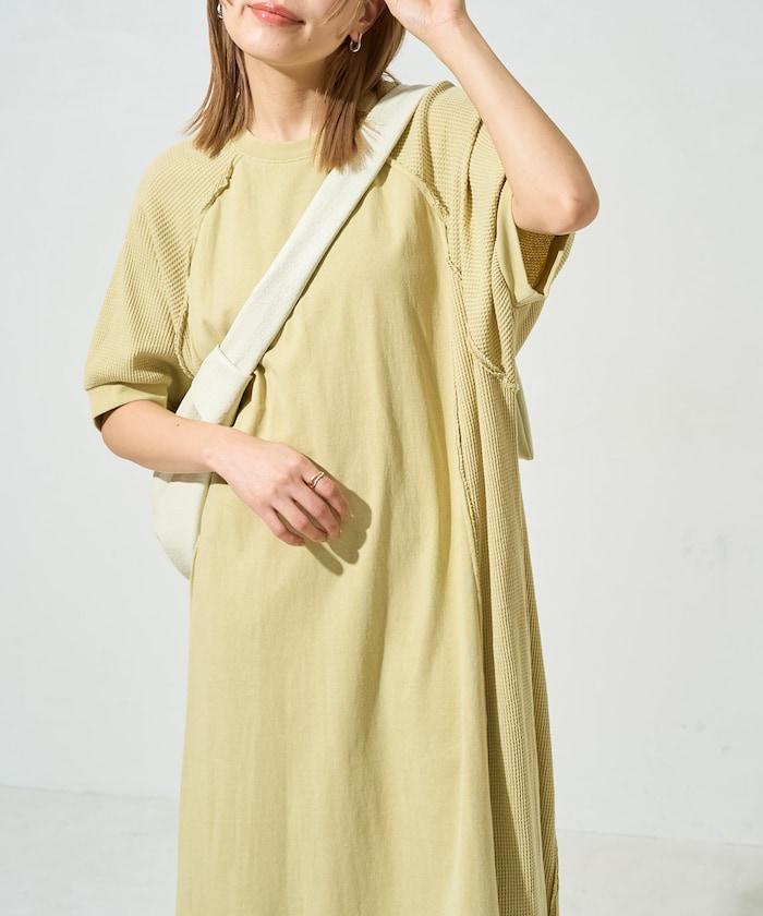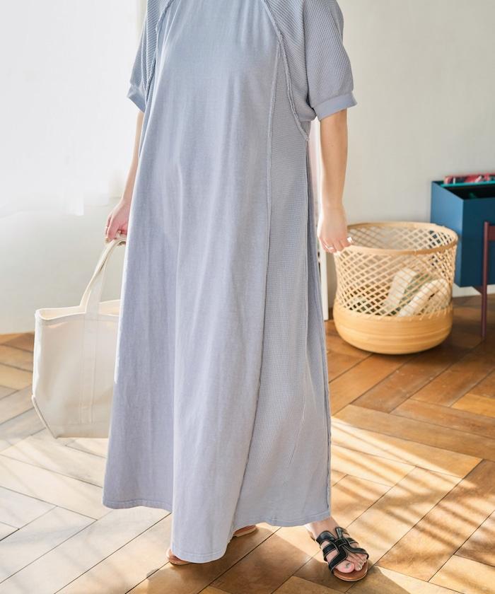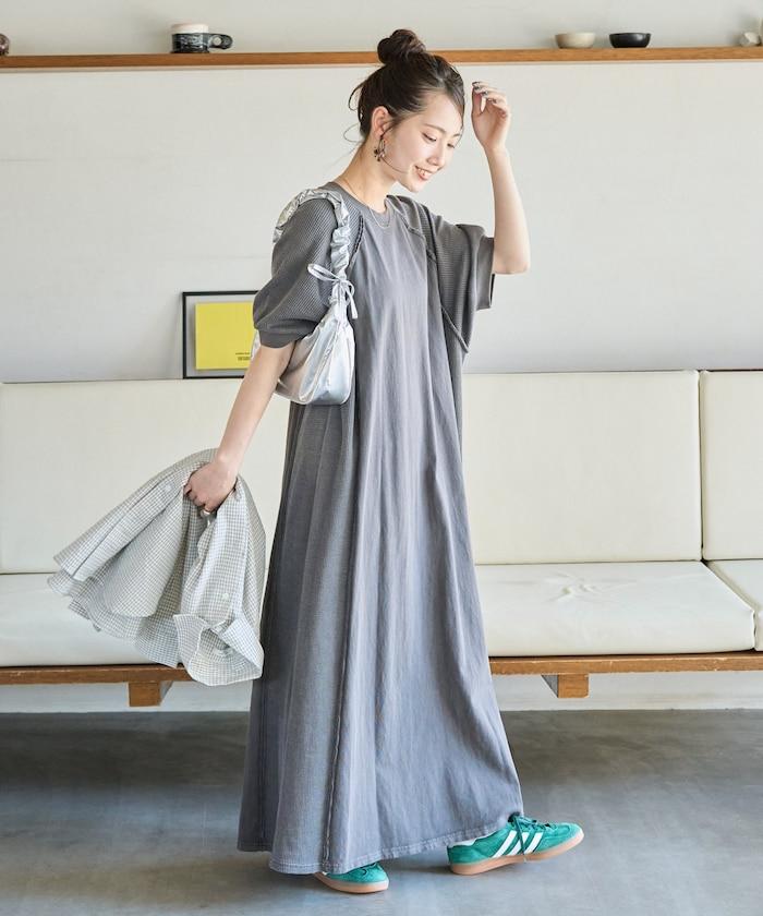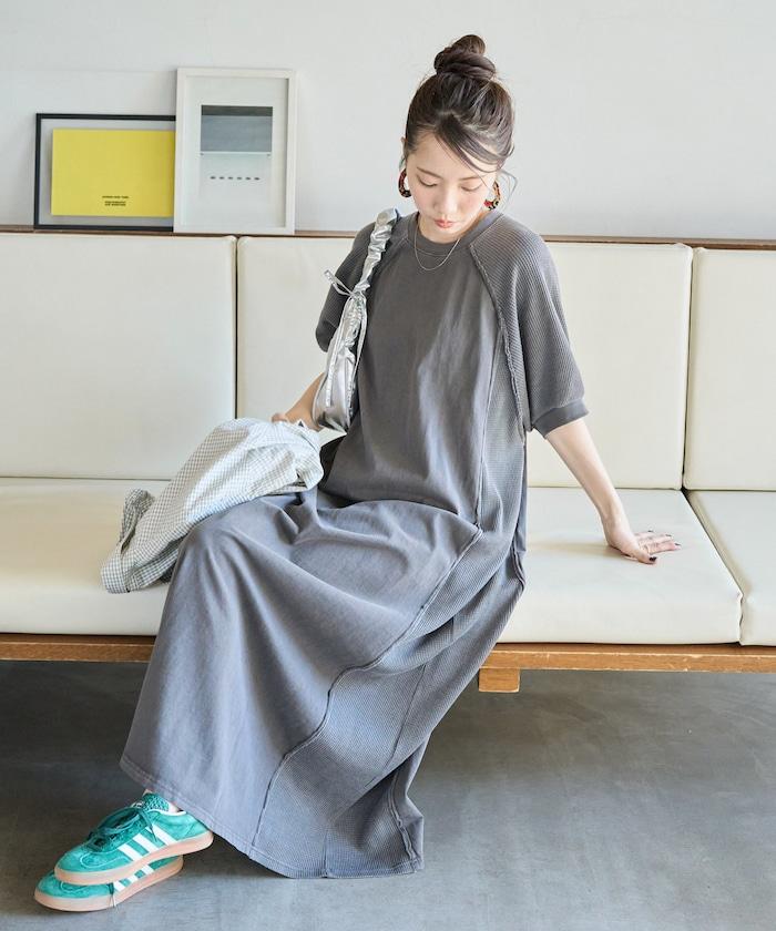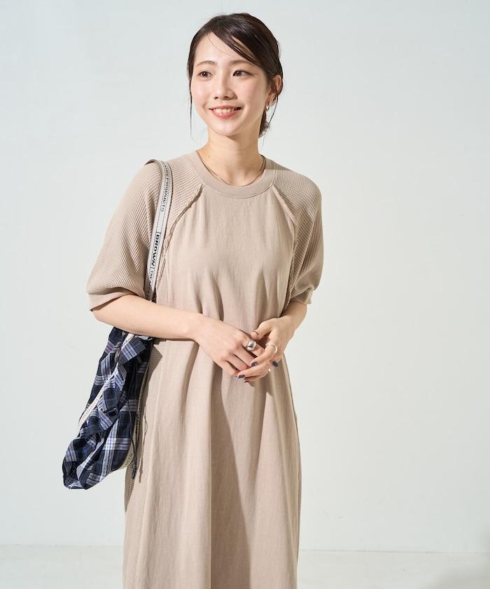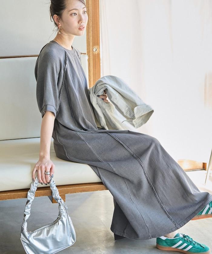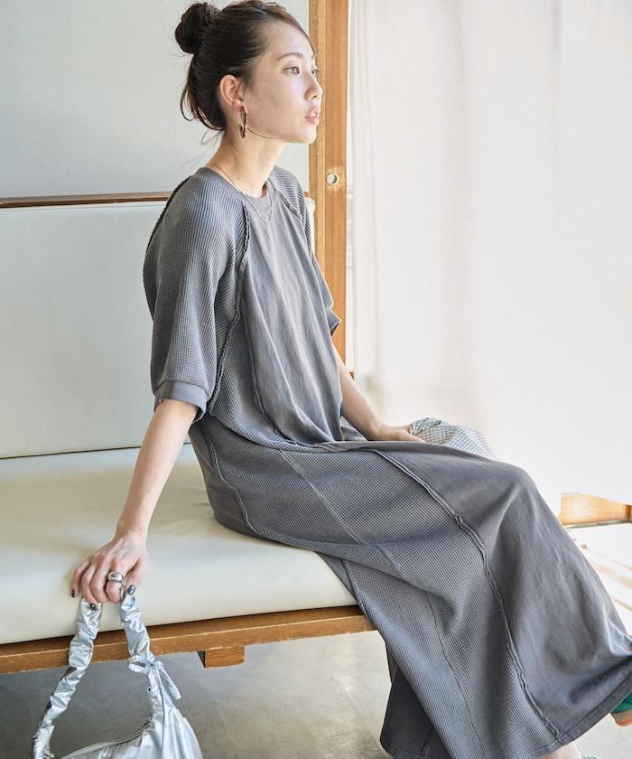 裁剪縫製的連衣裙,採用獨特的面料切換設計。