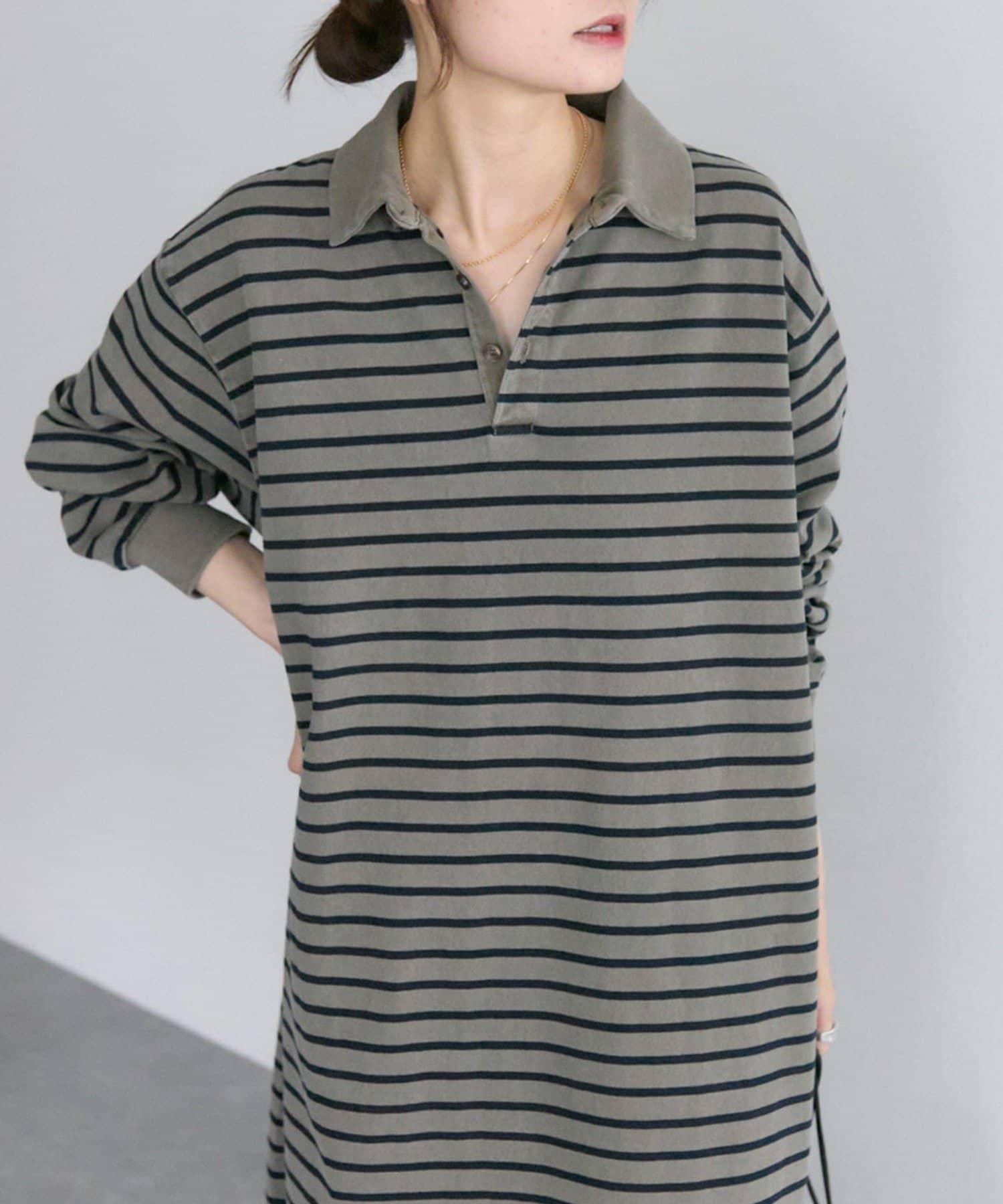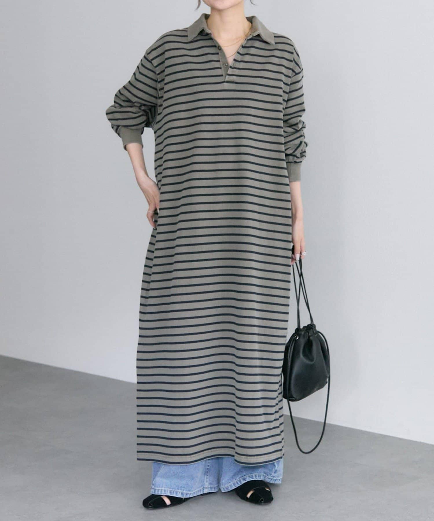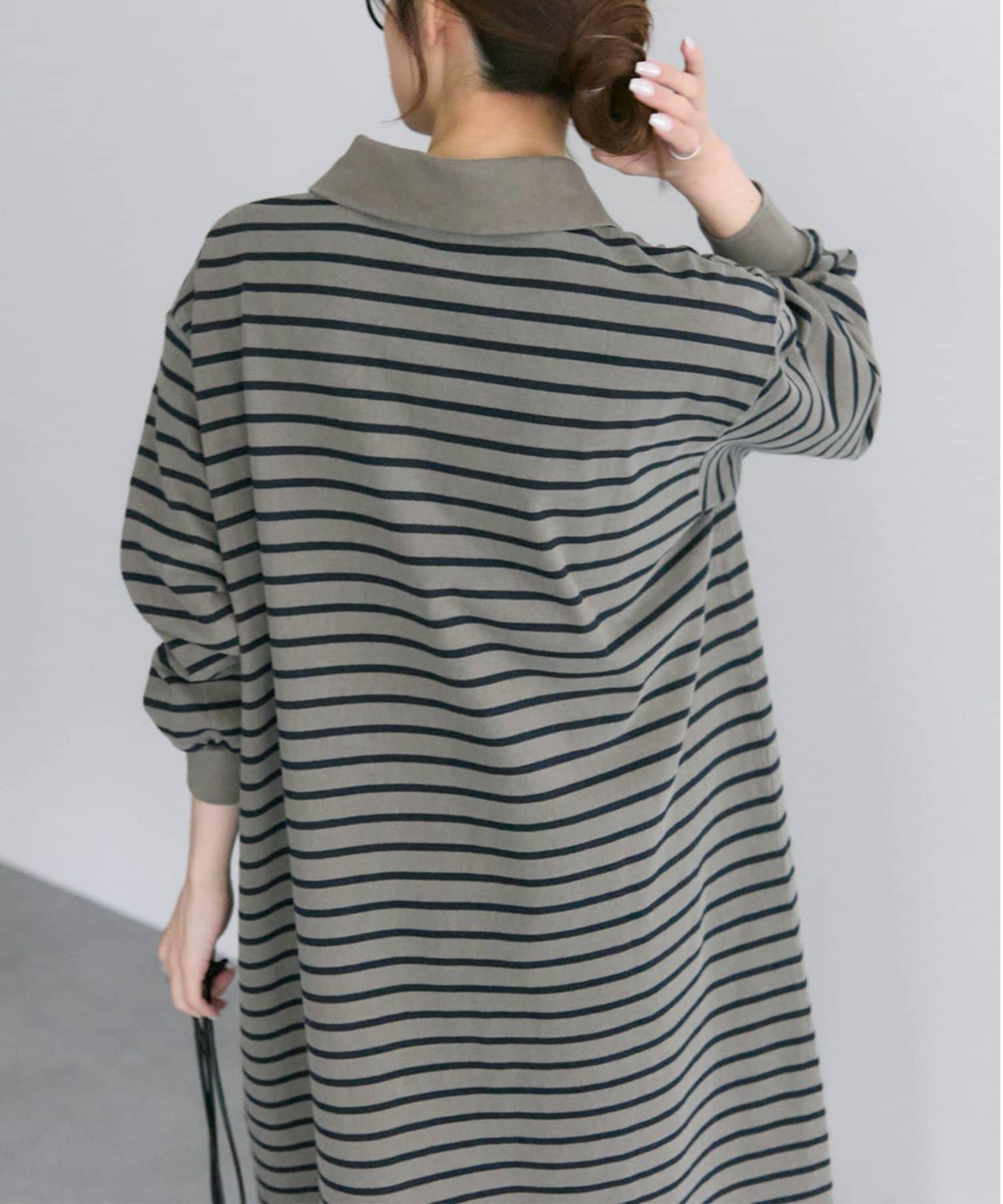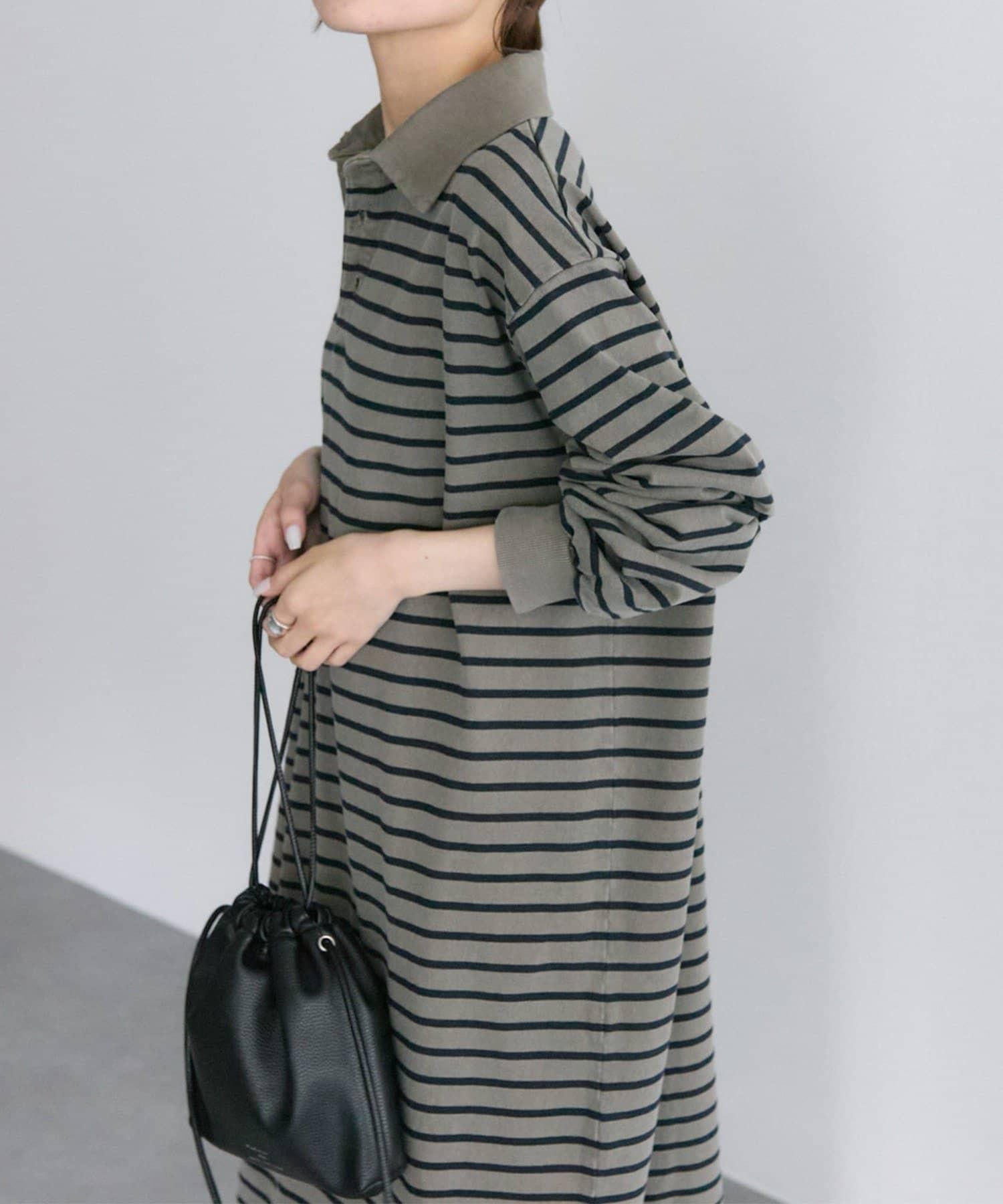 類似 Polo 衫的堅固衣領收緊了整體造型,為休閒邊飾連衣裙增添了整潔感。