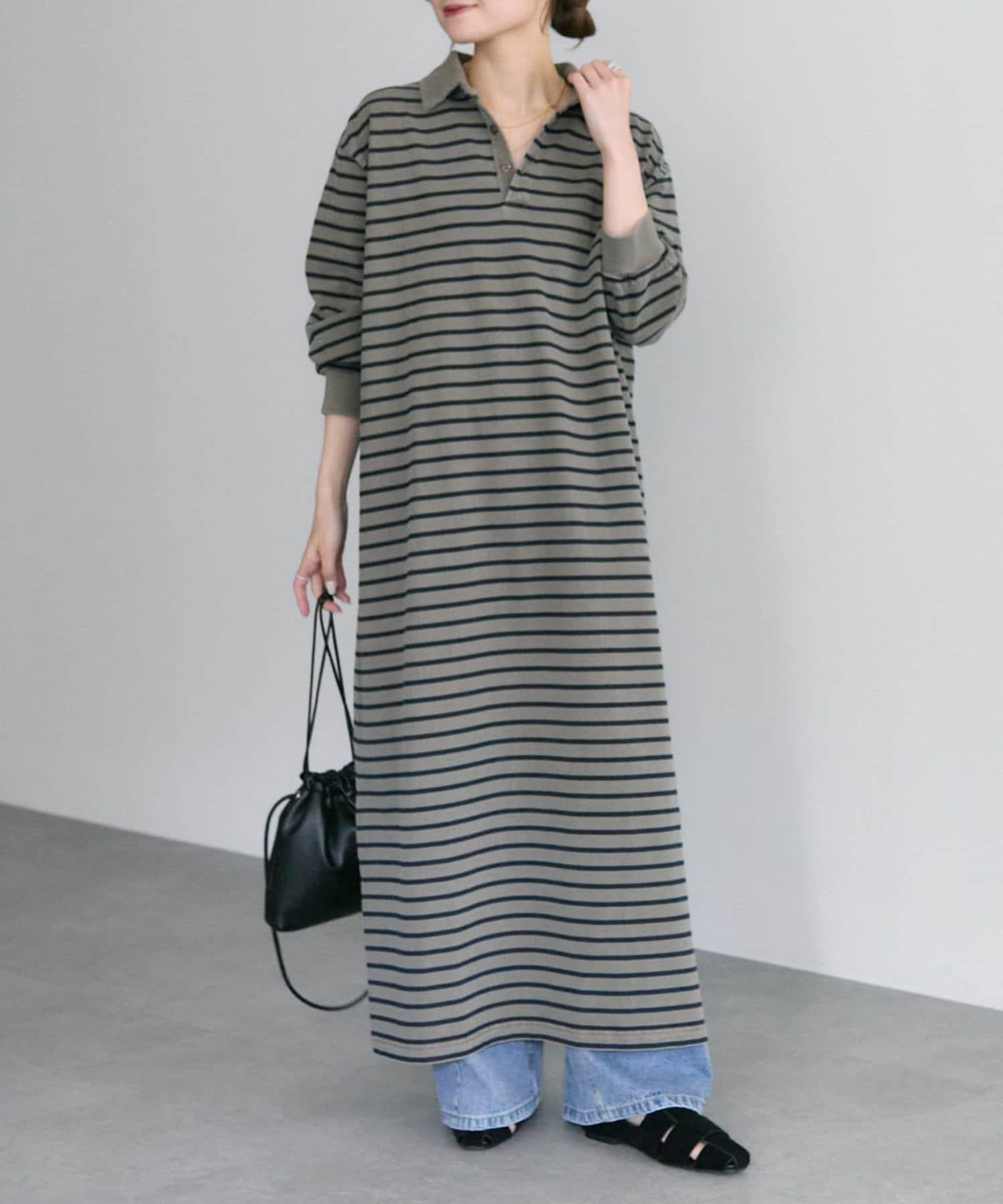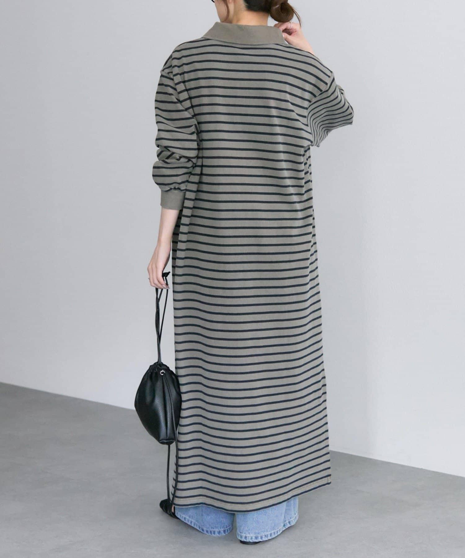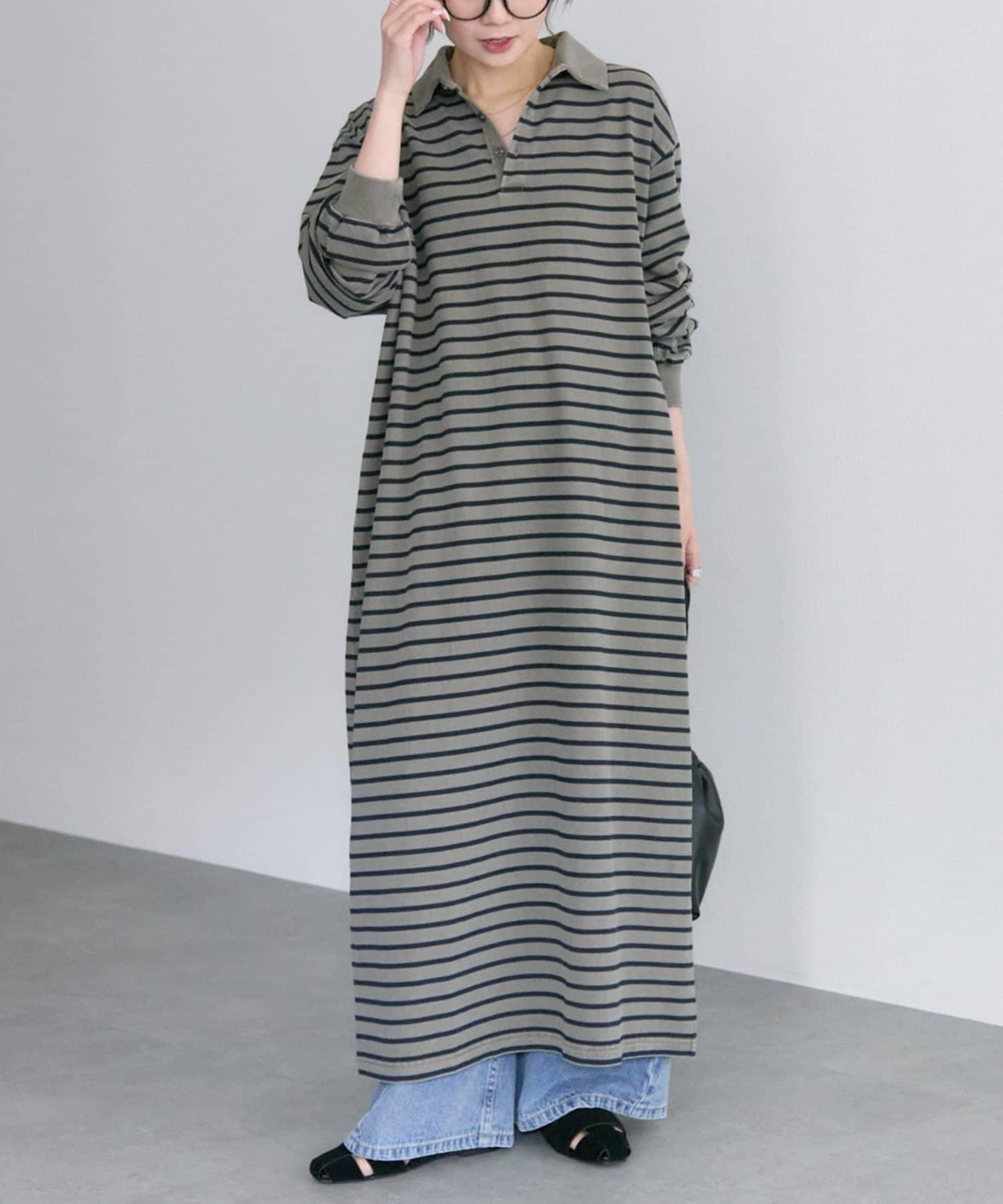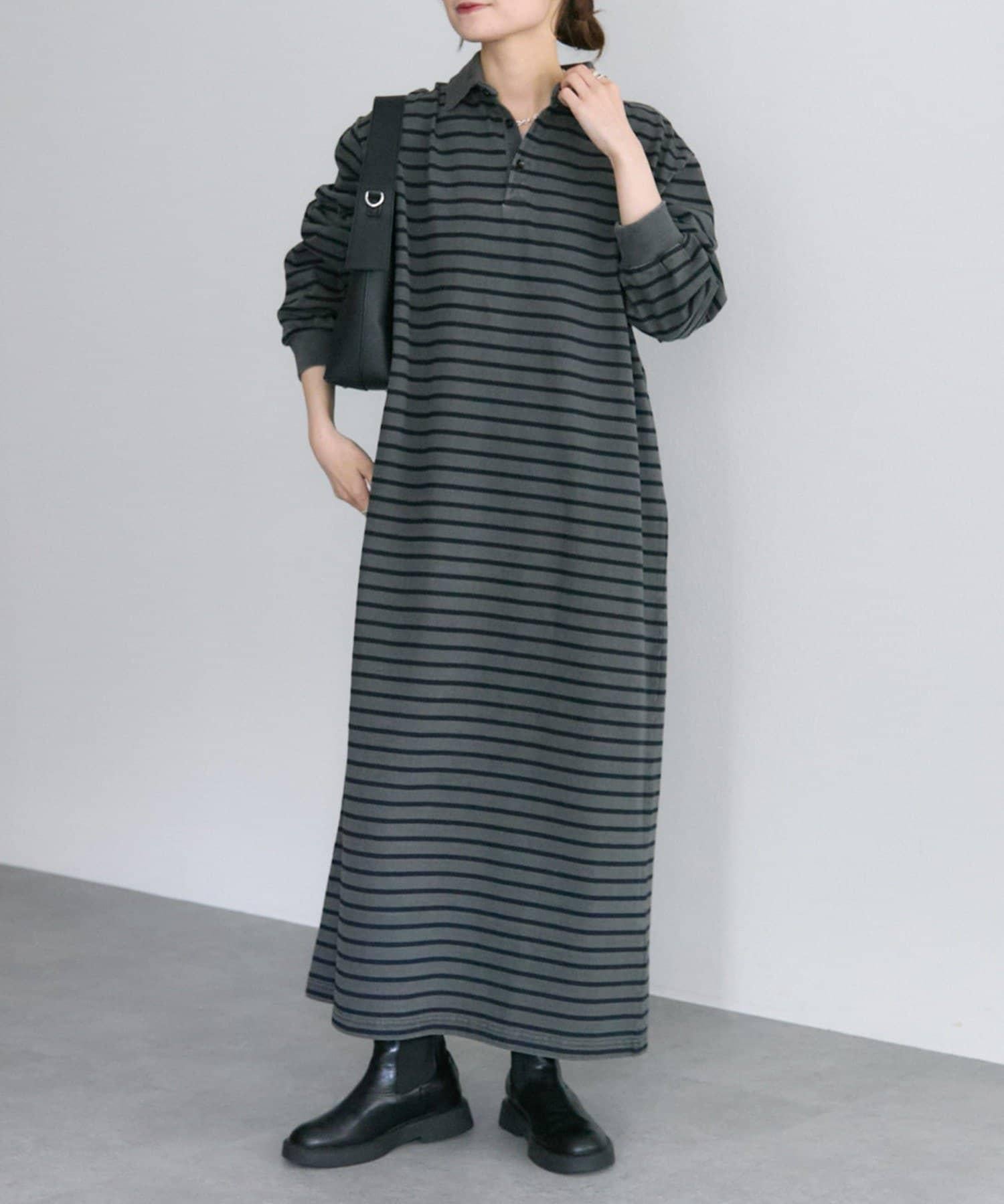 類似 Polo 衫的堅固衣領收緊了整體造型,為休閒邊飾連衣裙增添了整潔感。