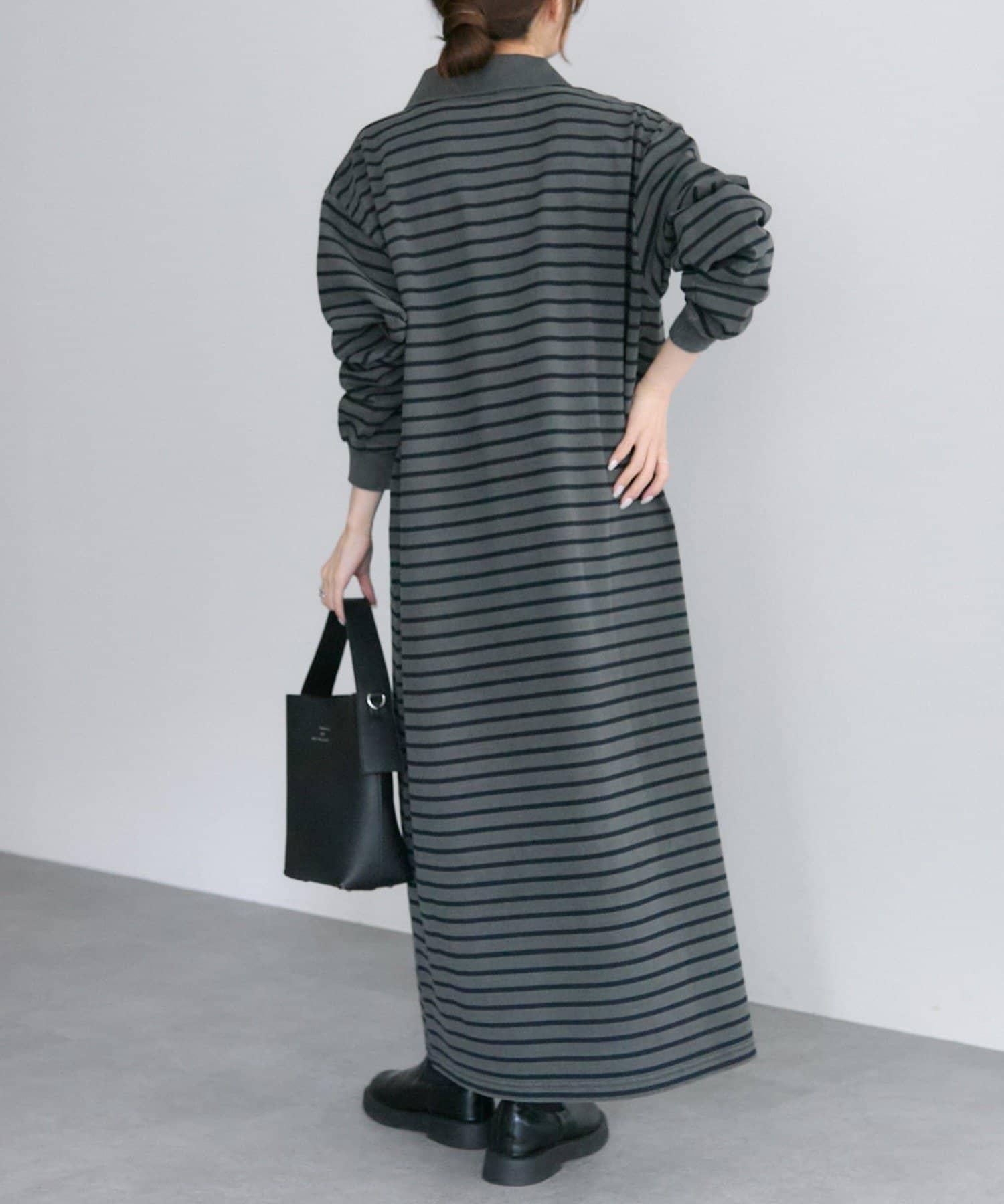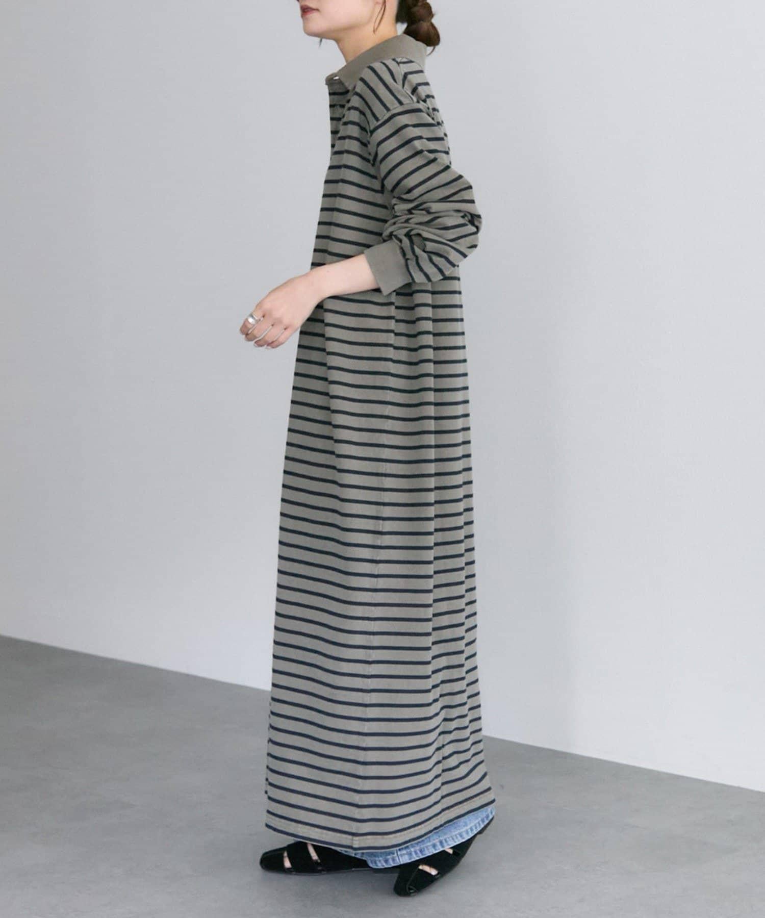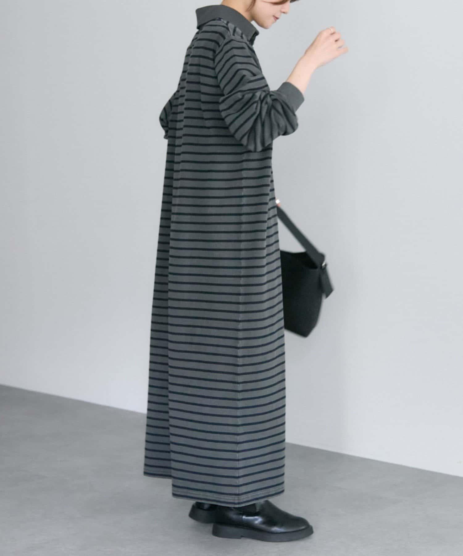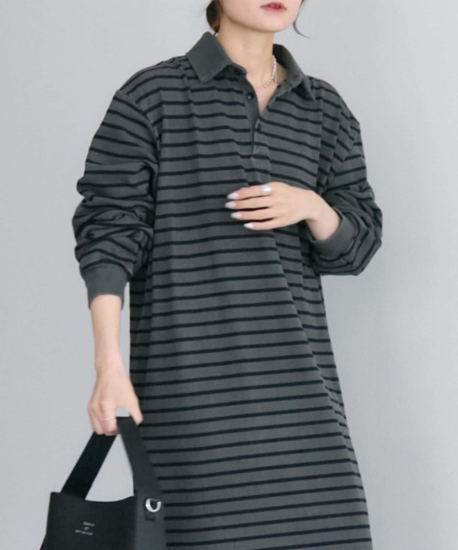 類似 Polo 衫的堅固衣領收緊了整體造型,為休閒邊飾連衣裙增添了整潔感。