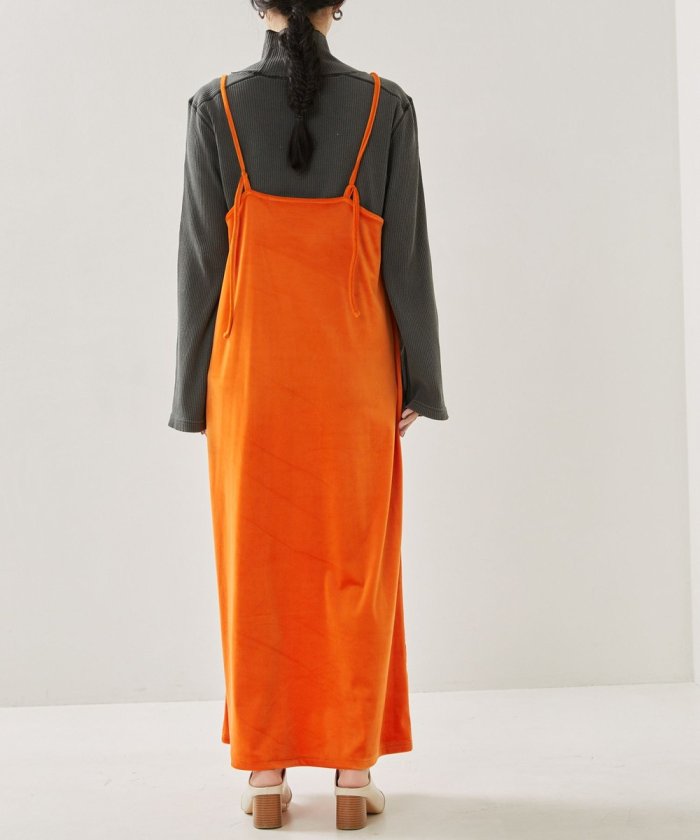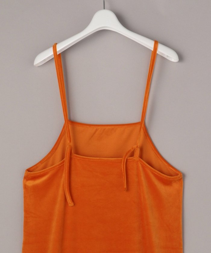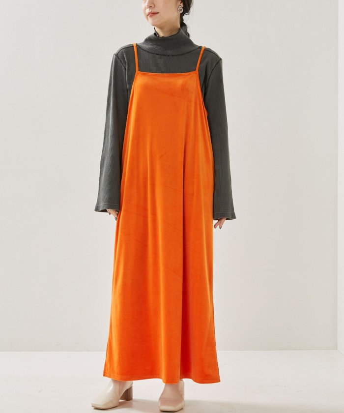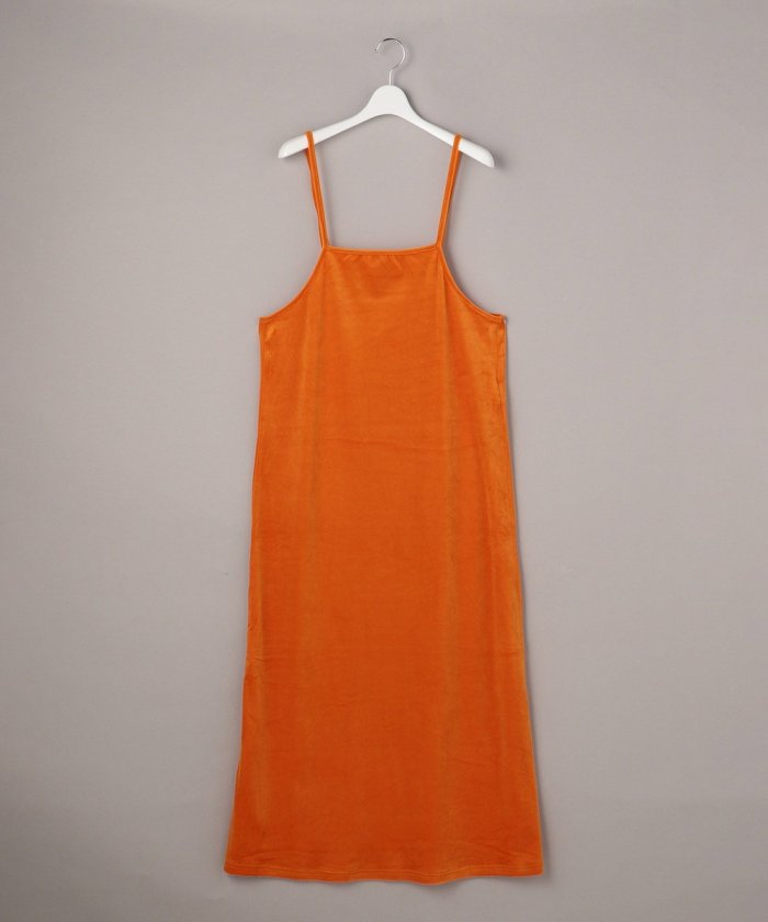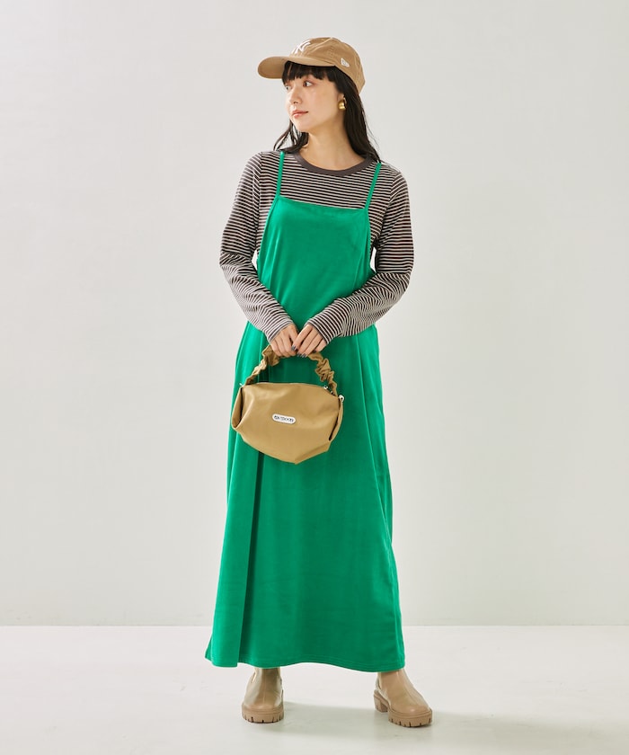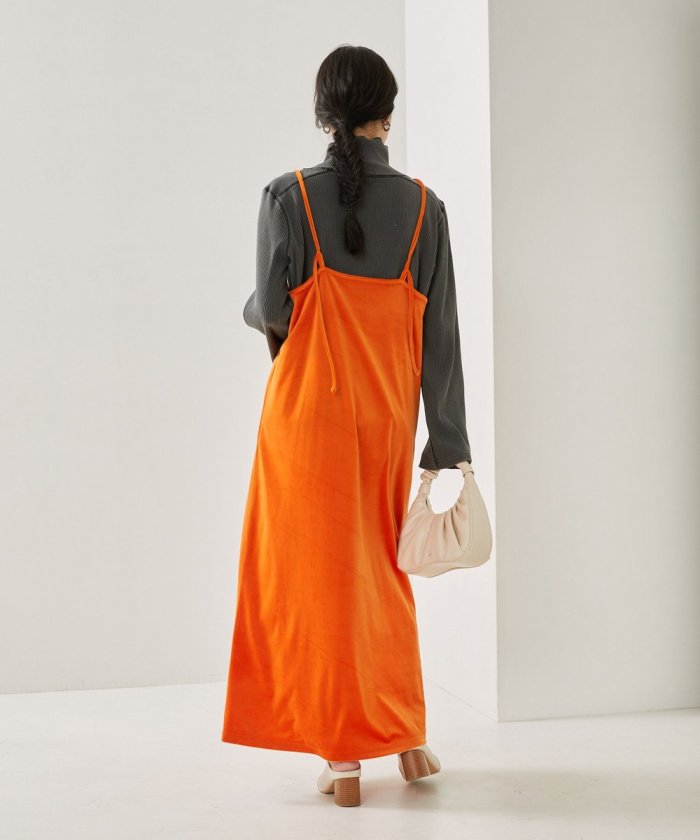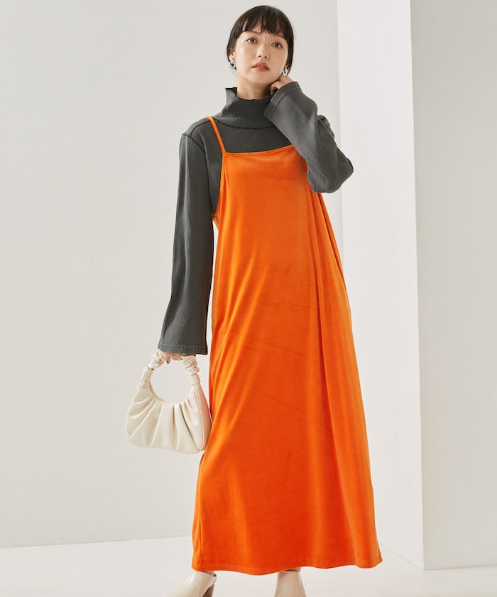 亮色絲絨吊帶連衣裙,給人一種成人休閒的印象。