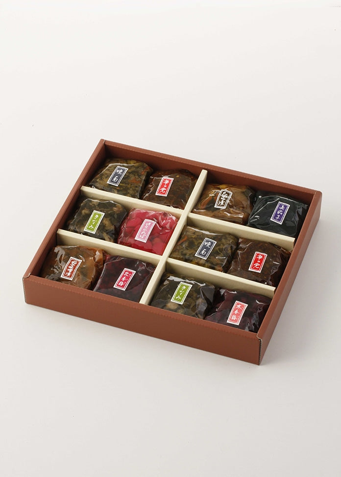 Essential Fuusyasai是一個由九種不同的醃菜組成的品種,包括晚菊,由Sanokuya選擇,特別注重顏色。