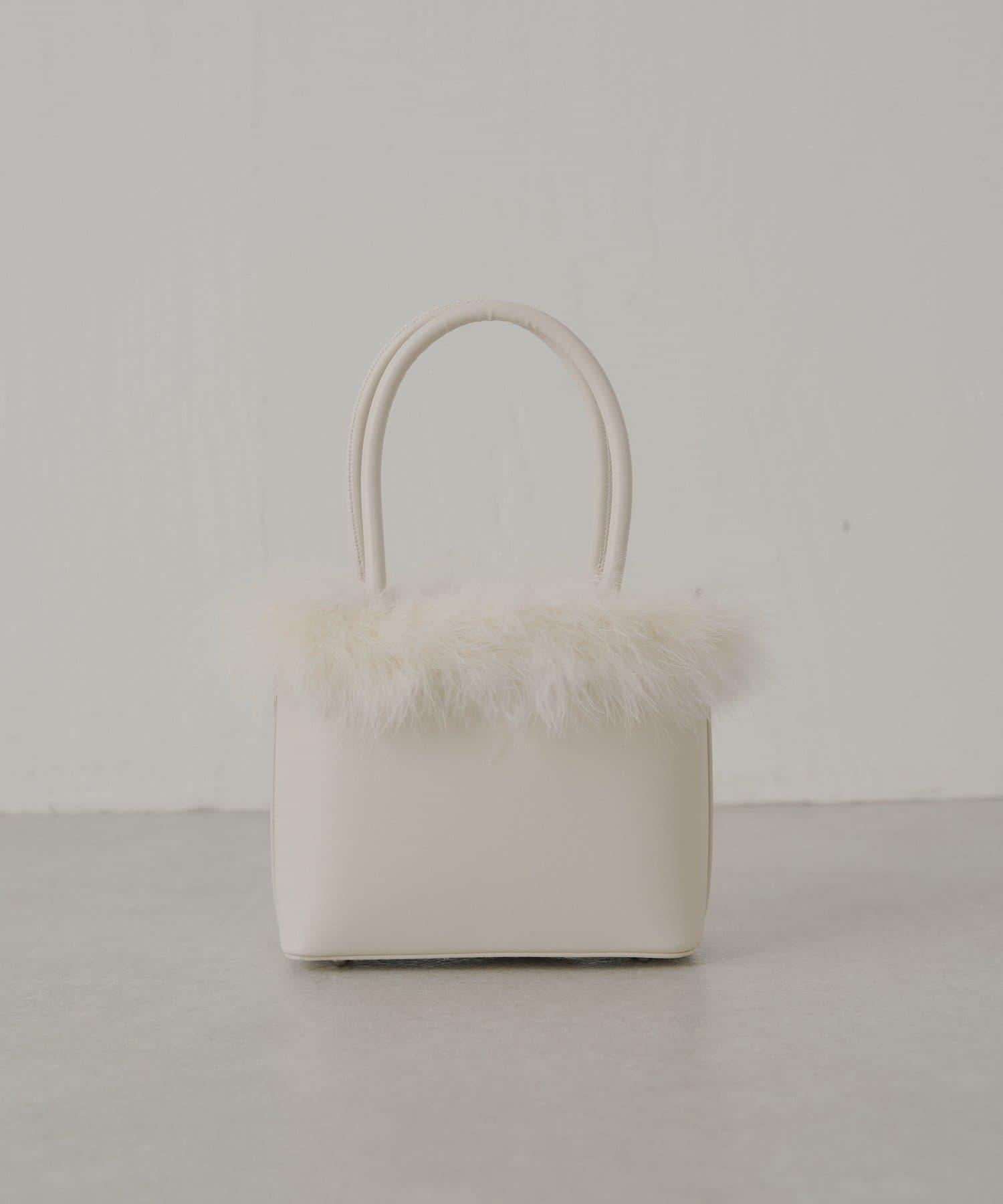 這款方形手袋飾有蓬鬆的毛邊。