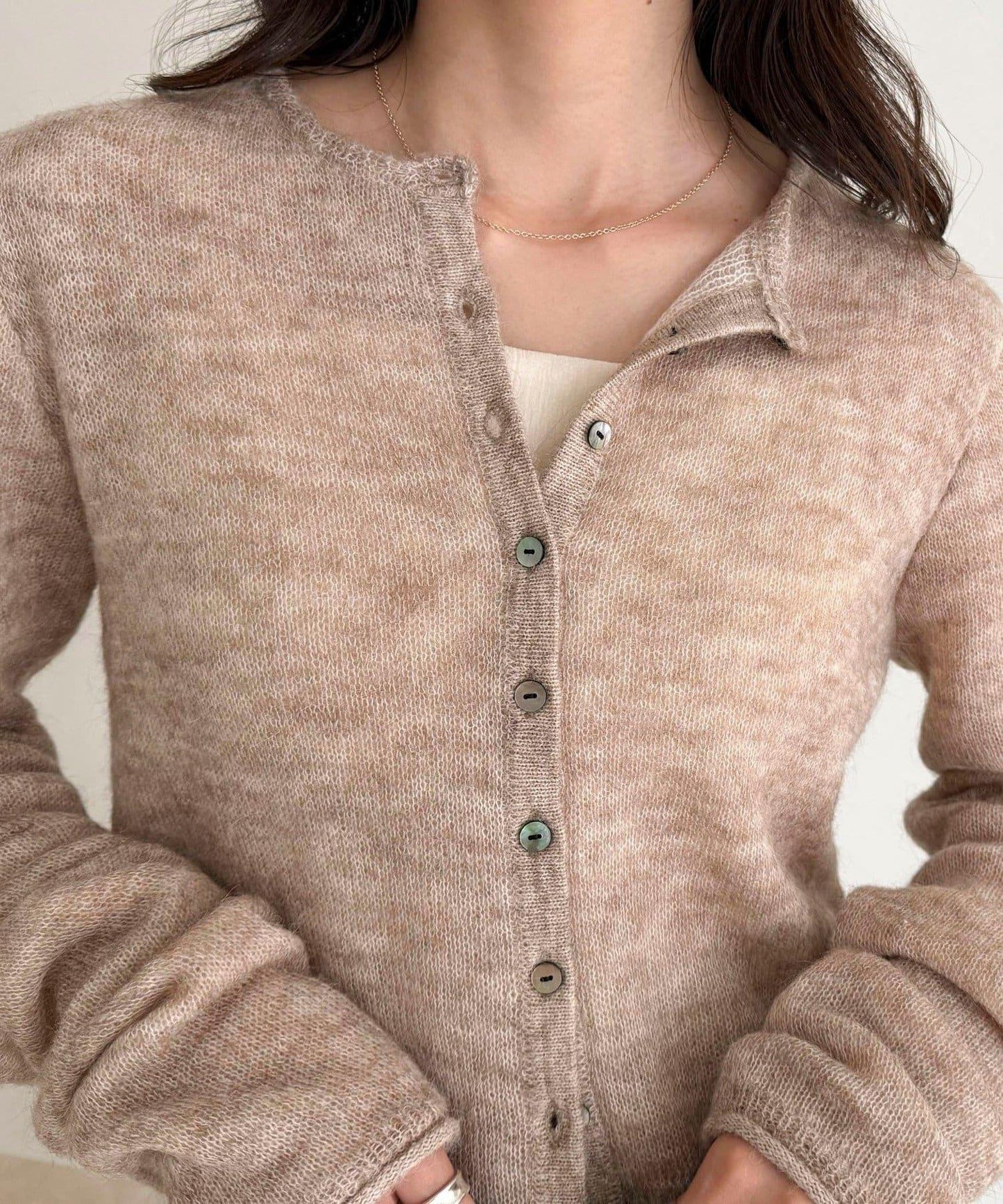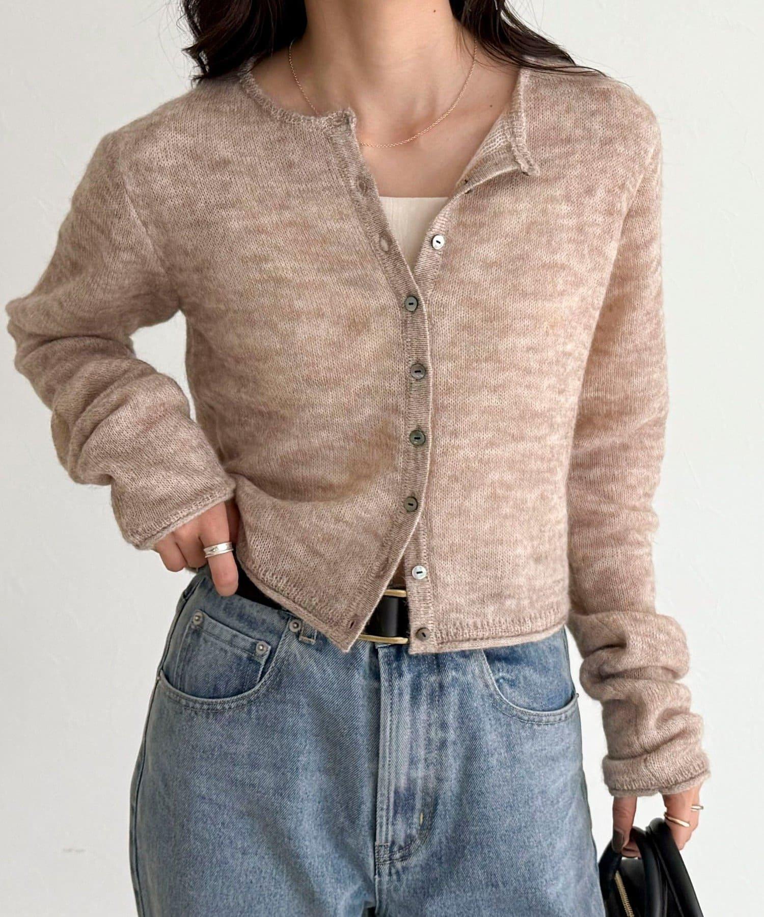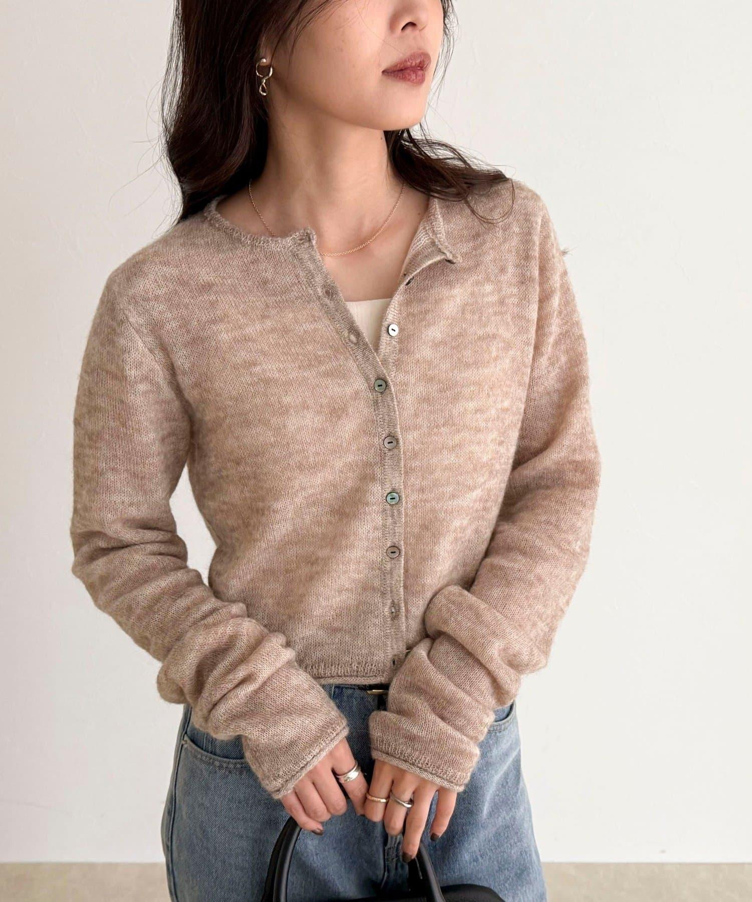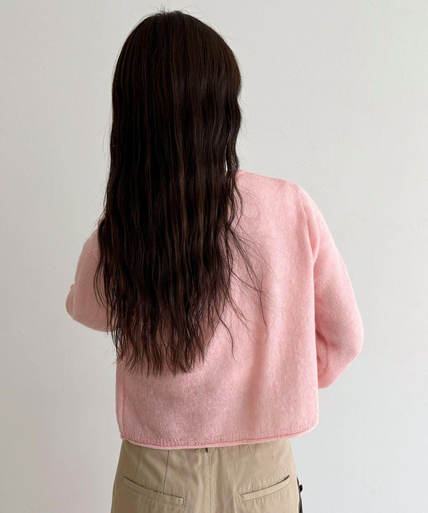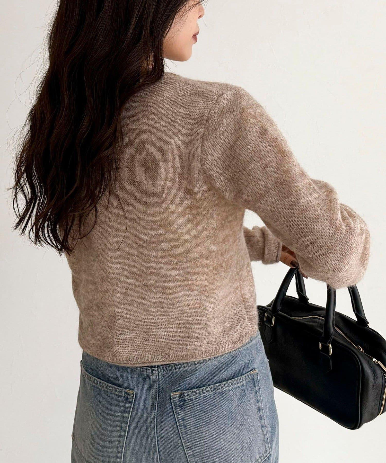這款開衫採用馬海毛混紡面料特有的蓬鬆材質。