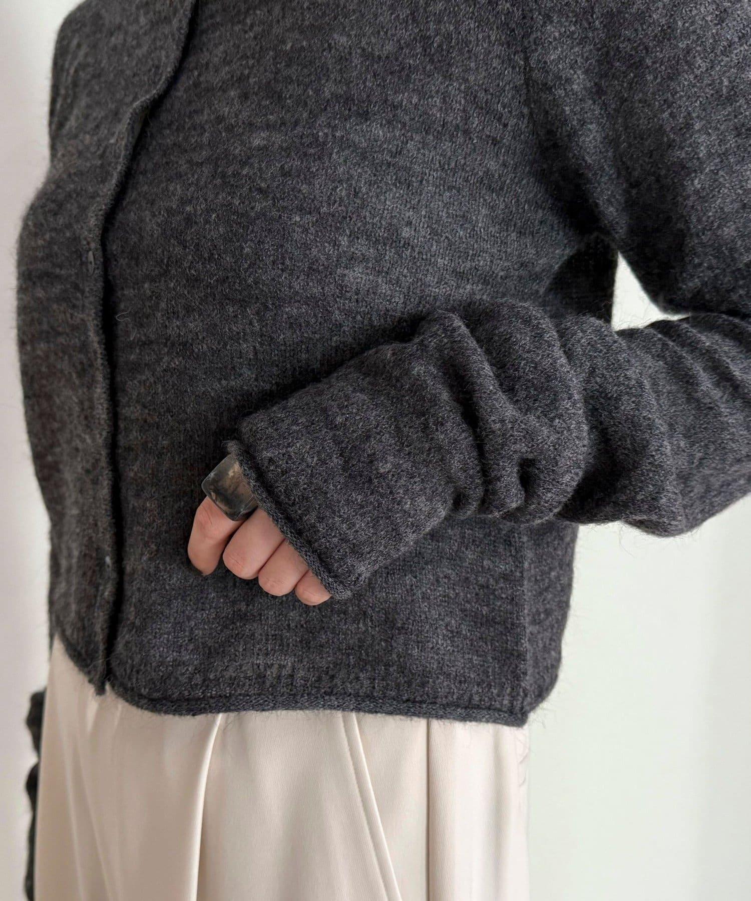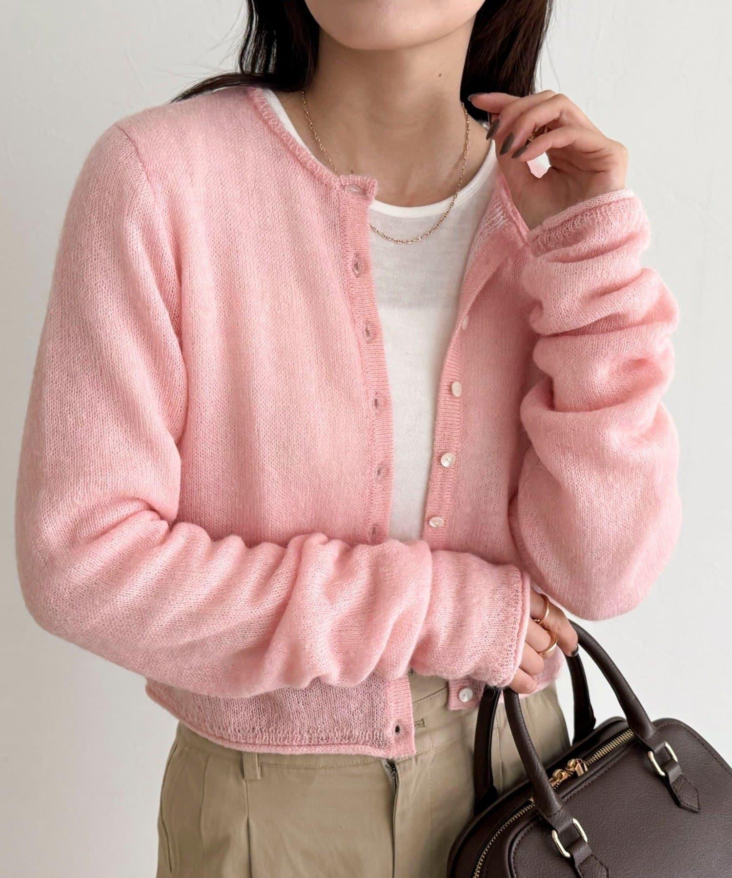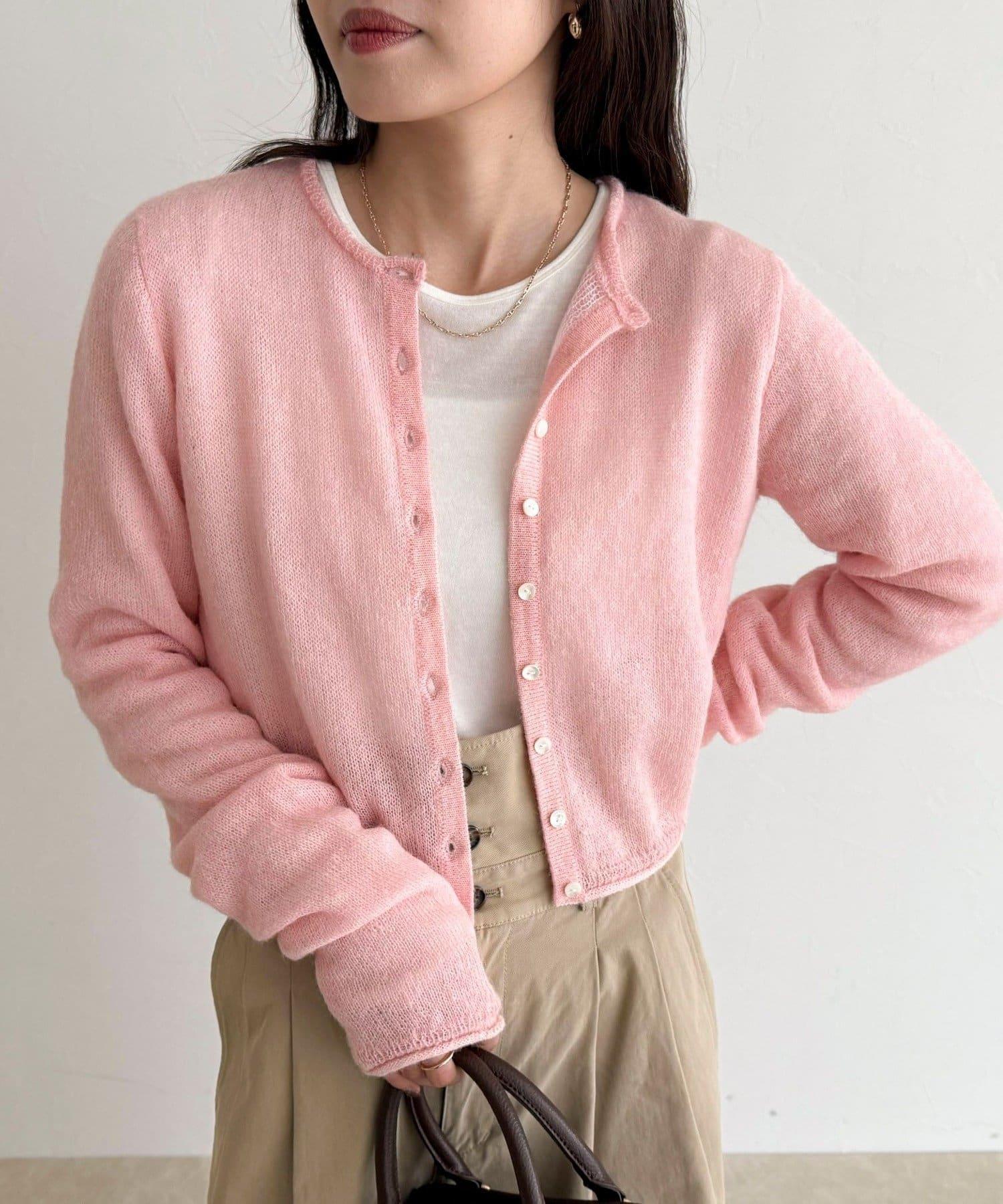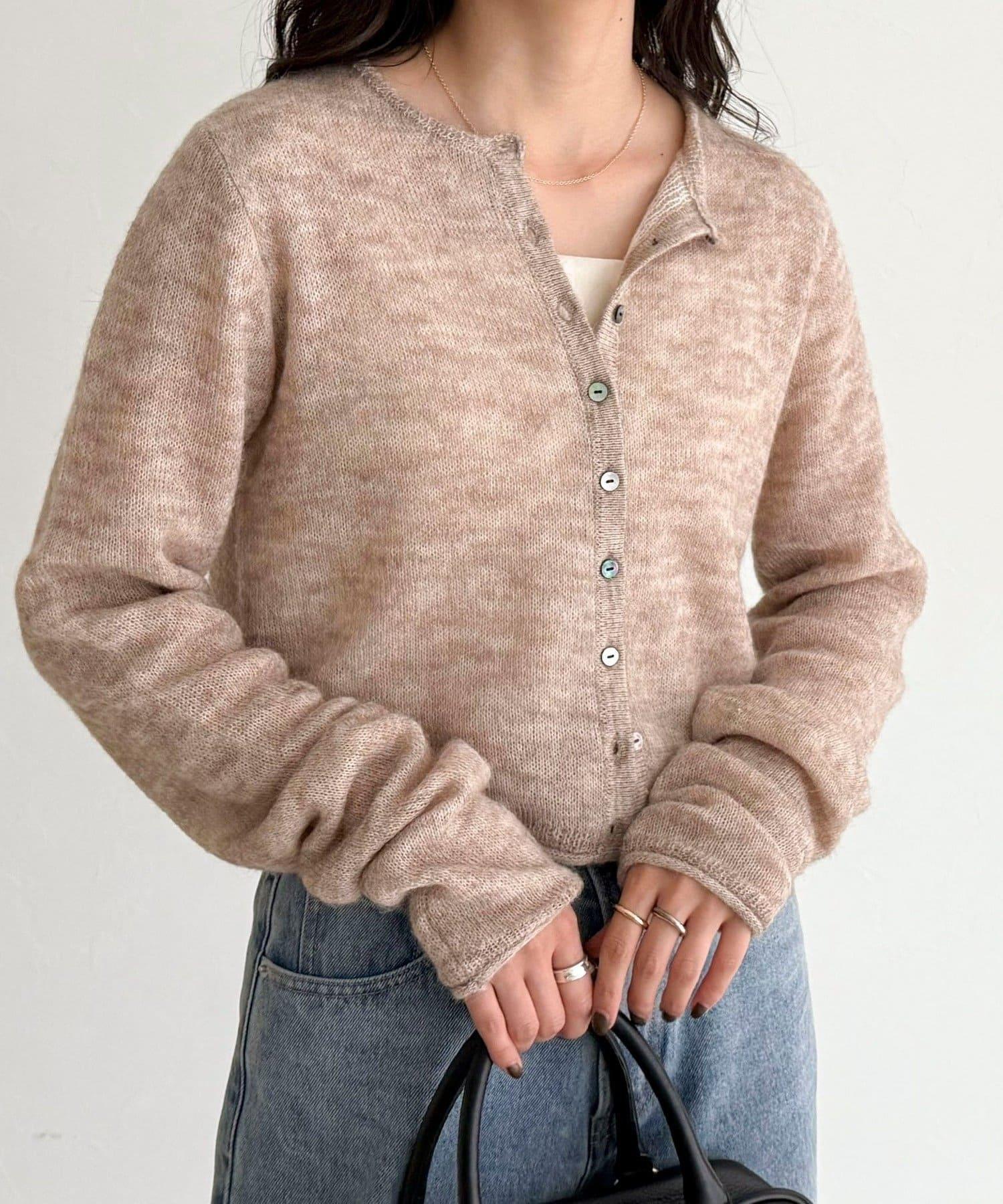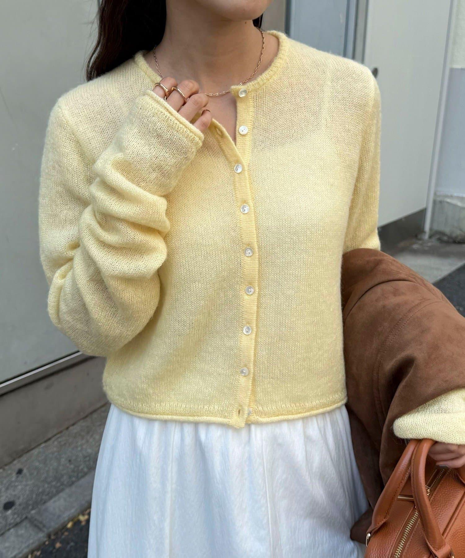 這款開衫採用馬海毛混紡面料特有的蓬鬆材質。