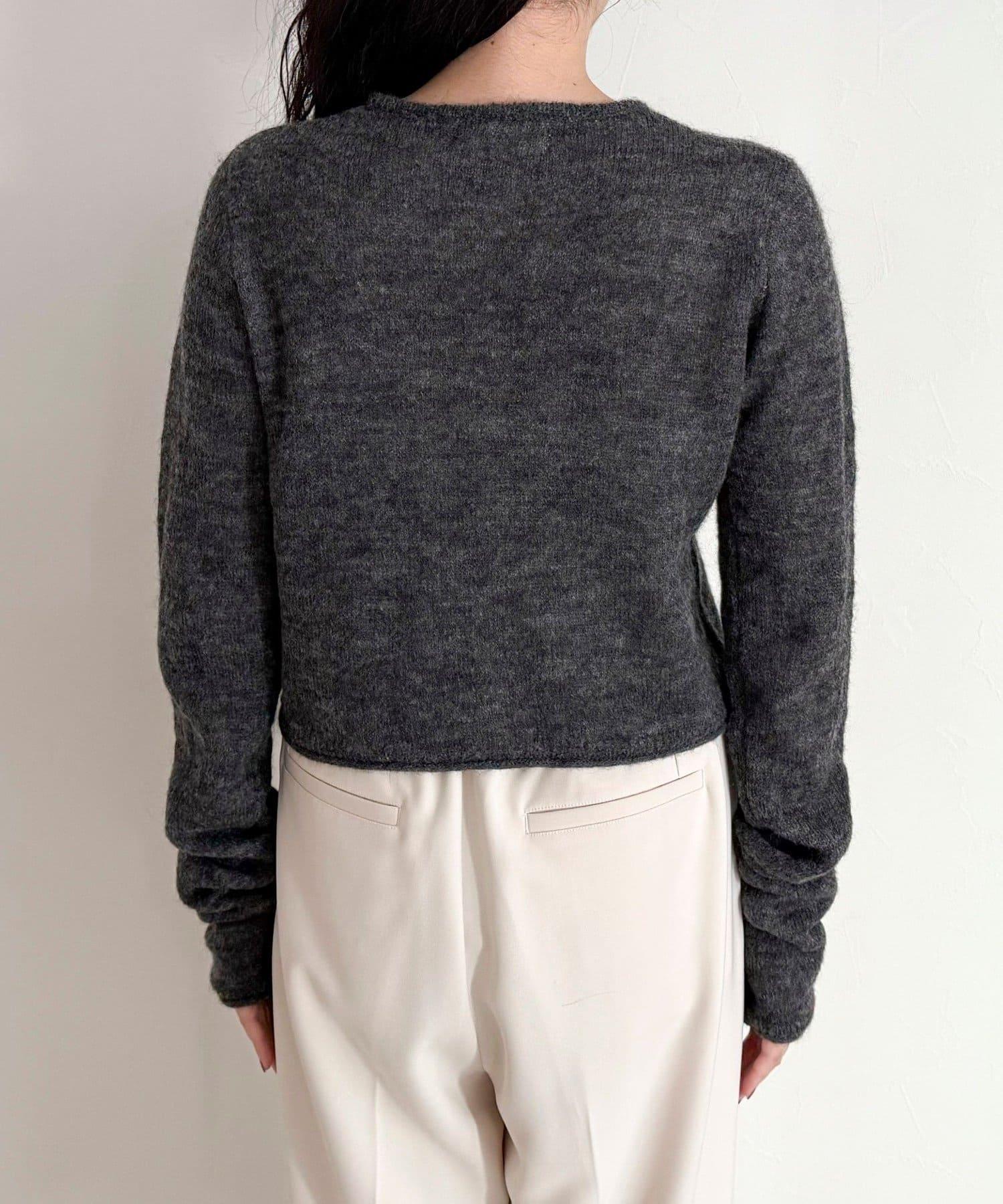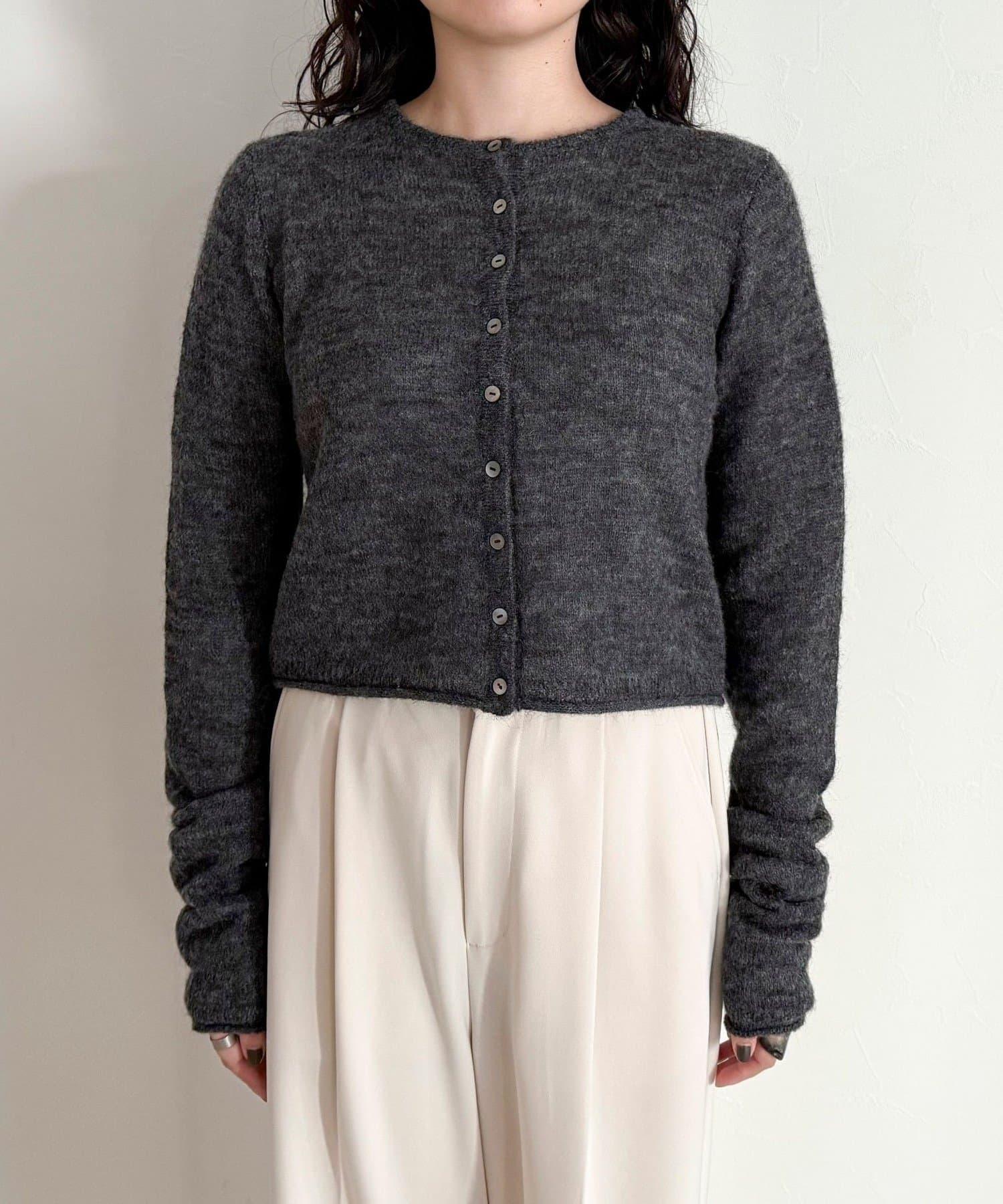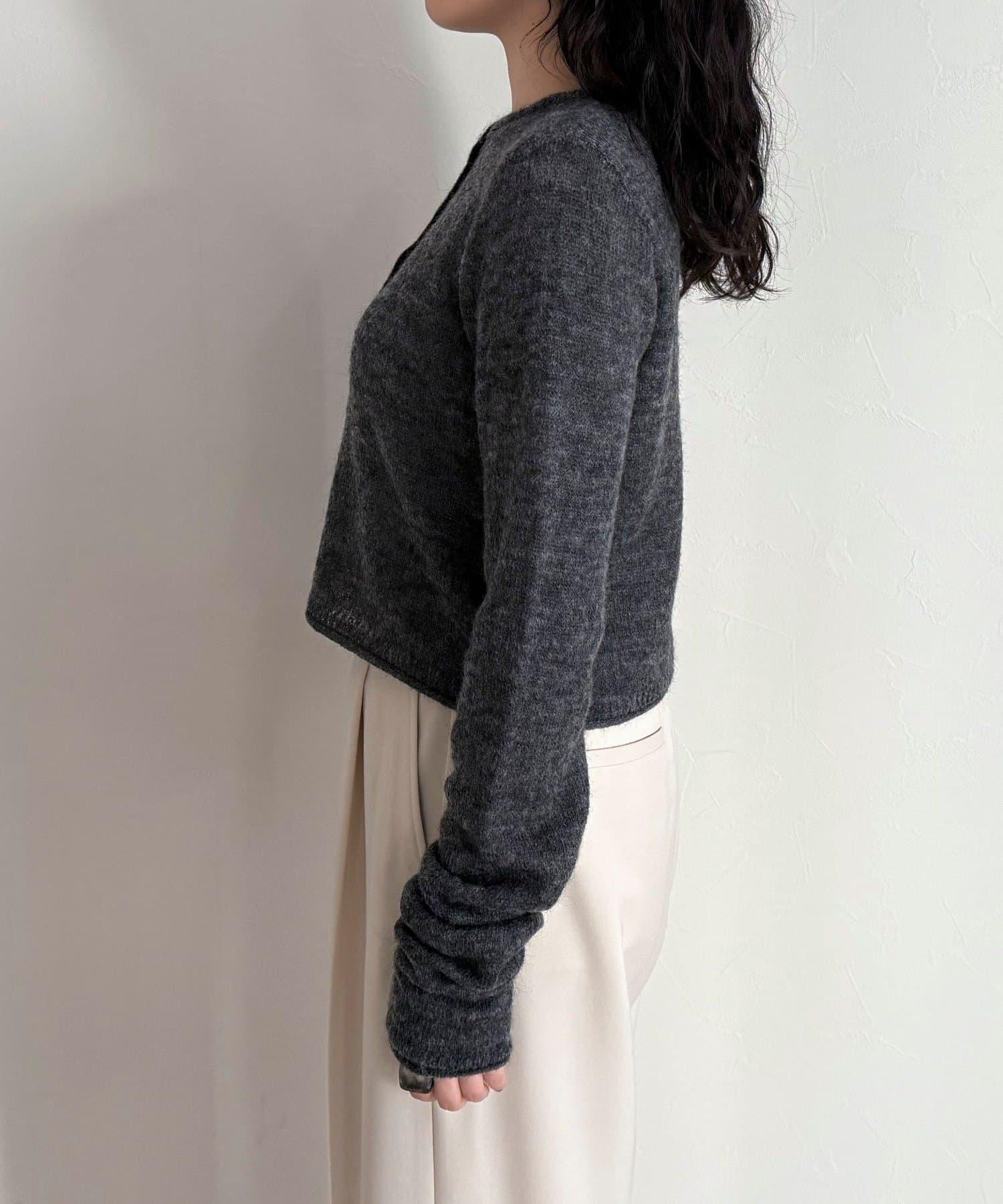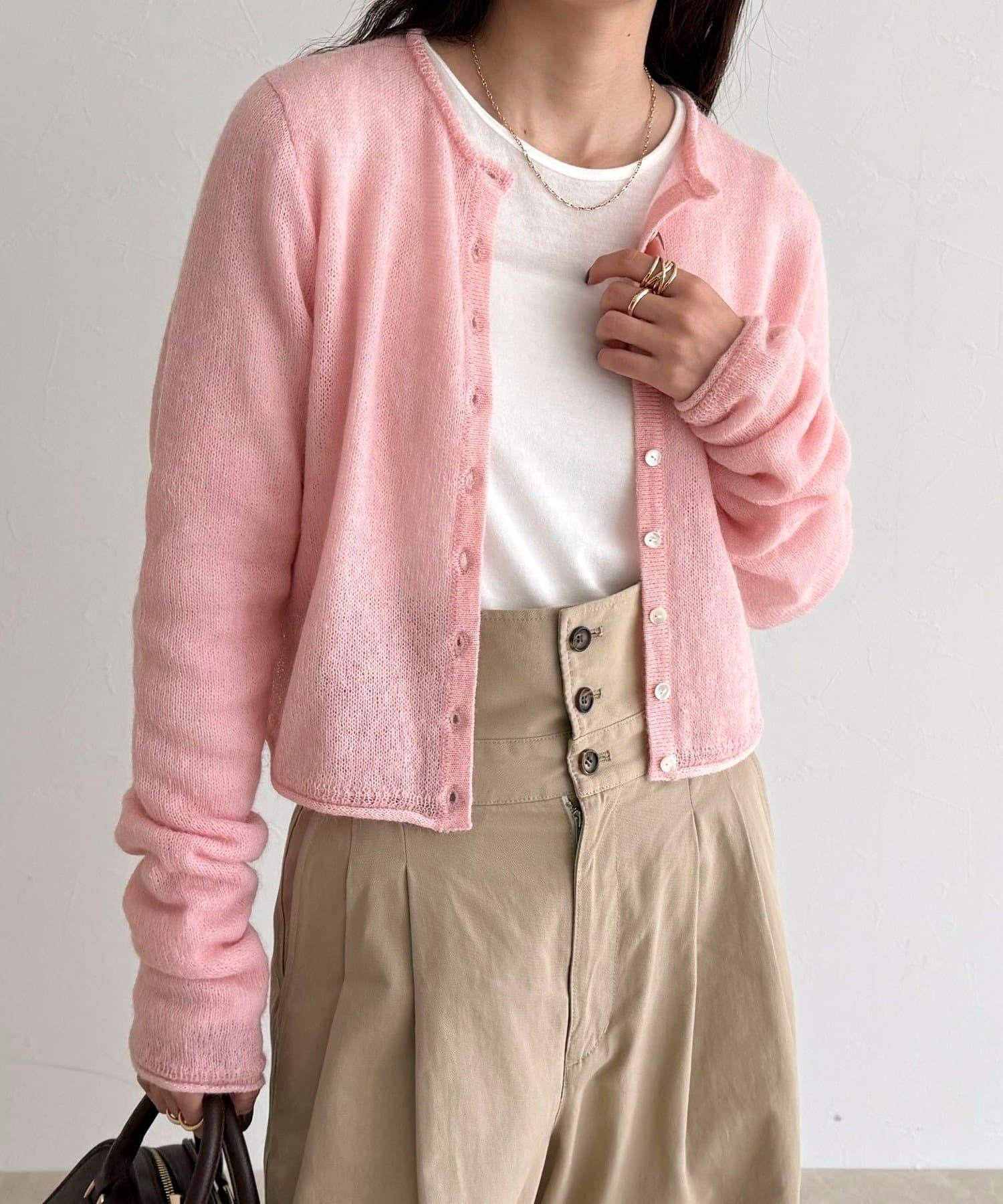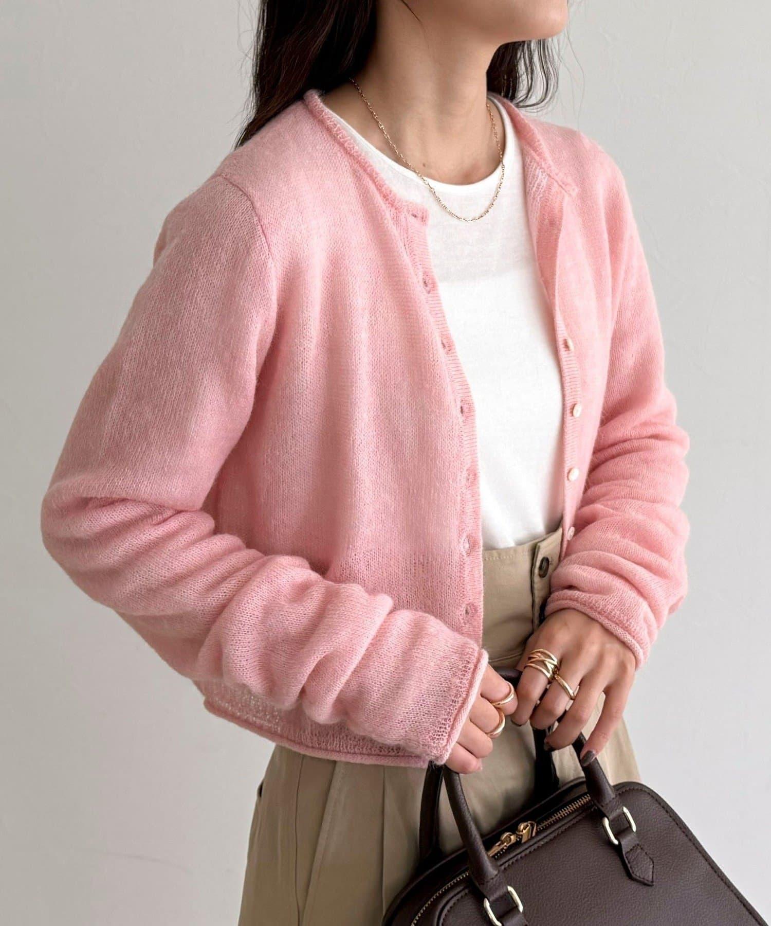 這款開衫採用馬海毛混紡面料特有的蓬鬆材質。