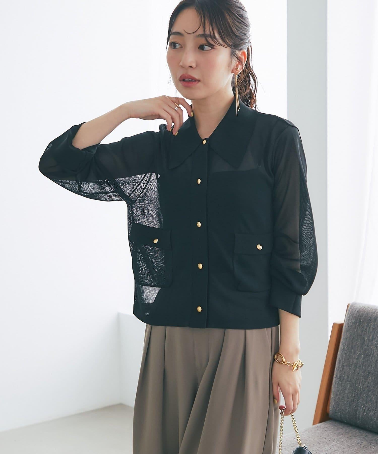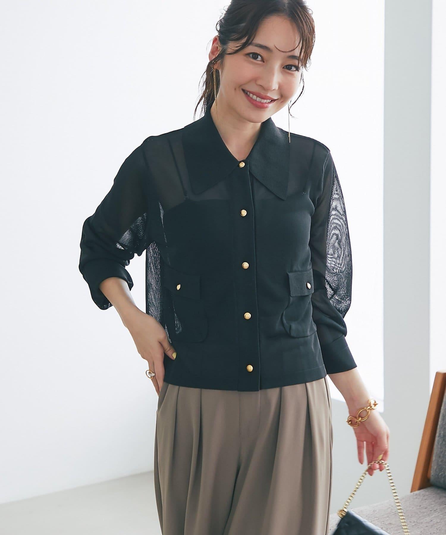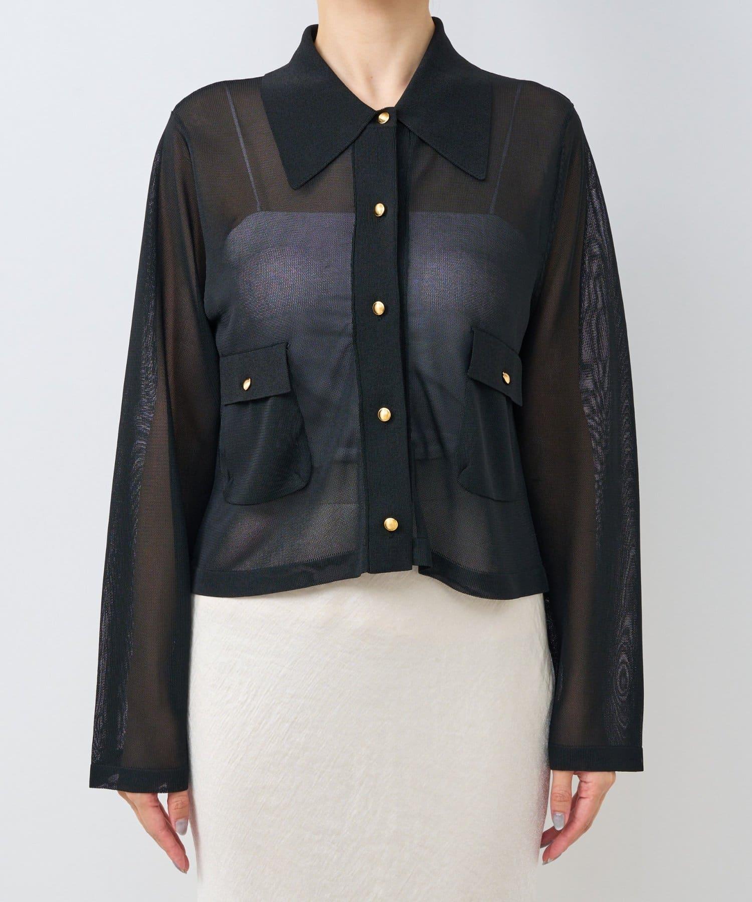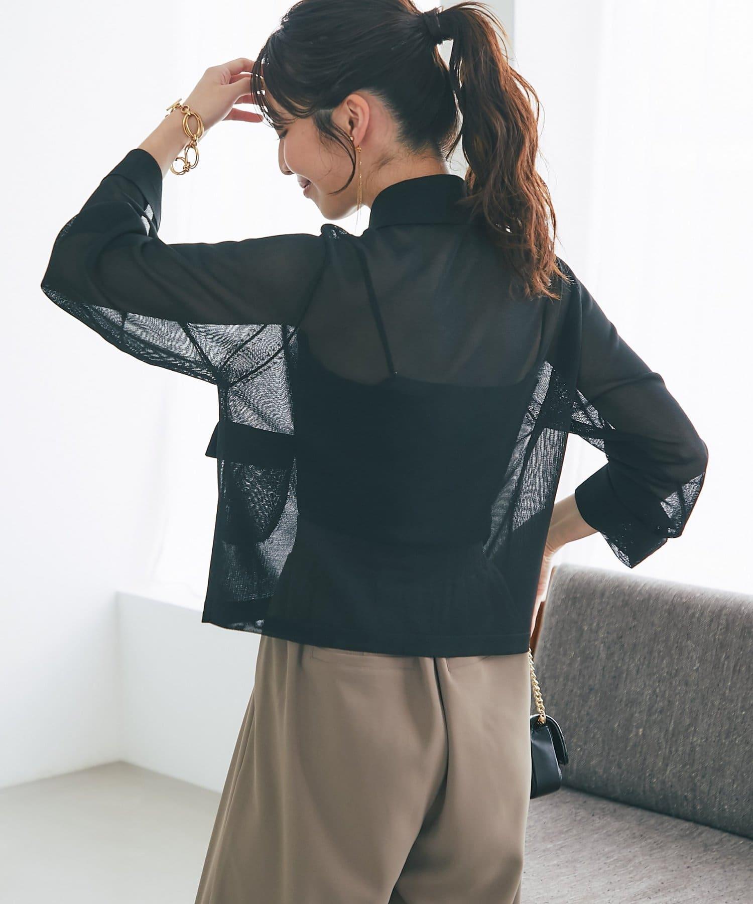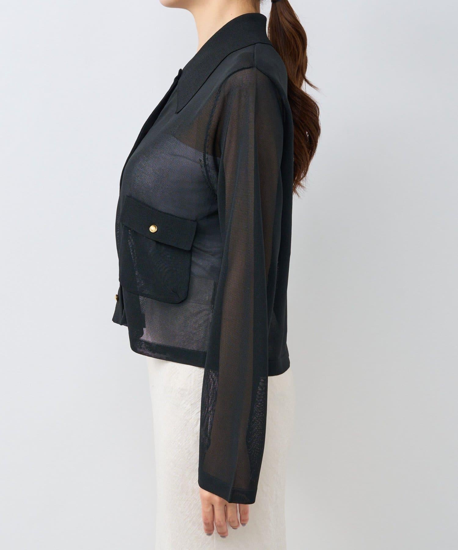 這款襯衫夾克採用透視質感的薄紗面料,給人一種時尚的感覺。