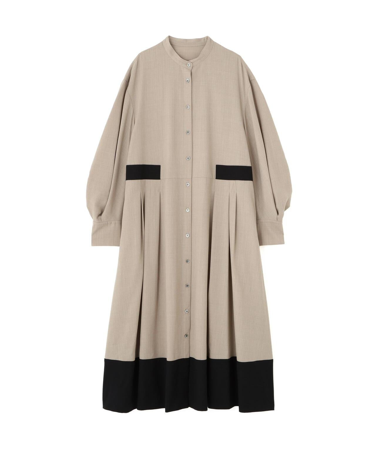 米色和黑色對比色高捻斜紋連衣裙,配色沉穩。腰部和下襬部分採用不同的黑色面料。立體的袖子設計讓這款連衣裙優雅而不簡單。斜紋面料裁剪,落差適中,彈性適中,由輕質聚酯纖維和羊毛蓬鬆混合製成。