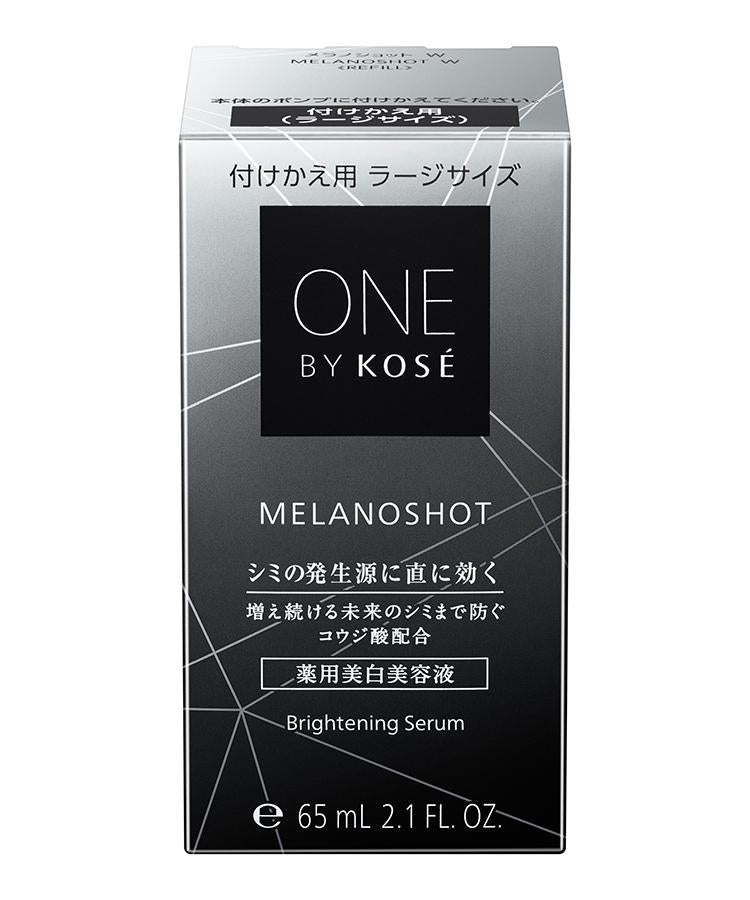 針對色斑核心的曲酸美白 _x000D_防止今後色斑繼續增加_x000D_[準藥物]_x000D__x000D_ <活性美白成分>曲酸 _x000D_*色斑的核心是黑色素細胞 _x000D_*抑制黑色素生成,防止色斑和雀斑。直接作用於色斑的核心 _x000D_一款美白精華,甚至能防止今後色斑繼續增加(抑制黑色素生成,防止色斑和雀斑)。_x000D__x000D__x000D__利用世界首創技術對斑點進行廣泛分析後揭示的事實。__x000D_在皮膚深處,色斑正在一個接一個地增加。__x000D_迅速滲透,直接作用於色斑源頭。_x000D_ 為您的肌膚帶來永恆不變的透明感。_x000D__x000D_○輕鬆怡人的綠色花香 _x000D__x000D__[注意事項]_x000D_◇請按照說明使用。避免大量頻繁使用。_x000D_◇泵口或瓶蓋上的血清遇光或空氣可能會略微變黑,但不會造成質量問題。_x000D_◇ 使用後,請將泵口擦拭乾淨,並正確蓋上蓋子。_x000D_◇ 請勿在高溫或陽光下存放。_x000D__x000D__x000D__<美白活性成分>曲酸_x000D_*皮膚色斑的核心是黑色素細胞_x000D_*它能抑制黑色素生成,預防色斑和雀斑。_x000D_*可滲透至角質層_x000D_*世界上首次用熒光觀察人體皮膚中的黑色素。_x000D__x000D_▽容器兼容性_x000D_Melanoshot W 的普通型和大型容器兼容。_x000D_普通尺寸和大尺寸可以互換使用。_x000D_兩種規格的 "瓶蓋、泵和軟管長度 "相同。使用說明取適量於掌心,塗抹於皮膚上。